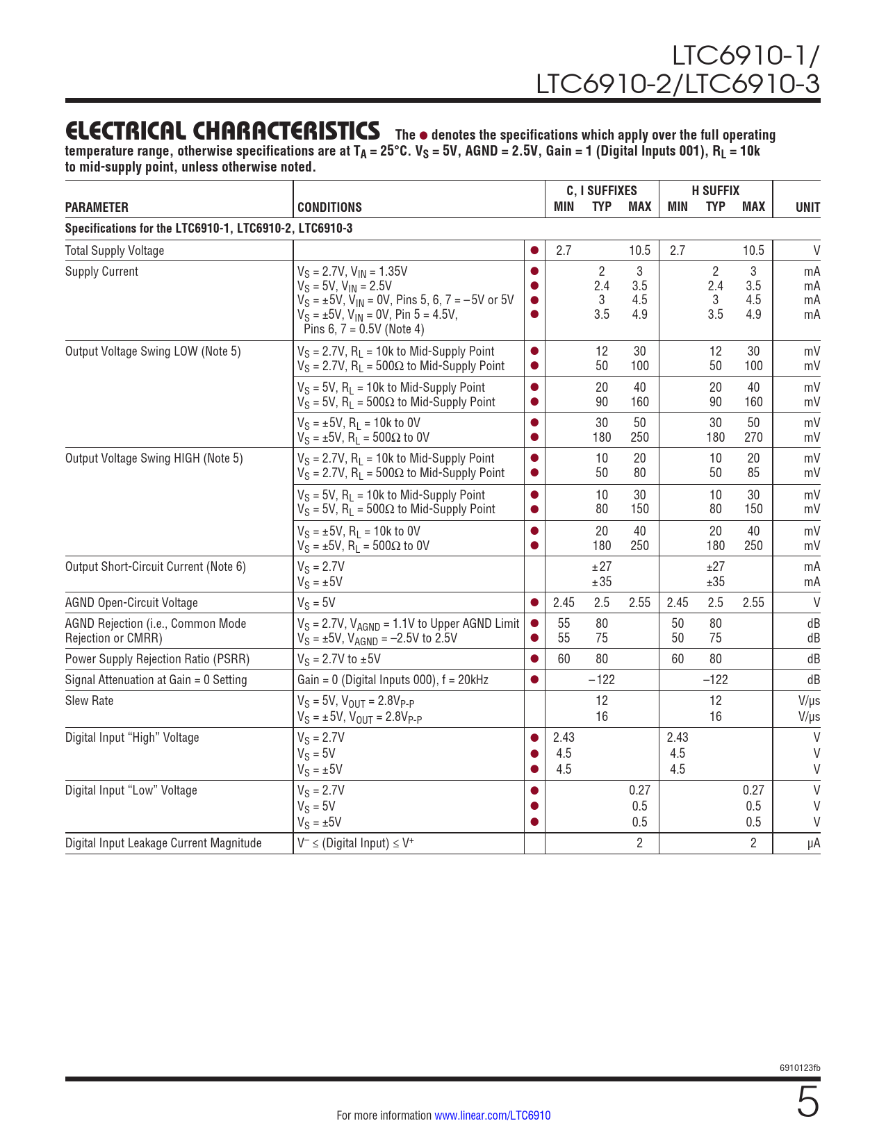 denotes the specifications which apply over the full operating temperature range, otherwise specifications are at TA = 25°C. VS = 5V, AGND = 2.5V, Gain = 1 (Digital Inputs 001), RL = 10k to mid-supply point, unless otherwise noted. C, I SUFFIXES H SUFFIX PARAMETER CONDITIONS MIN TYP MAX MIN TYP MAX UNIT Specifications for the LTC6910-1, LTC6910-2, LTC6910-3
