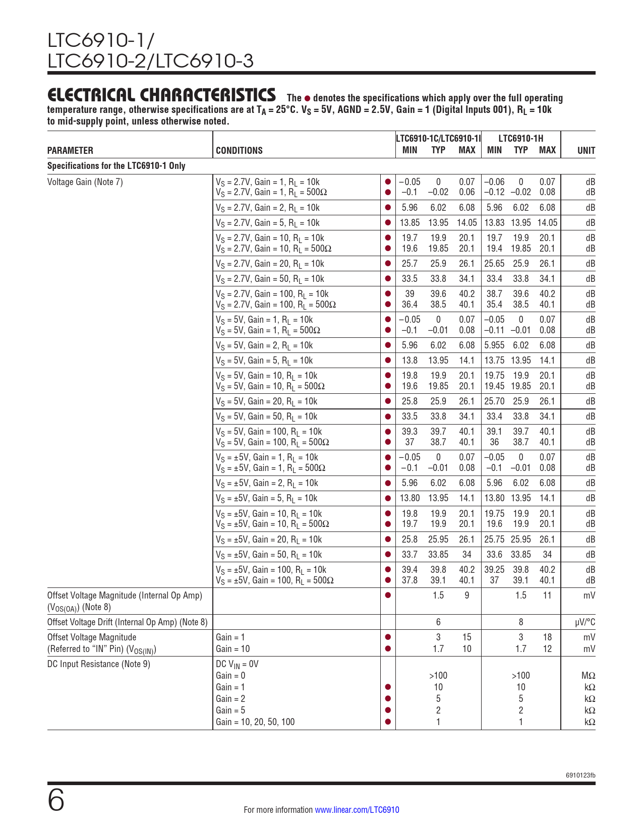 denotes the specifications which apply over the full operating temperature range, otherwise specifications are at TA = 25°C. VS = 5V, AGND = 2.5V, Gain = 1 (Digital Inputs 001), RL = 10k to mid-supply point, unless otherwise noted. LTC6910-1C/LTC6910-1I LTC6910-1H PARAMETER CONDITIONS MIN TYP MAX MIN TYP MAX UNIT Specifications for the LTC6910-1 Only
