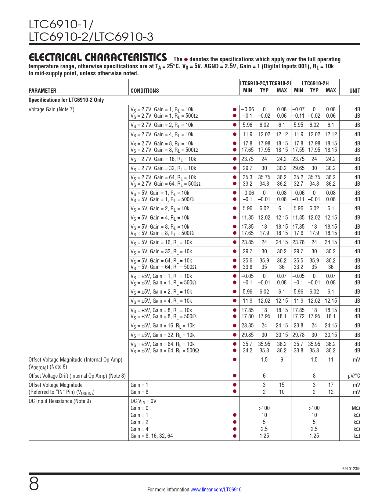 LTC6910-1/ LTC6910-2/LTC6910-3 elecTrical characTerisTicsThe l denotes the specifications which apply over the full operatingtemperature range, otherwise specifications are at TA = 25°C. VS = 5V, AGND = 2.5V, Gain = 1 (Digital Inputs 001), RL = 10kto mid-supply point, unless otherwise noted.LTC6910-2C/LTC6910-2ILTC6910-2HPARAMETERCONDITIONSMINTYPMAX MIN TYPMAXUNITSpecifications for LTC6910-2 Only Voltage Gain (Note 7) VS = 2.7V, Gain = 1, RL = 10k l – 0.06 0 0.08 –0.07 0 0.08 dB VS = 2.7V, Gain = 1, RL = 500Ω l –0.1 –0.02 0.06 –0.11 –0.02 0.06 dB VS = 2.7V, Gain = 2, RL = 10k l 5.96 6.02 6.1 5.95 6.02 6.1 dB VS = 2.7V, Gain = 4, RL = 10k l 11.9 12.02 12.12 11.9 12.02 12.12 dB VS = 2.7V, Gain = 8, RL = 10k l 17.8 17.98 18.15 17.8 17.98 18.15 dB VS = 2.7V, Gain = 8, RL = 500Ω l 17.65 17.95 18.15 17.55 17.95 18.15 dB VS = 2.7V, Gain = 16, RL = 10k l 23.75 24 24.2 23.75 24 24.2 dB VS = 2.7V, Gain = 32, RL = 10k l 29.7 30 30.2 29.65 30 30.2 dB VS = 2.7V, Gain = 64, RL = 10k l 35.3 35.75 36.2 35.2 35.75 36.2 dB VS = 2.7V, Gain = 64, RL = 500Ω l 33.2 34.8 36.2 32.7 34.8 36.2 dB VS = 5V, Gain = 1, RL = 10k l – 0.06 0 0.08 –0.06 0 0.08 dB VS = 5V, Gain = 1, RL = 500Ω l –0.1 –0.01 0.08 –0.11 –0.01 0.08 dB VS = 5V, Gain = 2, RL = 10k l 5.96 6.02 6.1 5.96 6.02 6.1 dB VS = 5V, Gain = 4, RL = 10k l 11.85 12.02 12.15 11.85 12.02 12.15 dB VS = 5V, Gain = 8, RL = 10k l 17.85 18 18.15 17.85 18 18.15 dB VS = 5V, Gain = 8, RL = 500Ω l 17.65 17.9 18.15 17.6 17.9 18.15 dB VS = 5V, Gain = 16, RL = 10k l 23.85 24 24.15 23.78 24 24.15 dB VS = 5V, Gain = 32, RL = 10k l 29.7 30 30.2 29.7 30 30.2 dB VS = 5V, Gain = 64, RL = 10k l 35.6 35.9 36.2 35.5 35.9 36.2 dB VS = 5V, Gain = 64, RL = 500Ω l 33.8 35 36 33.2 35 36 dB VS = ±5V, Gain = 1, RL = 10k l –0.05 0 0.07 –0.05 0 0.07 dB VS = ±5V, Gain = 1, RL = 500Ω l –0.1 –0.01 0.08 –0.1 –0.01 0.08 dB VS = ±5V, Gain = 2, RL = 10k l 5.96 6.02 6.1 5.96 6.02 6.1 dB VS = ±5V, Gain = 4, RL = 10k l 11.9 12.02 12.15 11.9 12.02 12.15 dB VS = ±5V, Gain = 8, RL = 10k l 17.85 18 18.15 17.85 18 18.15 dB VS = ±5V, Gain = 8, RL = 500Ω l 17.80 17.95 18.1 17.72 17.95 18.1 dB VS = ±5V, Gain = 16, RL = 10k l 23.85 24 24.15 23.8 24 24.15 dB VS = ±5V, Gain = 32, RL = 10k l 29.85 30 30.15 29.78 30 30.15 dB VS = ±5V, Gain = 64, RL = 10k l 35.7 35.95 36.2 35.7 35.95 36.2 dB VS = ±5V, Gain = 64, RL = 500Ω l 34.2 35.3 36.2 33.8 35.3 36.2 dB Offset Voltage Magnitude (Internal Op Amp) l 1.5 9 1.5 11 mV (VOS(OA)) (Note 8) Offset Voltage Drift (Internal Op Amp) (Note 8) l 6 8 µV/°C Offset Voltage Magnitude Gain = 1 l 3 15 3 17 mV (Referred to “IN” Pin) (VOS(IN)) Gain = 8 l 2 10 2 12 mV DC Input Resistance (Note 9) DC VIN = 0V Gain = 0 >100 >100 MΩ Gain = 1 l 10 10 kΩ Gain = 2 l 5 5 kΩ Gain = 4 l 2.5 2.5 kΩ Gain = 8, 16, 32, 64 l 1.25 1.25 kΩ 6910123fb 8 For more information www.linear.com/LTC6910 Document Outline Features Applications Typical Application Description Absolute Maximum Ratings Order Information Pin Configuration Gain Settings and Properties Electrical Characteristics Typical Performance Characteristics Pin Functions Applications Information Package Description Revision History Typical Application Related Parts