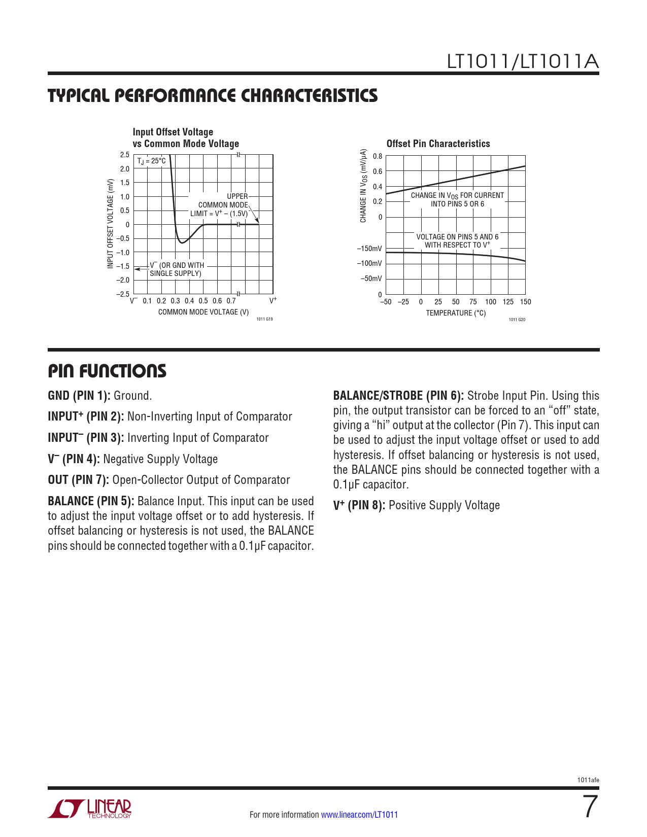 LT1011/LT1011A Typical perForMance characTerisTicsInput Offset Voltagevs Common Mode VoltageOffset Pin Characteristics 2.5 0.8 TJ = 25°C 2.0 (mV/µA) 0.6 1.5 OS 0.4 1.0 UPPER CHANGE IN VOS FOR CURRENT COMMON MODE 0.2 INTO PINS 5 OR 6 0.5 LIMIT = V+ – (1.5V) 0 0 CHANGE IN V –0.5 VOLTAGE ON PINS 5 AND 6 WITH RESPECT TO V+ –1.0 –150mV INPUT OFFSET VOLTAGE (mV) –1.5 V– (OR GND WITH –100mV SINGLE SUPPLY) –2.0 –50mV –2.5 0 V– 0.1 0.2 0.3 0.4 0.5 0.6 0.7 V+ –50 –25 0 25 50 75 100 125 150 COMMON MODE VOLTAGE (V) TEMPERATURE (°C) 1011 G19 1011 G20 pin FuncTions GND (PIN 1): Ground. BALANCE/STROBE (PIN 6): Strobe Input Pin. Using this INPUT+ (PIN 2): Non-Inverting Input of Comparator pin, the output transistor can be forced to an “off” state, giving a “hi” output at the collector (Pin 7). This input can INPUT– (PIN 3): Inverting Input of Comparator be used to adjust the input voltage offset or used to add V– (PIN 4): Negative Supply Voltage hysteresis. If offset balancing or hysteresis is not used, the BALANCE pins should be connected together with a OUT (PIN 7): Open-Collector Output of Comparator 0.1µF capacitor. BALANCE (PIN 5): Balance Input. This input can be used V+ (PIN 8): Positive Supply Voltage to adjust the input voltage offset or to add hysteresis. If offset balancing or hysteresis is not used, the BALANCE pins should be connected together with a 0.1µF capacitor. 1011afe For more information www.linear.com/LT1011 7 Document Outline Features Applications Description Typical Application Absolute Maximum Ratings Pin Configuration Order Information Electrical Characteristics Typical Performance Characteristics Pin Functions Applications Information Typical Applications Schematic Diagram Package Description Revision History Typical Application Related Parts