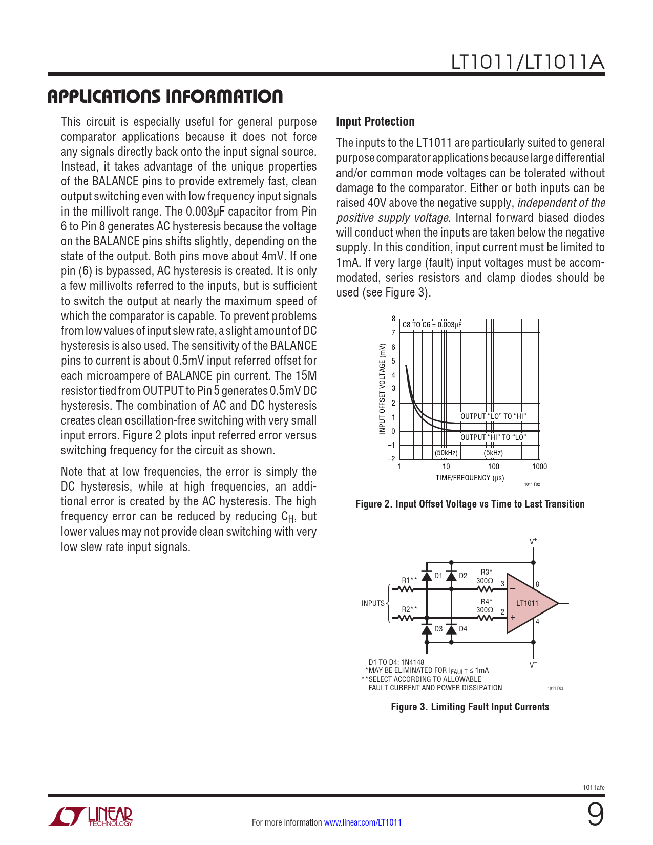 LT1011/LT1011A applicaTions inForMaTion This circuit is especially useful for general purpose Input Protection comparator applications because it does not force The inputs to the LT1011 are particularly suited to general any signals directly back onto the input signal source. purpose comparator applications because large differential Instead, it takes advantage of the unique properties and/or common mode voltages can be tolerated without of the BALANCE pins to provide extremely fast, clean damage to the comparator. Either or both inputs can be output switching even with low frequency input signals raised 40V above the negative supply, independent of the in the millivolt range. The 0.003µF capacitor from Pin positive supply voltage. Internal forward biased diodes 6 to Pin 8 generates AC hysteresis because the voltage will conduct when the inputs are taken below the negative on the BALANCE pins shifts slightly, depending on the supply. In this condition, input current must be limited to state of the output. Both pins move about 4mV. If one 1mA. If very large (fault) input voltages must be accom- pin (6) is bypassed, AC hysteresis is created. It is only modated, series resistors and clamp diodes should be a few millivolts referred to the inputs, but is sufficient used (see Figure 3). to switch the output at nearly the maximum speed of which the comparator is capable. To prevent problems 8 from low values of input slew rate, a slight amount of DC C8 TO C6 = 0.003µF 7 hysteresis is also used. The sensitivity of the BALANCE 6 pins to current is about 0.5mV input referred offset for 5 each microampere of BALANCE pin current. The 15M 4 resistor tied from OUTPUT to Pin 5 generates 0.5mV DC 3 hysteresis. The combination of AC and DC hysteresis 2 creates clean oscillation-free switching with very small 1 OUTPUT “LO” TO “HI” input errors. Figure 2 plots input referred error versus INPUT OFFSET VOLTAGE (mV) 0 OUTPUT “HI” TO “LO” switching frequency for the circuit as shown. –1 (50kHz) (5kHz) –2 Note that at low frequencies, the error is simply the 1 10 100 1000 TIME/FREQUENCY (µs) DC hysteresis, while at high frequencies, an addi- 1011 F02 tional error is created by the AC hysteresis. The high Figure 2. Input Offset Voltage vs Time to Last Transition frequency error can be reduced by reducing CH, but lower values may not provide clean switching with very low slew rate input signals. V+ R3* D1 D2 R1** 300Ω 3 – 8 INPUTS R4* LT1011 R2** 300Ω 2 + 4 D3 D4 D1 TO D4: 1N4148 V– *MAY BE ELIMINATED FOR IFAULT ≤ 1mA **SELECT ACCORDING TO ALLOWABLE FAULT CURRENT AND POWER DISSIPATION 1011 F03 Figure 3. Limiting Fault Input Currents 1011afe For more information www.linear.com/LT1011 9 Document Outline Features Applications Description Typical Application Absolute Maximum Ratings Pin Configuration Order Information Electrical Characteristics Typical Performance Characteristics Pin Functions Applications Information Typical Applications Schematic Diagram Package Description Revision History Typical Application Related Parts