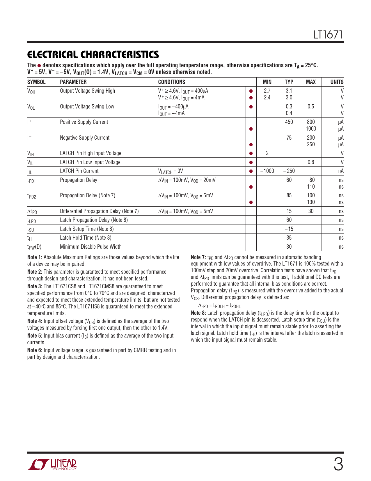 VOH Output Voltage Swing High V + ≥ 4.6V, IOUT = 400µA ● 2.7 3.1 V V + ≥ 4.6V, IOUT = 4mA ● 2.4 3.0 V VOL Output Voltage Swing Low IOUT = – 400µA ● 0.3 0.5 V IOUT = – 4mA 0.4 V I+ Positive Supply Current 450 800 µA ● 1000 µA I– Negative Supply Current 75 200 µA ● 250 µA VIH LATCH Pin High Input Voltage ● 2 V VIL LATCH Pin Low Input Voltage ● 0.8 V IIL LATCH Pin Current VLATCH = 0V ● – 1000 – 250 nA tPD1 Propagation Delay ∆VIN = 100mV, VOD = 20mV 60 80 ns ● 110 ns tPD2 Propagation Delay (Note 7) ∆VIN = 100mV, VOD = 5mV 85 100 ns ● 130 ns ∆tPD Differential Propagation Delay (Note 7) ∆VIN = 100mV, VOD = 5mV 15 30 ns tLPD Latch Propagation Delay (Note 8) 60 ns tSU Latch Setup Time (Note 8) – 15 ns tH Latch Hold Time (Note 8) 35 ns tPW(D) Minimum Disable Pulse Width 30 ns