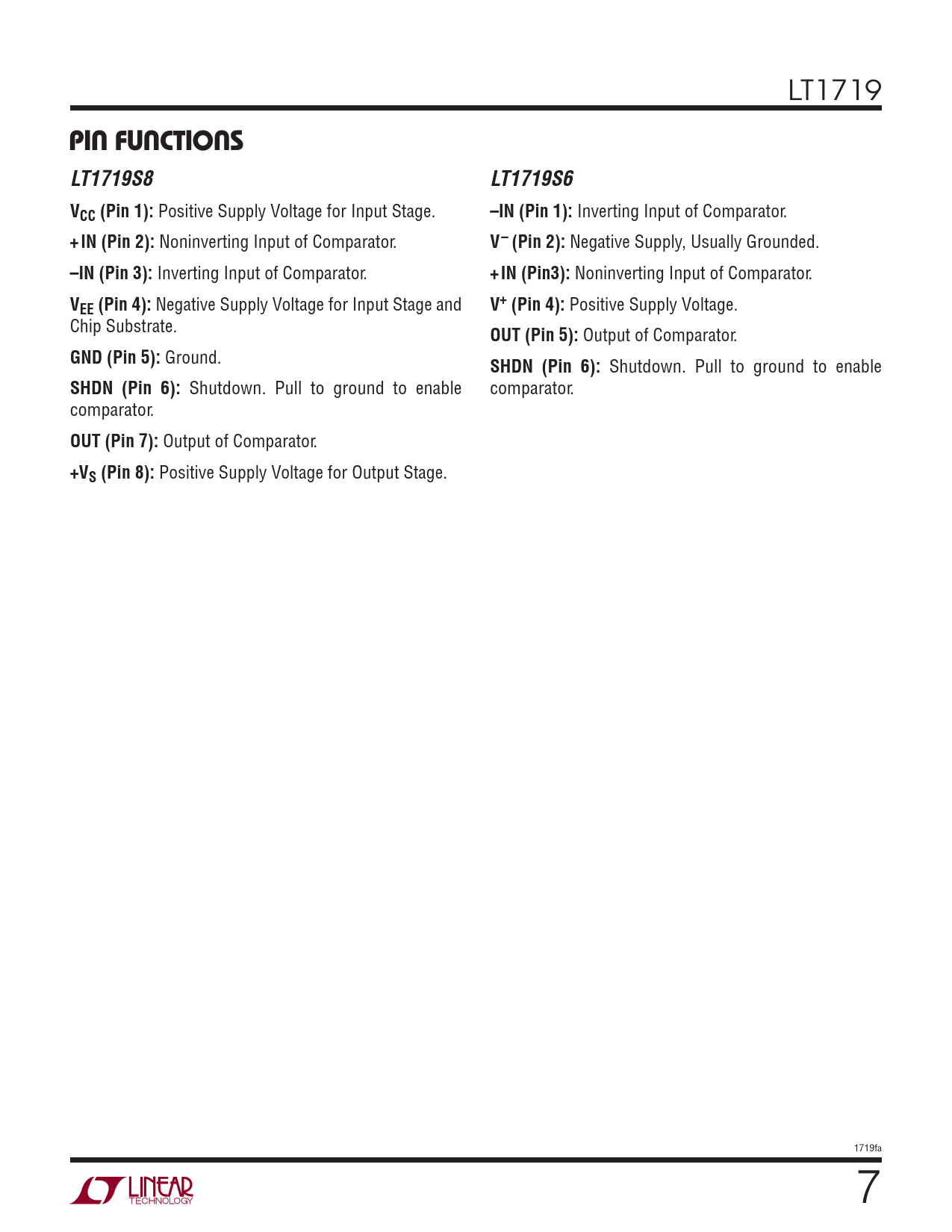 LT1719 PIN FUNCTIONSLT1719S8LT1719S6VCC (Pin 1): Positive Supply Voltage for Input Stage. –IN (Pin 1): Inverting Input of Comparator. + IN (Pin 2): Noninverting Input of Comparator. V– (Pin 2): Negative Supply, Usually Grounded. –IN (Pin 3): Inverting Input of Comparator. + IN (Pin3): Noninverting Input of Comparator. VEE (Pin 4): Negative Supply Voltage for Input Stage and V+ (Pin 4): Positive Supply Voltage. Chip Substrate. OUT (Pin 5): Output of Comparator. GND (Pin 5): Ground. SHDN (Pin 6): Shutdown. Pull to ground to enable SHDN (Pin 6): Shutdown. Pull to ground to enable comparator. comparator. OUT (Pin 7): Output of Comparator. +VS (Pin 8): Positive Supply Voltage for Output Stage. 1719fa 7