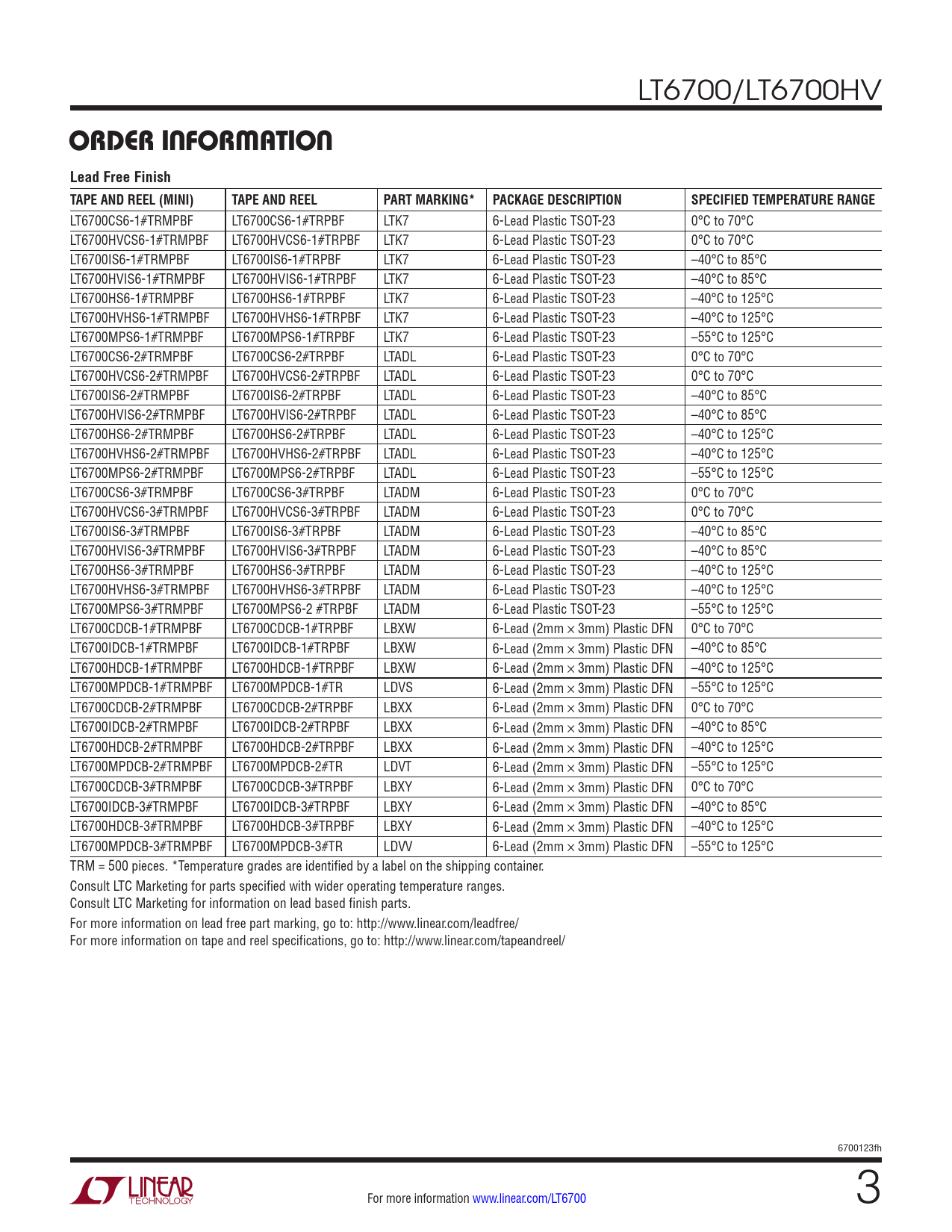 LT6700CS6-1#TRMPBF LT6700CS6-1#TRPBF LTK7 6-Lead Plastic TSOT-23 0°C to 70°C LT6700HVCS6-1#TRMPBF LT6700HVCS6-1#TRPBF LTK7 6-Lead Plastic TSOT-23 0°C to 70°C LT6700IS6-1#TRMPBF LT6700IS6-1#TRPBF LTK7 6-Lead Plastic TSOT-23 –40°C to 85°C LT6700HVIS6-1#TRMPBF LT6700HVIS6-1#TRPBF LTK7 6-Lead Plastic TSOT-23 –40°C to 85°C LT6700HS6-1#TRMPBF LT6700HS6-1#TRPBF LTK7 6-Lead Plastic TSOT-23 –40°C to 125°C LT6700HVHS6-1#TRMPBF LT6700HVHS6-1#TRPBF LTK7 6-Lead Plastic TSOT-23 –40°C to 125°C LT6700MPS6-1#TRMPBF LT6700MPS6-1#TRPBF LTK7 6-Lead Plastic TSOT-23 –55°C to 125°C LT6700CS6-2#TRMPBF LT6700CS6-2#TRPBF LTADL 6-Lead Plastic TSOT-23 0°C to 70°C LT6700HVCS6-2#TRMPBF LT6700HVCS6-2#TRPBF LTADL 6-Lead Plastic TSOT-23 0°C to 70°C LT6700IS6-2#TRMPBF LT6700IS6-2#TRPBF LTADL 6-Lead Plastic TSOT-23 –40°C to 85°C LT6700HVIS6-2#TRMPBF LT6700HVIS6-2#TRPBF LTADL 6-Lead Plastic TSOT-23 –40°C to 85°C LT6700HS6-2#TRMPBF LT6700HS6-2#TRPBF LTADL 6-Lead Plastic TSOT-23 –40°C to 125°C LT6700HVHS6-2#TRMPBF LT6700HVHS6-2#TRPBF LTADL 6-Lead Plastic TSOT-23 –40°C to 125°C LT6700MPS6-2#TRMPBF LT6700MPS6-2#TRPBF LTADL 6-Lead Plastic TSOT-23 –55°C to 125°C LT6700CS6-3#TRMPBF LT6700CS6-3#TRPBF LTADM 6-Lead Plastic TSOT-23 0°C to 70°C LT6700HVCS6-3#TRMPBF LT6700HVCS6-3#TRPBF LTADM 6-Lead Plastic TSOT-23 0°C to 70°C LT6700IS6-3#TRMPBF LT6700IS6-3#TRPBF LTADM 6-Lead Plastic TSOT-23 –40°C to 85°C LT6700HVIS6-3#TRMPBF LT6700HVIS6-3#TRPBF LTADM 6-Lead Plastic TSOT-23 –40°C to 85°C LT6700HS6-3#TRMPBF LT6700HS6-3#TRPBF LTADM 6-Lead Plastic TSOT-23 –40°C to 125°C LT6700HVHS6-3#TRMPBF LT6700HVHS6-3#TRPBF LTADM 6-Lead Plastic TSOT-23 –40°C to 125°C LT6700MPS6-3#TRMPBF LT6700MPS6-2 #TRPBF LTADM 6-Lead Plastic TSOT-23 –55°C to 125°C LT6700CDCB-1#TRMPBF LT6700CDCB-1#TRPBF LBXW 6-Lead (2mm × 3mm) Plastic DFN 0°C to 70°C LT6700IDCB-1#TRMPBF LT6700IDCB-1#TRPBF LBXW 6-Lead (2mm × 3mm) Plastic DFN –40°C to 85°C LT6700HDCB-1#TRMPBF LT6700HDCB-1#TRPBF LBXW 6-Lead (2mm × 3mm) Plastic DFN –40°C to 125°C LT6700MPDCB-1#TRMPBF LT6700MPDCB-1#TR LDVS 6-Lead (2mm × 3mm) Plastic DFN –55°C to 125°C LT6700CDCB-2#TRMPBF LT6700CDCB-2#TRPBF LBXX 6-Lead (2mm × 3mm) Plastic DFN 0°C to 70°C LT6700IDCB-2#TRMPBF LT6700IDCB-2#TRPBF LBXX 6-Lead (2mm × 3mm) Plastic DFN –40°C to 85°C LT6700HDCB-2#TRMPBF LT6700HDCB-2#TRPBF LBXX 6-Lead (2mm × 3mm) Plastic DFN –40°C to 125°C LT6700MPDCB-2#TRMPBF LT6700MPDCB-2#TR LDVT 6-Lead (2mm × 3mm) Plastic DFN –55°C to 125°C LT6700CDCB-3#TRMPBF LT6700CDCB-3#TRPBF LBXY 6-Lead (2mm × 3mm) Plastic DFN 0°C to 70°C LT6700IDCB-3#TRMPBF LT6700IDCB-3#TRPBF LBXY 6-Lead (2mm × 3mm) Plastic DFN –40°C to 85°C LT6700HDCB-3#TRMPBF LT6700HDCB-3#TRPBF LBXY 6-Lead (2mm × 3mm) Plastic DFN –40°C to 125°C LT6700MPDCB-3#TRMPBF LT6700MPDCB-3#TR LDVV 6-Lead (2mm × 3mm) Plastic DFN –55°C to 125°C TRM = 500 pieces. *Temperature grades are identified by a label on the shipping container. Consult LTC Marketing for parts specified with wider operating temperature ranges. Consult LTC Marketing for information on lead based finish parts. For more information on lead free part marking, go to: http://www.linear.com/leadfree/ For more information on tape and reel specifications, go to: http://www.linear.com/tapeandreel/ 6700123fh For more information www.linear.com/LT6700 3 Document Outline Features Description Applications Typical Application Absolute Maximum Ratings Pin Configuration Order Information Electrical Characteristics Pin Functions Typical Performance Characteristics Applications Information Package Information Revision History Typical Applications Related Parts