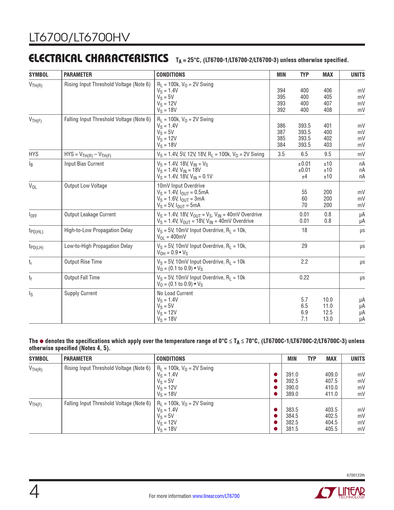 | Pages / Page | 20 / 4 — ELECTRICAL CHARACTERISTICS. TA = 25°C, (LT6700-1/LT6700-2/LT6700-3) … |