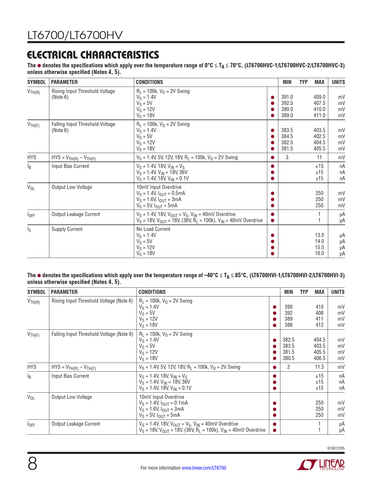 LT6700/LT6700HV ELECTRICAL CHARACTERISTICSThe l denotes the specifications which apply over the temperature range of 0°C ≤ TA ≤ 70°C, (LT6700HVC-1/LT6700HVC-2/LT6700HVC-3)unless otherwise specified (Notes 4, 5). SYMBOL PARAMETERCONDITIONSMINTYPMAXUNITS VTH(R) Rising Input Threshold Voltage RL = 100k, VO = 2V Swing (Note 6) VS = 1.4V l 391.0 409.0 mV VS = 5V l 392.5 407.5 mV VS = 12V l 390.0 410.0 mV VS = 18V l 389.0 411.0 mV VTH(F) Falling Input Threshold Voltage RL = 100k, VO = 2V Swing (Note 6) VS = 1.4V l 383.5 403.5 mV VS = 5V l 384.5 402.5 mV VS = 12V l 382.5 404.5 mV VS = 18V l 381.5 405.5 mV HYS HYS = VTH(R) – VTH(F) VS = 1.4V, 5V, 12V, 18V, RL = 100k, VO = 2V Swing l 3 11 mV IB Input Bias Current VS = 1.4V, 18V, VIN = VS l ±15 nA VS = 1.4V, VIN = 18V, 36V l ±15 nA VS = 1.4V, 18V, VIN = 0.1V l ±15 nA VOL Output Low Voltage 10mV Input Overdrive VS = 1.4V, IOUT = 0.5mA l 250 mV VS = 1.6V, IOUT = 3mA l 250 mV VS = 5V, IOUT = 5mA l 250 mV IOFF Output Leakage Current VS = 1.4V, 18V, VOUT = VS, VIN = 40mV Overdrive l 1 µA VS = 18V, VOUT = 18V, (36V, RL = 100k), VIN = 40mV Overdrive l 1 µA IS Supply Current No Load Current VS = 1.4V l 13.0 µA VS = 5V l 14.0 µA VS = 12V l 15.5 µA VS = 18V l 16.0 µA The l denotes the specifications which apply over the temperature range of –40°C ≤ TA ≤ 85°C, (LT6700HVI-1/LT6700HVI-2/LT6700HVI-3)unless otherwise specified (Notes 4, 5). SYMBOL PARAMETERCONDITIONSMINTYP MAXUNITS VTH(R) Rising Input Threshold Voltage (Note 6) RL = 100k, VO = 2V Swing VS = 1.4V l 390 410 mV VS = 5V l 392 408 mV VS = 12V l 389 411 mV VS = 18V l 388 412 mV VTH(F) Falling Input Threshold Voltage (Note 6) RL = 100k, VO = 2V Swing VS = 1.4V l 382.5 404.5 mV VS = 5V l 383.5 403.5 mV VS = 12V l 381.5 405.5 mV VS = 18V l 380.5 406.5 mV HYS HYS = VTH(R) – VTH(F) VS = 1.4V, 5V, 12V, 18V, RL = 100k, VO = 2V Swing l 2 11.5 mV IB Input Bias Current VS = 1.4V, 18V, VIN = VS l ±15 nA VS = 1.4V, VIN = 18V, 36V l ±15 nA VS = 1.4V, 18V, VIN = 0.1V l ±15 nA VOL Output Low Voltage 10mV Input Overdrive VS = 1.4V, IOUT = 0.1mA l 250 mV VS = 1.6V, IOUT = 3mA l 250 mV VS = 5V, IOUT = 5mA l 250 mV IOFF Output Leakage Current VS = 1.4V, 18V, VOUT = VS, VIN = 40mV Overdrive l 1 µA VS = 18V, VOUT = 18V, (36V, RL = 100k), VIN = 40mV Overdrive l 1 µA 6700123fh 8 For more information www.linear.com/LT6700 Document Outline Features Description Applications Typical Application Absolute Maximum Ratings Pin Configuration Order Information Electrical Characteristics Pin Functions Typical Performance Characteristics Applications Information Package Information Revision History Typical Applications Related Parts