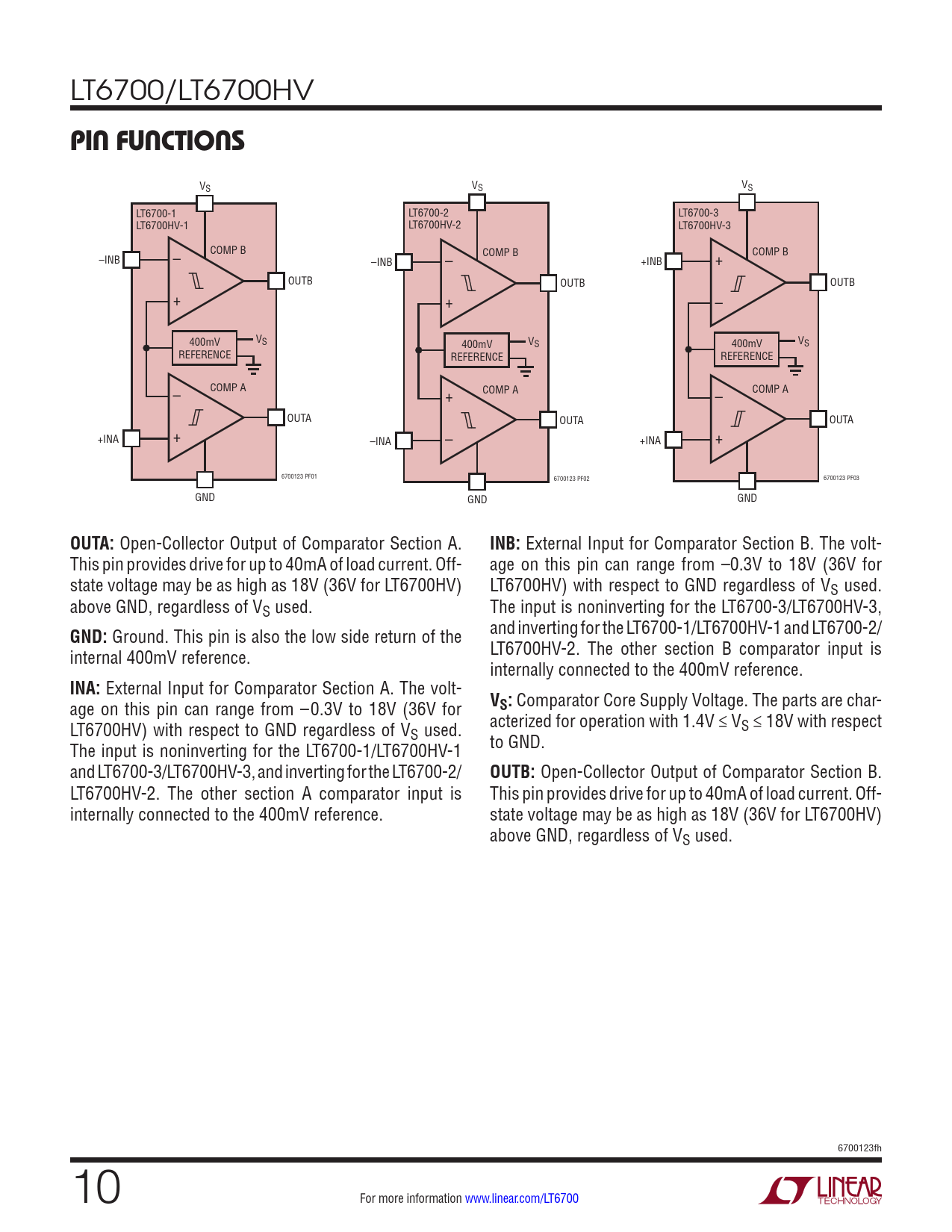 VS VS VS LT6700-1 LT6700-2 LT6700-3 LT6700HV-1 LT6700HV-2 LT6700HV-3 COMP B COMP B –INB – COMP B –INB – +INB + OUTB OUTB OUTB + + – 400mV VS 400mV VS 400mV VS REFERENCE REFERENCE REFERENCE – COMP A + COMP A – COMP A OUTA OUTA OUTA +INA + –INA – +INA + 6700123 PF01 6700123 PF02 6700123 PF03 GND GND GND