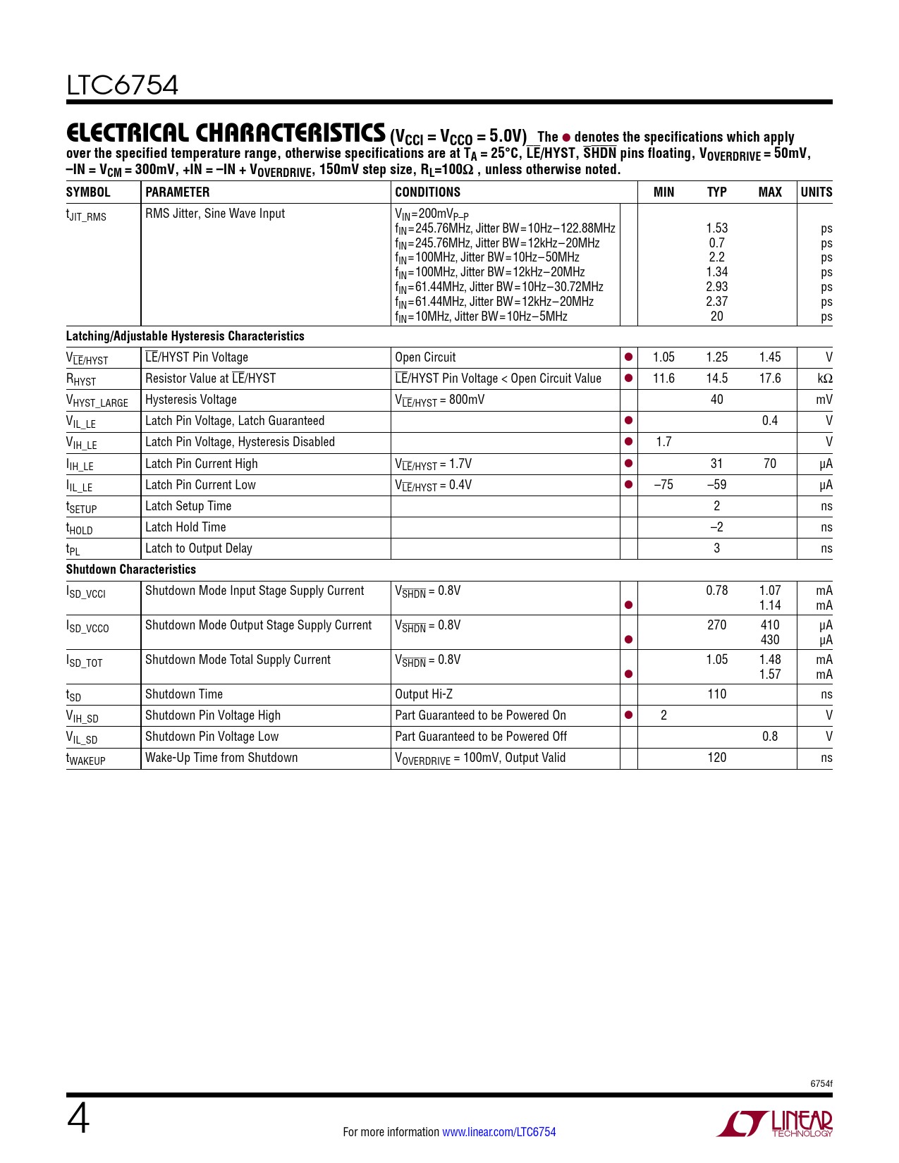 ISD_VCCI Shutdown Mode Input Stage Supply Current VSHDN = 0.8V 0.78 1.07 mA l 1.14 mA ISD_VCCO Shutdown Mode Output Stage Supply Current VSHDN = 0.8V 270 410 μA l 430 µA ISD_TOT Shutdown Mode Total Supply Current VSHDN = 0.8V 1.05 1.48 mA l 1.57 mA tSD Shutdown Time Output Hi-Z 110 ns VIH_SD Shutdown Pin Voltage High Part Guaranteed to be Powered On l 2 V VIL_SD Shutdown Pin Voltage Low Part Guaranteed to be Powered Off 0.8 V tWAKEUP Wake-Up Time from Shutdown VOVERDRIVE = 100mV, Output Valid 120 ns 6754f 4 For more information www.linear.com/LTC6754 Document Outline Features Applications Typical Application Description Absolute Maximum Ratings Order Information Pin Configuration Electrical Characteristics Typical Performance Characteristics Pin Functions Applications Information Package Description Revision History Typical Application Related Parts