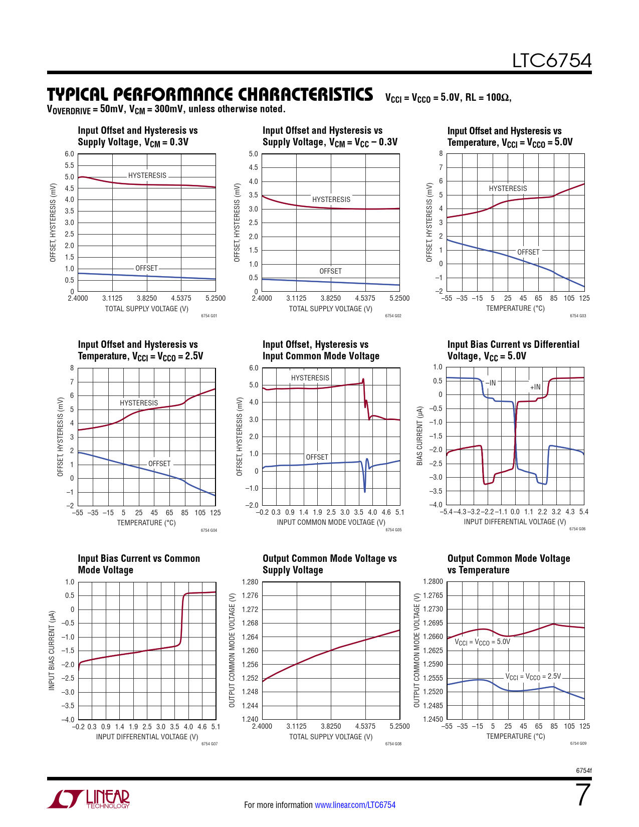 8 6.0 1.0 7 HYSTERESIS 5.0 0.5 –IN +IN 6 0 HYSTERESIS 4.0 5 –0.5 4 3.0 –1.0 3 2.0 –1.5 2 , HYSTERESIS (mV) , HYSTERESIS (mV) 1.0 –2.0 OFFSET 1 OFFSET BIAS CURRENT (µA) –2.5 OFFSET 0 OFFSET 0 –3.0 –1 –1.0 –3.5 –2 –2.0 –4.0 –55 –35 –15 5 25 45 65 85 105 125 –0.2 0.3 0.9 1.4 1.9 2.5 3.0 3.5 4.0 4.6 5.1 –5.4 –4.3 –3.2 –2.2 –1.1 0.0 1.1 2.2 3.2 4.3 5.4 TEMPERATURE (°C) INPUT COMMON MODE VOLTAGE (V) INPUT DIFFERENTIAL VOLTAGE (V) 6754 G04 6754 G05 6754 G06