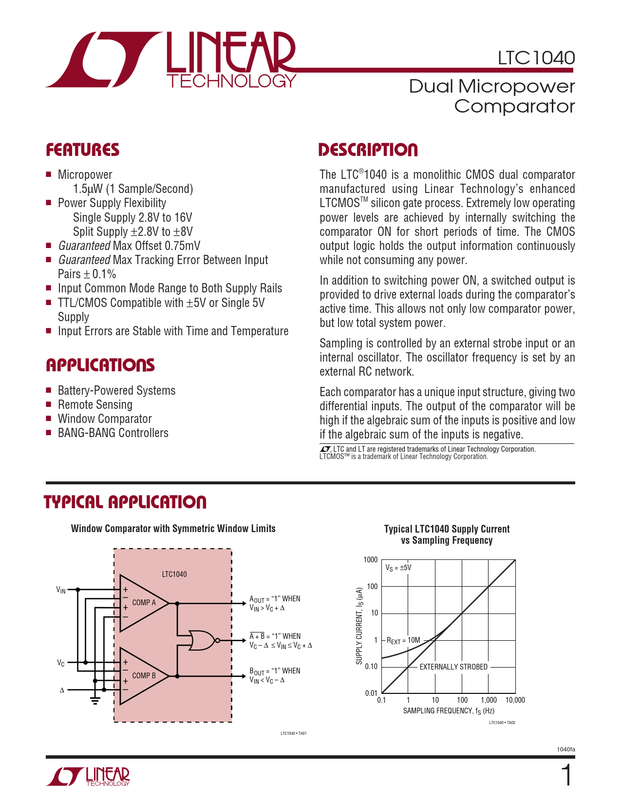LTC1040 Dual Micropower Comparator UFEATURESDESCRIPTIO ■ Micropower The LTC®1040 is a monolithic CMOS dual comparator 1.5µW (1 Sample/Second) manufactured using Linear Technology’s enhanced ■ Power Supply Flexibility LTCMOSTM silicon gate process. Extremely low operating Single Supply 2.8V to 16V power levels are achieved by internally switching the Split Supply ±2.8V to ±8V comparator ON for short periods of time. The CMOS ■ Guaranteed Max Offset 0.75mV output logic holds the output information continuously ■ Guaranteed Max Tracking Error Between Input while not consuming any power. Pairs ± 0.1% In addition to switching power ON, a switched output is ■ Input Common Mode Range to Both Supply Rails provided to drive external loads during the comparator’s ■ TTL/CMOS Compatible with ±5V or Single 5V active time. This allows not only low comparator power, Supply but low total system power. ■ Input Errors are Stable with Time and Temperature Sampling is controlled by an external strobe input or an U internal oscillator. The oscillator frequency is set by an APPLICATIO S external RC network. ■ Battery-Powered Systems Each comparator has a unique input structure, giving two ■ Remote Sensing differential inputs. The output of the comparator will be ■ Window Comparator high if the algebraic sum of the inputs is positive and low ■ BANG-BANG Controllers if the algebraic sum of the inputs is negative. , LTC and LT are registered trademarks of Linear Technology Corporation. LTCMOS™ is a trademark of Linear Technology Corporation. UTYPICAL APPLICATIOWindow Comparator with Symmetric Window LimitsTypical LTC1040 Supply Currentvs Sampling Frequency 1000 VS = ±5V LTC1040 V 100 IN + – µA) AOUT = “1” WHEN ( + COMP A S VIN > VC + ∆ – 10 A + B = “1” WHEN 1 R V EXT = 10M C – ∆ ≤ VIN ≤ VC + ∆ VC + SUPPLY CURRENT, I – 0.10 EXTERNALLY STROBED BOUT = “1” WHEN + COMP B VIN < VC – ∆ ∆ – 0.010.1 1 10 100 1,000 10,000 SAMPLING FREQUENCY, fS (Hz) LTC1040 • TA02 LTC1040 • TA01 1040fa 1