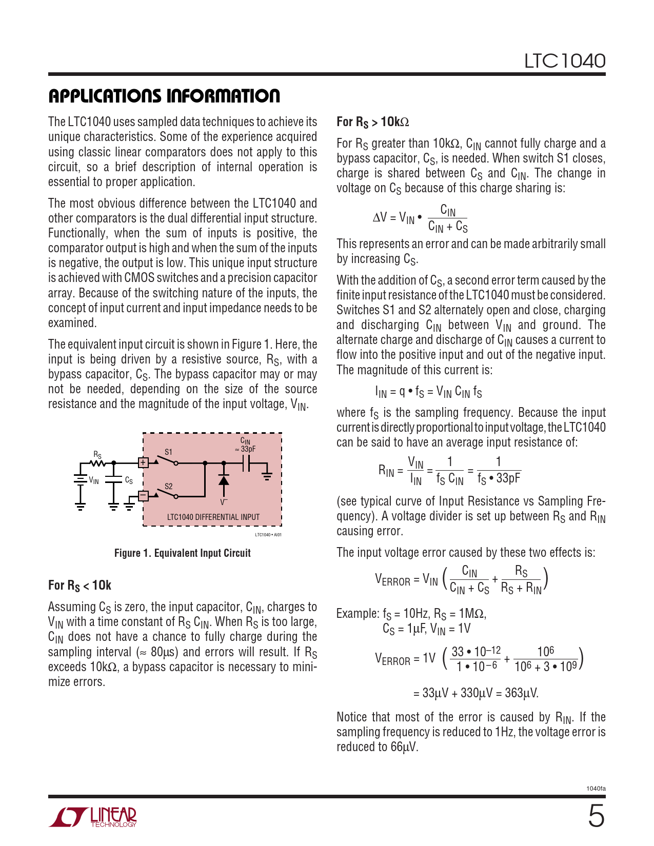 Ω unique characteristics. Some of the experience acquired For R using classic linear comparators does not apply to this S greater than 10kΩ, CIN cannot fully charge and a bypass capacitor, C circuit, so a brief description of internal operation is S, is needed. When switch S1 closes, charge is shared between C essential to proper application. S and CIN. The change in voltage on CS because of this charge sharing is: The most obvious difference between the LTC1040 and C other comparators is the dual differential input structure. ∆V = V IN IN • C Functionally, when the sum of inputs is positive, the IN + CS comparator output is high and when the sum of the inputs This represents an error and can be made arbitrarily small is negative, the output is low. This unique input structure by increasing CS. is achieved with CMOS switches and a precision capacitor With the addition of CS, a second error term caused by the array. Because of the switching nature of the inputs, the finite input resistance of the LTC1040 must be considered. concept of input current and input impedance needs to be Switches S1 and S2 alternately open and close, charging examined. and discharging CIN between VIN and ground. The The equivalent input circuit is shown in Figure 1. Here, the alternate charge and discharge of CIN causes a current to input is being driven by a resistive source, R flow into the positive input and out of the negative input. S, with a bypass capacitor, C The magnitude of this current is: S. The bypass capacitor may or may not be needed, depending on the size of the source IIN = q • fS = VIN CIN fS resistance and the magnitude of the input voltage, VIN. where fS is the sampling frequency. Because the input current is directly proportional to input voltage, the LTC1040 CIN can be said to have an average input resistance of: ≈ 33pF R S1 S + V 1 1 R IN IN = = = V I f f IN CS IN S CIN S • 33pF S2 – V– (see typical curve of Input Resistance vs Sampling Fre- LTC1040 DIFFERENTIAL INPUT quency). A voltage divider is set up between RS and RIN causing error. LTC1040 • AI01