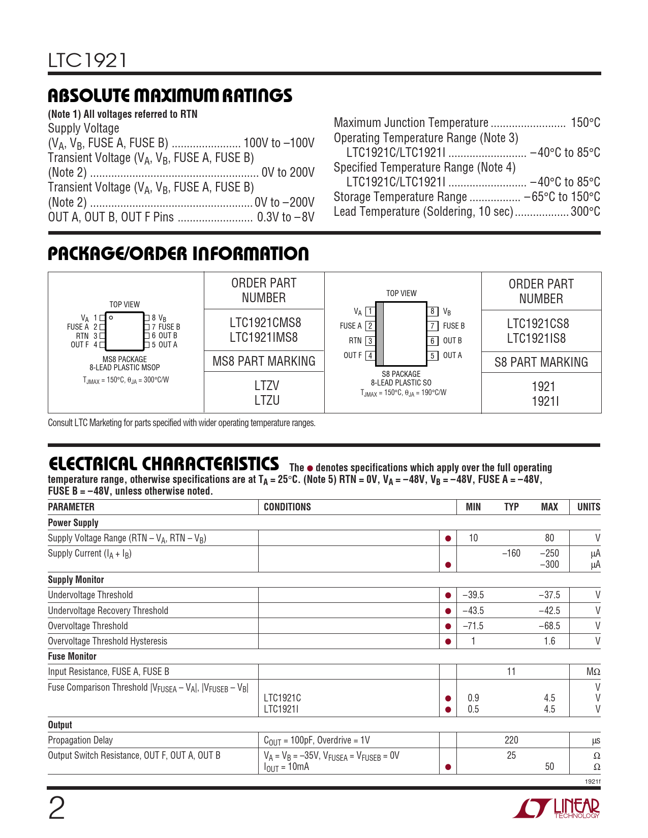 LTC1921 WWWUABSOLUTE AXI URATI GS(Note 1) All voltages referred to RTN Supply Voltage Maximum Junction Temperature ... 150°C (V Operating Temperature Range (Note 3) A, VB, FUSE A, FUSE B) ... 100V to –100V Transient Voltage (V LTC1921C/LTC1921I .. – 40°C to 85°C A, VB, FUSE A, FUSE B) (Note 2) .. 0V to 200V Specified Temperature Range (Note 4) Transient Voltage (V LTC1921C/LTC1921I .. – 40°C to 85°C A, VB, FUSE A, FUSE B) (Note 2) .. 0V to –200V Storage Temperature Range ... – 65°C to 150°C OUT A, OUT B, OUT F Pins ... 0.3V to – 8V Lead Temperature (Soldering, 10 sec).. 300°C UWUPACKAGE/ORDER I FOR ATIO ORDER PART ORDER PART NUMBER TOP VIEW NUMBER TOP VIEW V 1 8 V A B V 1 A 8 VB LTC1921CMS8 FUSE A 2 7 FUSE B FUSE A 2 7 FUSE B LTC1921CS8 RTN 3 6 OUT B LTC1921IMS8 RTN 3 6 OUT B LTC1921IS8 OUT F 4 5 OUT A OUT F OUT A MS8 PACKAGE MS8 PART MARKING 4 5 S8 PART MARKING 8-LEAD PLASTIC MSOP S8 PACKAGE TJMAX = 150°C, θJA = 300°C/W LTZV 8-LEAD PLASTIC SO 1921 TJMAX = 150°C, θJA = 190°C/W LTZU 1921I Consult LTC Marketing for parts specified with wider operating temperature ranges. ELECTRICAL CHARACTERISTICS The ● denotes specifications which apply over the full operatingtemperature range, otherwise specifications are at TA = 25 ° C. (Note 5) RTN = 0V, VA = –48V, VB = –48V, FUSE A = –48V,FUSE B = –48V, unless otherwise noted.PARAMETERCONDITIONSMINTYPMAXUNITSPower Supply Supply Voltage Range (RTN – VA, RTN –␣ VB) ● 10 80 V Supply Current (IA + IB) –160 –250 µA ● –300 µA Supply Monitor Undervoltage Threshold ● –39.5 –37.5 V Undervoltage Recovery Threshold ● –43.5 –42.5 V Overvoltage Threshold ● –71.5 –68.5 V Overvoltage Threshold Hysteresis ● 1 1.6 V Fuse Monitor Input Resistance, FUSE A, FUSE B 11 MΩ Fuse Comparison Threshold |VFUSEA – VA|, |VFUSEB – VB| V LTC1921C ● 0.9 4.5 V LTC1921I ● 0.5 4.5 V Output Propagation Delay COUT = 100pF, Overdrive = 1V 220 µs Output Switch Resistance, OUT F, OUT A, OUT B VA = VB = –35V, VFUSEA = VFUSEB = 0V 25 Ω IOUT = 10mA ● 50 Ω 1921f 2