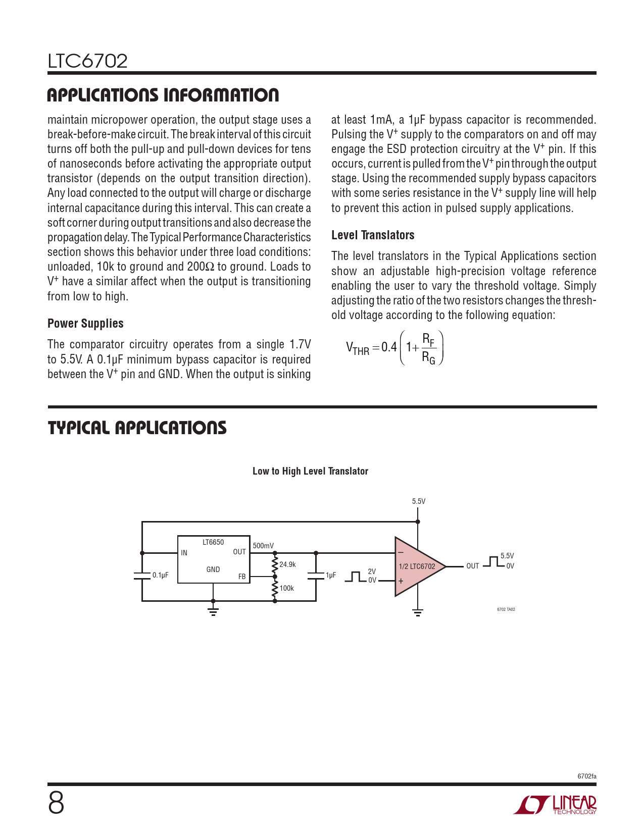 LTC6702 APPLICATIONS INFORMATION maintain micropower operation, the output stage uses a at least 1mA, a 1μF bypass capacitor is recommended. break-before-make circuit. The break interval of this circuit Pulsing the V+ supply to the comparators on and off may turns off both the pull-up and pull-down devices for tens engage the ESD protection circuitry at the V+ pin. If this of nanoseconds before activating the appropriate output occurs, current is pulled from the V+ pin through the output transistor (depends on the output transition direction). stage. Using the recommended supply bypass capacitors Any load connected to the output will charge or discharge with some series resistance in the V+ supply line will help internal capacitance during this interval. This can create a to prevent this action in pulsed supply applications. soft corner during output transitions and also decrease the propagation delay. The Typical Performance Characteristics Level Translators section shows this behavior under three load conditions: The level translators in the Typical Applications section unloaded, 10k to ground and 200Ω to ground. Loads to show an adjustable high-precision voltage reference V+ have a similar affect when the output is transitioning enabling the user to vary the threshold voltage. Simply from low to high. adjusting the ratio of the two resistors changes the thresh- old voltage according to the following equation: Power Supplies The comparator circuitry operates from a single 1.7V V = THR 0.4 1+ RF to 5.5V. A 0.1μF minimum bypass capacitor is required RG between the V+ pin and GND. When the output is sinking TYPICAL APPLICATIONSLow to High Level Translator 5.5V LT6650 500mV IN OUT – 5.5V 24.9k 1/2 LTC6702 OUT 0V GND 2V 0.1μF FB 1μF 0V + 100k 6702 TA02 6702fa 8