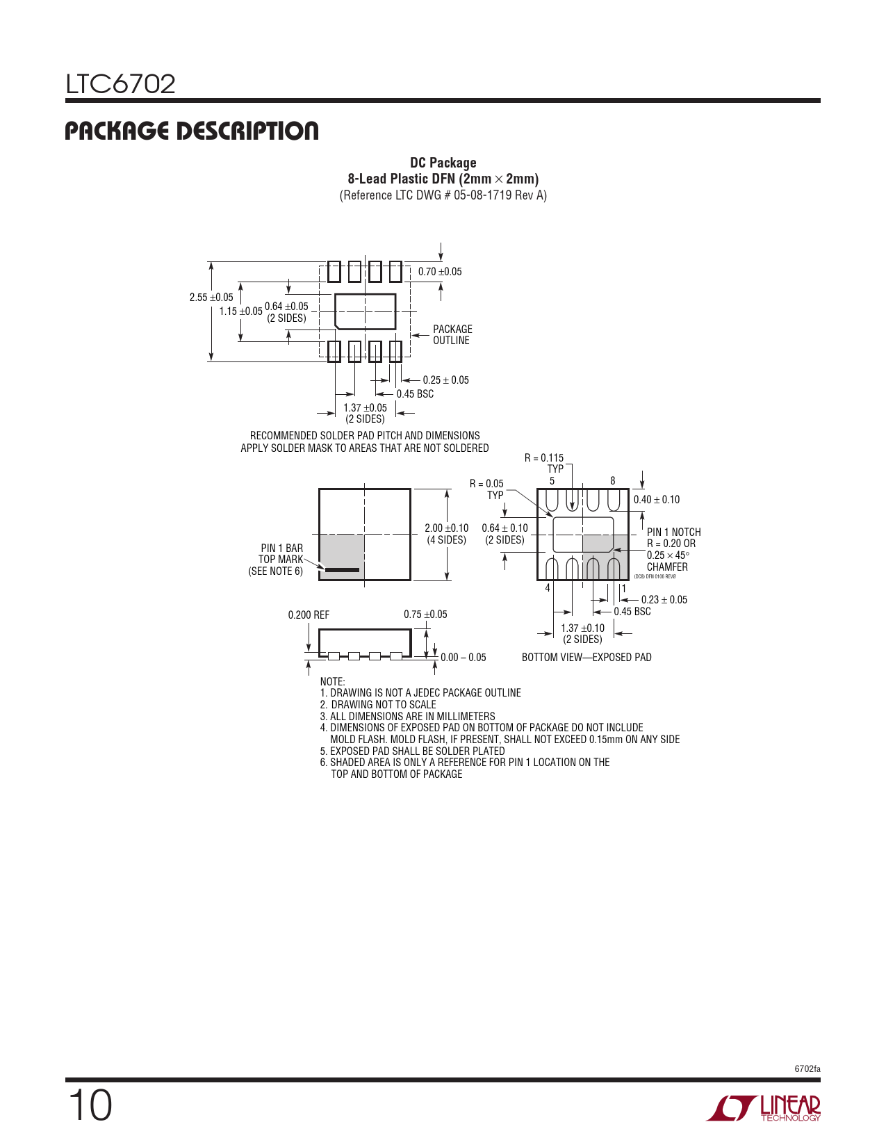 LTC6702 PACKAGE DESCRIPTIONDC Package8-Lead Plastic DFN (2mm × 2mm) (Reference LTC DWG # 05-08-1719 Rev A) 0.70 p0.05 2.55 p0.05 0.64 p0.05 1.15 p0.05 (2 SIDES) PACKAGE OUTLINE 0.25 p 0.05 0.45 BSC 1.37 p0.05 (2 SIDES) RECOMMENDED SOLDER PAD PITCH AND DIMENSIONS APPLY SOLDER MASK TO AREAS THAT ARE NOT SOLDERED R = 0.115 TYP R = 0.05 5 8 TYP 0.40 p 0.10 2.00 p0.10 0.64 p 0.10 PIN 1 NOTCH (4 SIDES) (2 SIDES) PIN 1 BAR R = 0.20 OR TOP MARK 0.25 s 45o (SEE NOTE 6) CHAMFER (DC8) DFN 0106 REVØ 4 1 0.23 p 0.05 0.200 REF 0.75 p0.05 0.45 BSC 1.37 p0.10 (2 SIDES) 0.00 – 0.05 BOTTOM VIEW—EXPOSED PAD NOTE: 1. DRAWING IS NOT A JEDEC PACKAGE OUTLINE 2. DRAWING NOT TO SCALE 3. ALL DIMENSIONS ARE IN MILLIMETERS 4. DIMENSIONS OF EXPOSED PAD ON BOTTOM OF PACKAGE DO NOT INCLUDE MOLD FLASH. MOLD FLASH, IF PRESENT, SHALL NOT EXCEED 0.15mm ON ANY SIDE 5. EXPOSED PAD SHALL BE SOLDER PLATED 6. SHADED AREA IS ONLY A REFERENCE FOR PIN 1 LOCATION ON THE TOP AND BOTTOM OF PACKAGE 6702fa 10