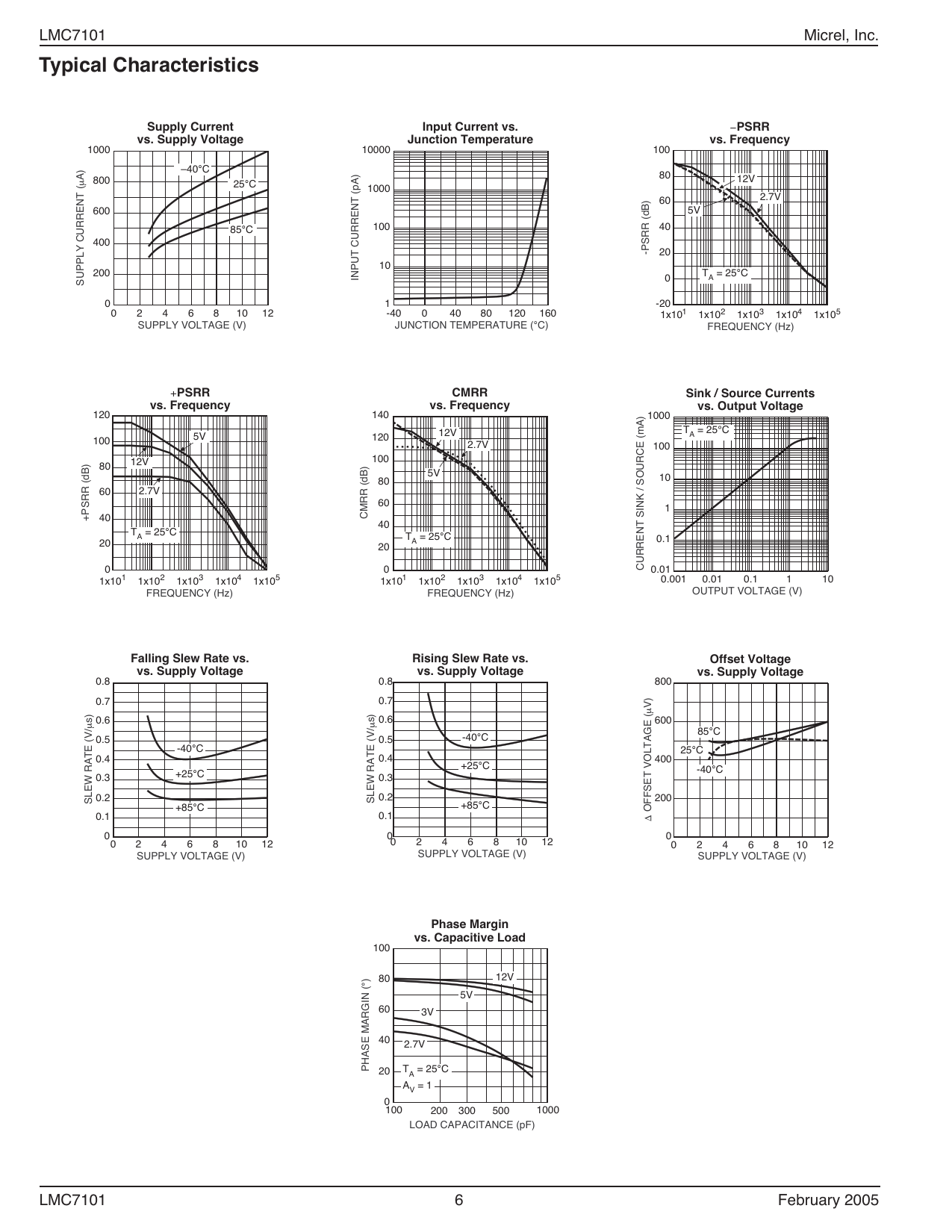Model Line for this Datasheet Text Version of Document LMC7101 Micrel, Inc.Typical Characteristics Supply Current Input Current vs. −PSRR vs. Supply Voltage Junction Temperature vs. Frequency 1000 10000 100 –40°C A) 80 800 µ 12V 25°C 1000 60 2.7V 600 5V 85°C 100 40 400 -PSRR (dB) 20 10 200 INPUT CURRENT (pA) T = 25°C A SUPPLY CURRENT ( 0 0 1 -20 0 2 4 6 8 10 12 -40 0 40 80 120 160 1x101 1x102 1x103 1x104 1x105 SUPPLY VOLTAGE (V) JUNCTION TEMPERATURE (°C) FREQUENCY (Hz) +PSRR CMRR Sink / Source Currents vs. Frequency vs. Frequency vs. Output Voltage 120 140 1000 T = 25°C 12V A 100 5V 120 2.7V 100 100 80 12V 5V 10 80 60 2.7V 60 1 +PSRR (dB) 40 CMRR (dB) 40 T = 25°C A T = 25°C 20 A 0.1 20 0 0 CURRENT SINK / SOURCE (mA) 0.01 1x101 1x102 1x103 1x104 1x105 0.001 0.01 0.1 1 10 1x101 1x102 1x103 1x104 1x105 FREQUENCY (Hz) OUTPUT VOLTAGE (V) FREQUENCY (Hz)Falling Slew Rate vs. Rising Slew Rate vs. Offset Voltage vs. Supply Voltage vs. Supply Voltage vs. Supply Voltage 0.8 0.8 800 0.7 0.7 V) µ s) 0.6 s) 0.6 600 µ µ 85°C 0.5 0.5 -40°C -40°C 25°C 0.4 0.4 400 +25°C -40°C 0.3 +25°C 0.3 0.2 SLEW RATE (V/ 0.2 SLEW RATE (V/ 200 +85°C +85°C OFFSET VOLTAGE ( 0.1 0.1 ∆ 0 0 0 0 2 4 6 8 10 12 0 2 4 6 8 10 12 0 2 4 6 8 10 12 SUPPLY VOLTAGE (V) SUPPLY VOLTAGE (V) SUPPLY VOLTAGE (V)Phase Margin vs. Capacitive Load 100 80 12V °) 5V 60 3V 40 2.7V PHASE MARGIN ( 20 T = 25°C A A = 1 V 0100 200 300 500 1000 LOAD CAPACITANCE (pF) LMC7101 6 February 2005