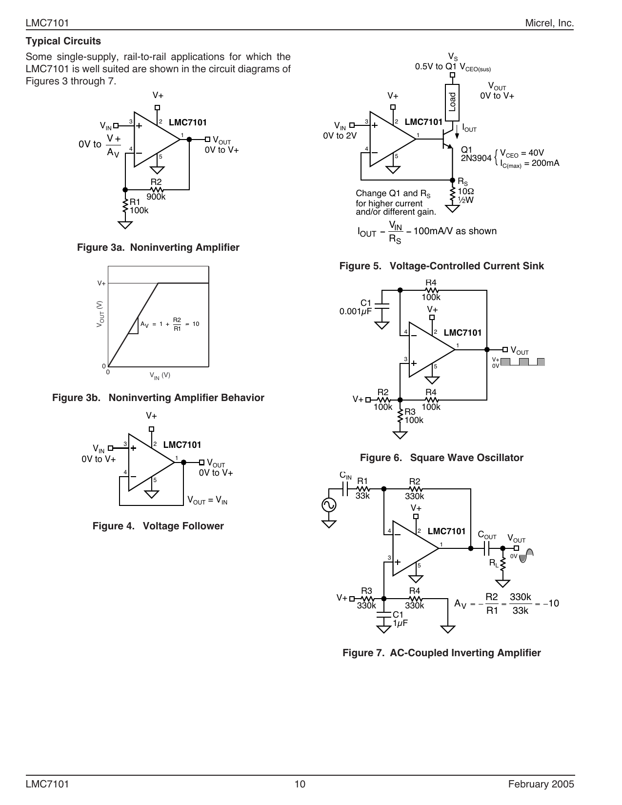 LMC7101 is a 500kHz gain bandwidth amplifier designed to operate from 2.7V to 12V single-ended power supplies with guaranteed performance at supply voltages of 2.7V, 3V, 5V, and 12V