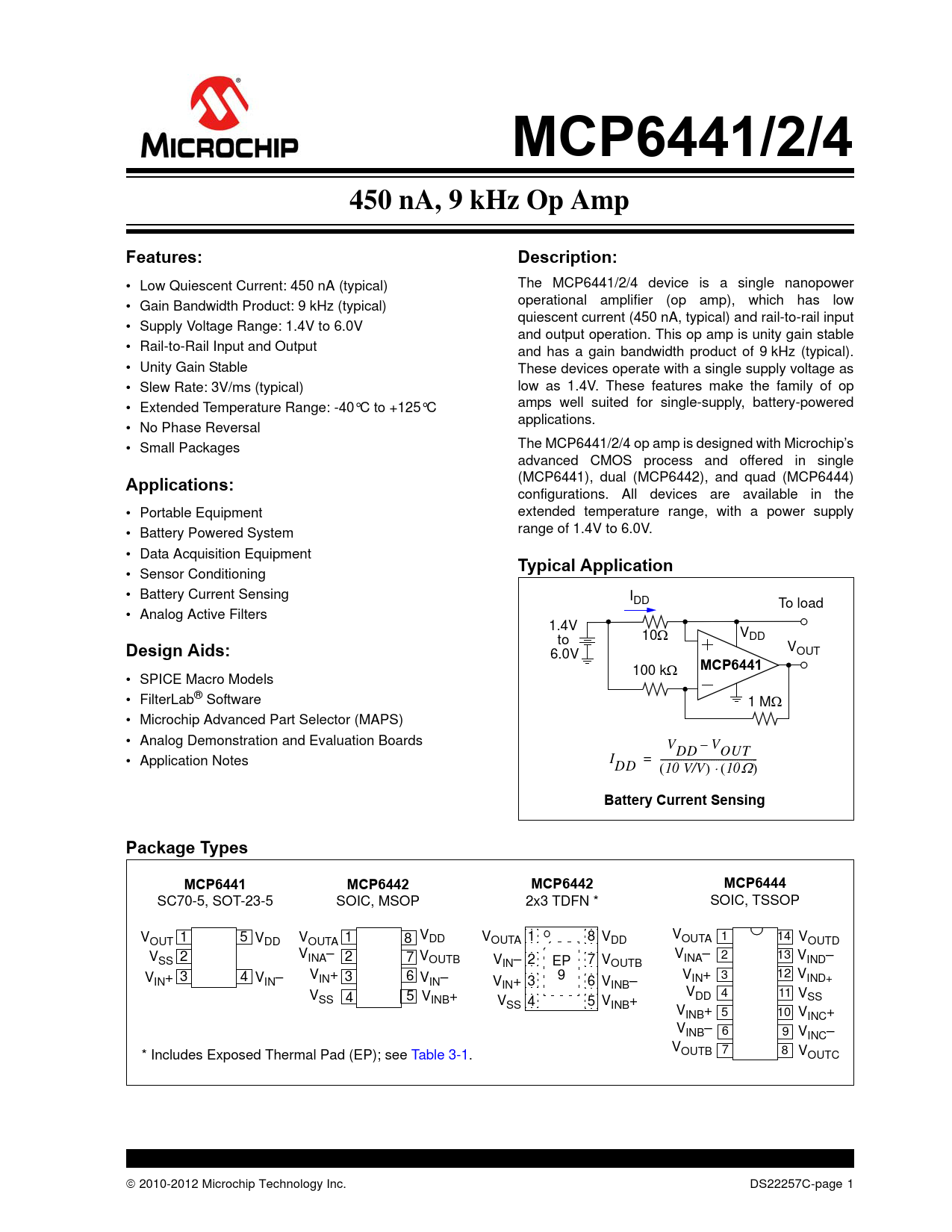 Model Line for this Datasheet Text Version of Document link to page 11MCP6441/2/4 450 nA, 9 kHz Op Amp Features: Description: • Low Quiescent Current: 450 nA (typical) The MCP6441/2/4 device is a single nanopower • Gain Bandwidth Product: 9 kHz (typical) operational amplifier (op amp), which has low quiescent current (450 nA, typical) and rail-to-rail input • Supply Voltage Range: 1.4V to 6.0V and output operation. This op amp is unity gain stable • Rail-to-Rail Input and Output and has a gain bandwidth product of 9 kHz (typical). • Unity Gain Stable These devices operate with a single supply voltage as • Slew Rate: 3V/ms (typical) low as 1.4V. These features make the family of op • Extended Temperature Range: -40°C to +125°C amps well suited for single-supply, battery-powered applications. • No Phase Reversal • Small Packages The MCP6441/2/4 op amp is designed with Microchip’s advanced CMOS process and offered in singleApplications: (MCP6441), dual (MCP6442), and quad (MCP6444) configurations. All devices are available in the • Portable Equipment extended temperature range, with a power supply • Battery Powered System range of 1.4V to 6.0V. • Data Acquisition EquipmentTypical Application • Sensor Conditioning • Battery Current Sensing IDD To load • Analog Active Filters 1.4V V 10Ω DD toDesign Aids: VOUT 6.0V 100 kΩMCP6441 • SPICE Macro Models • FilterLab® Software 1 MΩ • Microchip Advanced Part Selector (MAPS) • Analog Demonstration and Evaluation Boards V – V DD OUT • Application Notes I = --------------------- DD (10 V/V) ⋅ (10Ω)Battery Current Sensing Package Types MCP6441 MCP6442 MCP6442 MCP6444 SC70-5, SOT-23-5 SOIC, MSOP 2x3 TDFN * SOIC, TSSOP V 1 5 V V V V 1 8 V V 1 OUT 14 V DD 1 8 DD OUTA OUTA DD OUTA OUTD V 2 VINA– V V 2 13 V SS 2 7 OUTB INA– V 2 EP 7 V IND– IN– OUTB V 3 4 V V 6 9 V 3 12 V IN+ IN– IN+ 3 VIN– IN+ IND+ VIN+ 3 6 VINB– V V 4 11 V SS 4 5 VINB+ DD SS VSS 4 5 VINB+ VINB+ 5 10 VINC+ VINB– 6 9 VINC– VOUTB 7 8 V * Includes Exposed Thermal Pad (EP); see Table 3-1. OUTC © 2010-2012 Microchip Technology Inc. DS22257C-page 1 Document Outline 1.0 Electrical Characteristics 2.0 Typical Performance Curves FIGURE 2-1: Input Offset Voltage. FIGURE 2-2: Input Offset Voltage Drift. FIGURE 2-3: Input Offset Voltage vs. Common Mode Input Voltage with VDD = 6.0V. FIGURE 2-4: Input Offset Voltage vs. Common Mode Input Voltage with VDD = 1.4V. FIGURE 2-5: Input Offset Voltage vs. Output Voltage. FIGURE 2-6: Input Offset Voltage vs. Power Supply Voltage. FIGURE 2-7: Input Noise Voltage Density vs. Frequency. FIGURE 2-8: Input Noise Voltage Density vs. Common Mode Input Voltage. FIGURE 2-9: CMRR, PSRR vs. Frequency. FIGURE 2-10: CMRR, PSRR vs. Ambient Temperature. FIGURE 2-11: Input Bias, Offset Current vs. Ambient Temperature. FIGURE 2-12: Input Bias Current vs. Common Mode Input Voltage. FIGURE 2-13: Quiescent Current vs. Ambient Temperature. FIGURE 2-14: Quiescent Current vs. Power Supply Voltage. FIGURE 2-15: Open-Loop Gain, Phase vs. Frequency. FIGURE 2-16: DC Open-Loop Gain vs. Power Supply Voltage. FIGURE 2-17: DC Open-Loop Gain vs. Output Voltage Headroom. FIGURE 2-18: Gain Bandwidth Product, Phase Margin vs. Ambient Temperature. FIGURE 2-19: Gain Bandwidth Product, Phase Margin vs. Ambient Temperature. FIGURE 2-20: Output Short Circuit Current vs. Power Supply Voltage. FIGURE 2-21: Output Voltage Swing vs. Frequency. FIGURE 2-22: Output Voltage Headroom vs. Output Current. FIGURE 2-23: Output Voltage Headroom vs. Ambient Temperature. FIGURE 2-24: Slew Rate vs. Ambient Temperature. FIGURE 2-25: Small Signal Non-Inverting Pulse Response. FIGURE 2-26: Small Signal Inverting Pulse Response. FIGURE 2-27: Large Signal Non-Inverting Pulse Response. FIGURE 2-28: Large Signal Inverting Pulse Response. FIGURE 2-29: The MCP6441/2/4 Device Shows No Phase Reversal. FIGURE 2-30: Closed Loop Output Impedance vs. Frequency. FIGURE 2-31: Measured Input Current vs. Input Voltage (below VSS). FIGURE 2-32: Channel-to-Channel Separation vs. Frequency (MCP6442/4 only). 3.0 Pin Descriptions TABLE 3-1: Pin Function Table 4.0 Application Information FIGURE 4-1: Simplified Analog Input ESD Structures. FIGURE 4-2: Protecting the Analog Inputs. FIGURE 4-3: Protecting the Analog Inputs. FIGURE 4-4: Output Resistor, RISO Stabilizes Large Capacitive Loads. FIGURE 4-5: Recommended RISO Values for Capacitive Loads. FIGURE 4-6: Example Guard Ring Layout for Inverting Gain. FIGURE 4-7: Battery Current Sensing. FIGURE 4-8: Precision Half-Wave Rectifier. FIGURE 4-9: Two Op Amp Instrumentation Amplifier. 5.0 Design Aids 6.0 Packaging Information 6.1 Package Marking Information Appendix A: Revision History Product Identification System Trademarks Worldwide Sales and Service