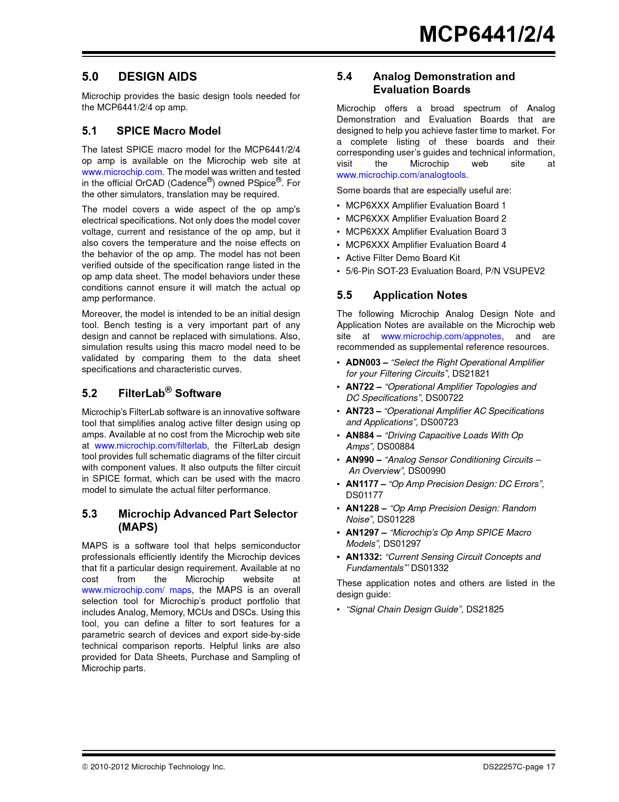 MCP6441/2/4. 5.0. DESIGN AIDS. 5.4. Analog Demonstration and Evaluation Boards. 5.1. SPICE Macro Model. 5.5. Application Notes. ADN003 –