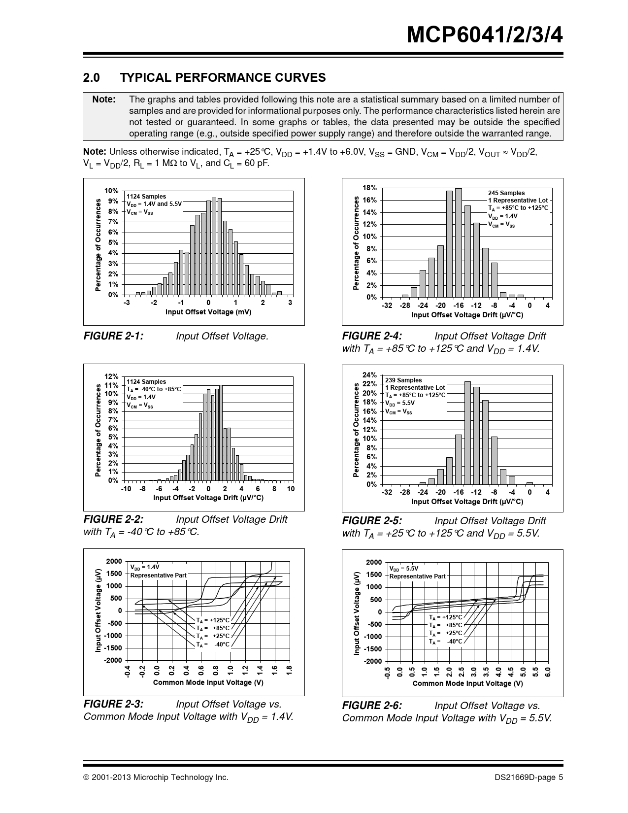 MCP6041/2/3/42.0TYPICAL PERFORMANCE CURVESNote: The graphs and tables provided following this note are a statistical summary based on a limited number of samples and are provided for informational purposes only. The performance characteristics listed herein are not tested or guaranteed. In some graphs or tables, the data presented may be outside the specified operating range (e.g., outside specified power supply range) and therefore outside the warranted range. Note: Unless otherwise indicated, T A = +25°C, VDD = +1.4V to +6.0V, VSS = GND, VCM = VDD/2, VOUT VDD/2, VL = VDD/2, RL = 1 M to VL, and CL = 60 pF. 10%18%245 Sampless1124 Samples9%s 16%V1 Representative LotDD = 1.4V and 5.5V8%TVA = +85°C to +125°CCM = VSS14%renceV7%rrenceDD = 1.4Vu 12%VCM = VSS6%10%5%Occ of 8%4%geage of Occur 3%6%ta n2%4%rceercent 1%e 2%PP0%0%-3-2-10123-32 -28 -24 -20 -16 -12-8-404Input Offset Voltage (mV)Input Offset Voltage Drift (µV/°C)FIGURE 2-1: Input Offset Voltage. FIGURE 2-4: Input Offset Voltage Drift with TA = +85°C to +125°C and VDD = 1.4V. 12%24%239 Samples11%s 22%es1124 Samples T1 Representative Lot10%A = -40°C to +85°C20%VTA = +85°C to +125°C9%DD = 1.4V18%VrrencVCM = VSSrrenceDD = 5.5V8%u 16%VCM = VSS7%14%6%Occ 12%5%of 10%4%geage of Occu8%3%taentn 6%2%ercrce 4%1%ePP 2%0%0%-10-8-6-4-20246810-32 -28 -24 -20 -16 -12-8-404Input Offset Voltage Drift (µV/°C)Input Offset Voltage Drift (µV/°C)FIGURE 2-2: Input Offset Voltage Drift FIGURE 2-5: Input Offset Voltage Drift with TA = -40°C to +85°C. with TA = +25°C to +125°C and VDD = 5.5V. 20002000)VDD = 1.4VV 1500)VDD = 5.5VRepresentative Part1500VRepresentative Part(µµ10001000e (ageglt500o500lta o0V0et VTA = +125°C-500TffsA = +125°Cset-500TTA = +85°CA = +85°Ct O -1000TTA = +25°CA = +25°Ct Off -1000uTA = -40°C-1500TInpuA = -40°Cp -1500In-2000-2000.4.2.5-0-00.00.20.40.60.81.01.21.41.61.8-00.00.51.01.52.02.53.03.54.04.55.05.56.0Common Mode Input Voltage (V)Common Mode Input Voltage (V)FIGURE 2-3: Input Offset Voltage vs. FIGURE 2-6: Input Offset Voltage vs. Common Mode Input Voltage with VDD = 1.4V. Common Mode Input Voltage with VDD = 5.5V. 2001-2013 Microchip Technology Inc. DS21669D-page 5 Document Outline 1.0 Electrical Characteristics FIGURE 1-1: Chip Select (CS) Timing Diagram (MCP6043 only). 1.1 Test Circuits FIGURE 1-2: AC and DC Test Circuit for Most Non-Inverting Gain Conditions. FIGURE 1-3: AC and DC Test Circuit for Most Inverting Gain Conditions. 2.0 Typical Performance Curves FIGURE 2-1: Input Offset Voltage. FIGURE 2-2: Input Offset Voltage Drift with TA = -40°C to +85°C. FIGURE 2-3: Input Offset Voltage vs. Common Mode Input Voltage with VDD = 1.4V. FIGURE 2-4: Input Offset Voltage Drift with TA = +85°C to +125°C and VDD = 1.4V. FIGURE 2-5: Input Offset Voltage Drift with TA = +25°C to +125°C and VDD = 5.5V. FIGURE 2-6: Input Offset Voltage vs. Common Mode Input Voltage with VDD = 5.5V. FIGURE 2-7: Input Offset Voltage vs. Output Voltage. FIGURE 2-8: Input Noise Voltage Density vs. Frequency. FIGURE 2-9: CMRR, PSRR vs. Frequency. FIGURE 2-10: The MCP6041/2/3/4 family shows no phase reversal. FIGURE 2-11: Input Noise Voltage Density vs. Common Mode Input Voltage. FIGURE 2-12: CMRR, PSRR vs. Ambient Temperature. FIGURE 2-13: Input Bias, Offset Currents vs. Ambient Temperature. FIGURE 2-14: Open-Loop Gain, Phase vs. Frequency. FIGURE 2-15: DC Open-Loop Gain vs. Power Supply Voltage. FIGURE 2-16: Input Bias, Offset Currents vs. Common Mode Input Voltage. FIGURE 2-17: DC Open-Loop Gain vs. Load Resistance. FIGURE 2-18: DC Open-Loop Gain vs. Output Voltage Headroom. FIGURE 2-19: Channel-to-Channel Separation vs. Frequency (MCP6042 and MCP6044 only). FIGURE 2-20: Gain Bandwidth Product, Phase Margin vs. Ambient Temperature with VDD = 1.4V. FIGURE 2-21: Quiescent Current vs. Power Supply Voltage. FIGURE 2-22: Gain Bandwidth Product, Phase Margin vs. Common Mode Input Voltage. FIGURE 2-23: Gain Bandwidth Product, Phase Margin vs. Ambient Temperature with VDD = 5.5V. FIGURE 2-24: Output Short Circuit Current vs. Power Supply Voltage. FIGURE 2-25: Output Voltage Headroom vs. Output Current Magnitude. FIGURE 2-26: Slew Rate vs. Ambient Temperature. FIGURE 2-27: Small Signal Non-inverting Pulse Response. FIGURE 2-28: Output Voltage Headroom vs. Ambient Temperature. FIGURE 2-29: Maximum Output Voltage Swing vs. Frequency. FIGURE 2-30: Small Signal Inverting Pulse Response. FIGURE 2-31: Large Signal Non-inverting Pulse Response. FIGURE 2-32: Chip Select (CS) to Amplifier Output Response Time (MCP6043 only). FIGURE 2-33: Input Current vs. Input Voltage (below VSS). FIGURE 2-34: Large Signal Inverting Pulse Response. FIGURE 2-35: Chip Select (CS) Hysteresis (MCP6043 only). 3.0 Pin Descriptions TABLE 3-1: Pin Function Table 3.1 Analog Outputs 3.2 Analog Inputs 3.3 Chip Select Digital Input 3.4 Power Supply Pins 4.0 Applications Information 4.1 Rail-to-Rail Input FIGURE 4-1: Simplified Analog Input ESD Structures. FIGURE 4-2: Protecting the Analog Inputs. 4.2 Rail-to-Rail Output 4.3 Output Loads and Battery Life 4.4 Capacitive Loads FIGURE 4-3: Output Resistor, RISO Stabilizes Large Capacitive Loads. FIGURE 4-4: Recommended RISO Values for Capacitive Loads. 4.5 MCP6043 Chip Select 4.6 Supply Bypass 4.7 Unused Op Amps FIGURE 4-5: Unused Op Amps. 4.8 PCB Surface Leakage FIGURE 4-6: Example Guard Ring Layout for Inverting Gain. 4.9 Application Circuits FIGURE 4-7: High-Side Battery Current Sensor. FIGURE 4-8: Two Op Amp Instrumentation Amplifier. 5.0 Design Aids 5.1 SPICE Macro Model 5.2 FilterLab® Software 5.3 MAPS (Microchip Advanced Part Selector) 5.4 Analog Demonstration and Evaluation Boards 5.5 Application Notes 6.0 Packaging Information 6.1 Package Marking Information Appendix A: Revision History Product Identification System Trademarks Worldwide Sales and Service
