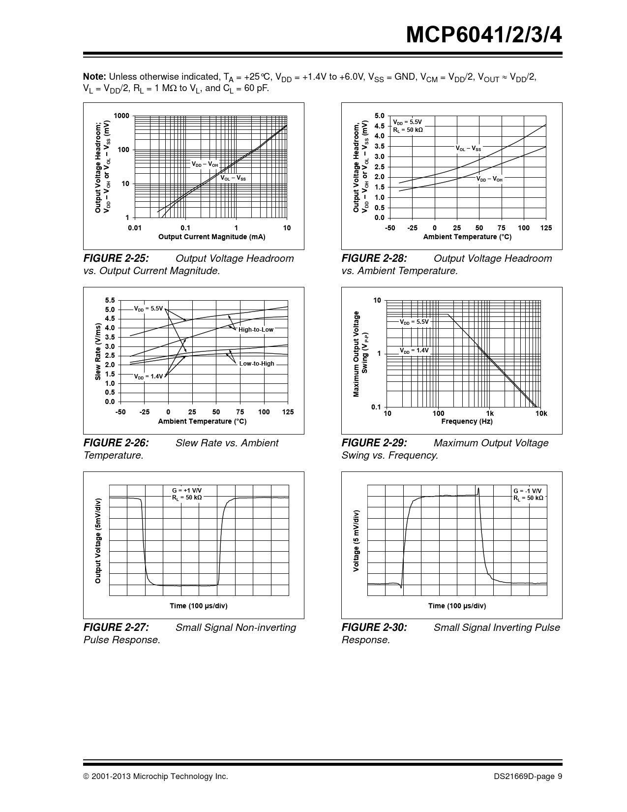 MCP6041/2/3/4Note: Unless otherwise indicated, T A = +25°C, VDD = +1.4V to +6.0V, VSS = GND, VCM = VDD/2, VOUT VDD/2, VL = VDD/2, RL = 1 M to VL, and CL = 60 pF. 10005.0;),)VDD = 5.5VmVV 4.5oomRL = 50 kΩo(mo(m 4.0SSSSV100V 3.5adrVeadrOL – VSS–e–H3.0HOLVOLVDD – VOH2.5ageVltageltoorVor 2.0OL – VSSV10oDD – VOHt VOHOH1.5t VVtpu– V– 1.0tpuDDOuV0.5OuV DD10.00.010.1110-50-250255075100125Output Current Magnitude (mA)Ambient Temperature (°C)FIGURE 2-25: Output Voltage Headroom FIGURE 2-28: Output Voltage Headroom vs. Output Current Magnitude. vs. Ambient Temperature. 5.5105.0VDD = 5.5Ve4.5VDD = 5.5V4.0ltagHigh-to-Lowo/ms))3.5VP(VP-3.0ut tpVVate 2.5ug (1DD = 1.4VR 2.0Low-to-HighOinmlew 1.5uSwSVDD = 1.4Vm1.0 0.5Maxi0.00.1-50-250255075100125101001k10kAmbient Temperature (°C)1.E+011.E+021.E+031.E+04Frequency (Hz)FIGURE 2-26: Slew Rate vs. Ambient FIGURE 2-29: Maximum Output Voltage Temperature. Swing vs. Frequency. 2525G = +1 V/VG = -1 V/V20)R20L = 50 kΩRL = 50 kΩ15/div15)10Vivm10/d5(55Ve 005 mltag-5o-5e (ag-10ut V-10lto-15tp-15V-20Ou-20-25-250.00.10.20.3 T 0.4ime 0.5(100 0.µs 6/div) 0.70.80.91.00.00.10.20.30.4Time 0.5(100 0.µs/ 6div) 0.70.80.91.0FIGURE 2-27: Small Signal Non-inverting FIGURE 2-30: Small Signal Inverting Pulse Pulse Response. Response. 2001-2013 Microchip Technology Inc. DS21669D-page 9 Document Outline 1.0 Electrical Characteristics FIGURE 1-1: Chip Select (CS) Timing Diagram (MCP6043 only). 1.1 Test Circuits FIGURE 1-2: AC and DC Test Circuit for Most Non-Inverting Gain Conditions. FIGURE 1-3: AC and DC Test Circuit for Most Inverting Gain Conditions. 2.0 Typical Performance Curves FIGURE 2-1: Input Offset Voltage. FIGURE 2-2: Input Offset Voltage Drift with TA = -40°C to +85°C. FIGURE 2-3: Input Offset Voltage vs. Common Mode Input Voltage with VDD = 1.4V. FIGURE 2-4: Input Offset Voltage Drift with TA = +85°C to +125°C and VDD = 1.4V. FIGURE 2-5: Input Offset Voltage Drift with TA = +25°C to +125°C and VDD = 5.5V. FIGURE 2-6: Input Offset Voltage vs. Common Mode Input Voltage with VDD = 5.5V. FIGURE 2-7: Input Offset Voltage vs. Output Voltage. FIGURE 2-8: Input Noise Voltage Density vs. Frequency. FIGURE 2-9: CMRR, PSRR vs. Frequency. FIGURE 2-10: The MCP6041/2/3/4 family shows no phase reversal. FIGURE 2-11: Input Noise Voltage Density vs. Common Mode Input Voltage. FIGURE 2-12: CMRR, PSRR vs. Ambient Temperature. FIGURE 2-13: Input Bias, Offset Currents vs. Ambient Temperature. FIGURE 2-14: Open-Loop Gain, Phase vs. Frequency. FIGURE 2-15: DC Open-Loop Gain vs. Power Supply Voltage. FIGURE 2-16: Input Bias, Offset Currents vs. Common Mode Input Voltage. FIGURE 2-17: DC Open-Loop Gain vs. Load Resistance. FIGURE 2-18: DC Open-Loop Gain vs. Output Voltage Headroom. FIGURE 2-19: Channel-to-Channel Separation vs. Frequency (MCP6042 and MCP6044 only). FIGURE 2-20: Gain Bandwidth Product, Phase Margin vs. Ambient Temperature with VDD = 1.4V. FIGURE 2-21: Quiescent Current vs. Power Supply Voltage. FIGURE 2-22: Gain Bandwidth Product, Phase Margin vs. Common Mode Input Voltage. FIGURE 2-23: Gain Bandwidth Product, Phase Margin vs. Ambient Temperature with VDD = 5.5V. FIGURE 2-24: Output Short Circuit Current vs. Power Supply Voltage. FIGURE 2-25: Output Voltage Headroom vs. Output Current Magnitude. FIGURE 2-26: Slew Rate vs. Ambient Temperature. FIGURE 2-27: Small Signal Non-inverting Pulse Response. FIGURE 2-28: Output Voltage Headroom vs. Ambient Temperature. FIGURE 2-29: Maximum Output Voltage Swing vs. Frequency. FIGURE 2-30: Small Signal Inverting Pulse Response. FIGURE 2-31: Large Signal Non-inverting Pulse Response. FIGURE 2-32: Chip Select (CS) to Amplifier Output Response Time (MCP6043 only). FIGURE 2-33: Input Current vs. Input Voltage (below VSS). FIGURE 2-34: Large Signal Inverting Pulse Response. FIGURE 2-35: Chip Select (CS) Hysteresis (MCP6043 only). 3.0 Pin Descriptions TABLE 3-1: Pin Function Table 3.1 Analog Outputs 3.2 Analog Inputs 3.3 Chip Select Digital Input 3.4 Power Supply Pins 4.0 Applications Information 4.1 Rail-to-Rail Input FIGURE 4-1: Simplified Analog Input ESD Structures. FIGURE 4-2: Protecting the Analog Inputs. 4.2 Rail-to-Rail Output 4.3 Output Loads and Battery Life 4.4 Capacitive Loads FIGURE 4-3: Output Resistor, RISO Stabilizes Large Capacitive Loads. FIGURE 4-4: Recommended RISO Values for Capacitive Loads. 4.5 MCP6043 Chip Select 4.6 Supply Bypass 4.7 Unused Op Amps FIGURE 4-5: Unused Op Amps. 4.8 PCB Surface Leakage FIGURE 4-6: Example Guard Ring Layout for Inverting Gain. 4.9 Application Circuits FIGURE 4-7: High-Side Battery Current Sensor. FIGURE 4-8: Two Op Amp Instrumentation Amplifier. 5.0 Design Aids 5.1 SPICE Macro Model 5.2 FilterLab® Software 5.3 MAPS (Microchip Advanced Part Selector) 5.4 Analog Demonstration and Evaluation Boards 5.5 Application Notes 6.0 Packaging Information 6.1 Package Marking Information Appendix A: Revision History Product Identification System Trademarks Worldwide Sales and Service