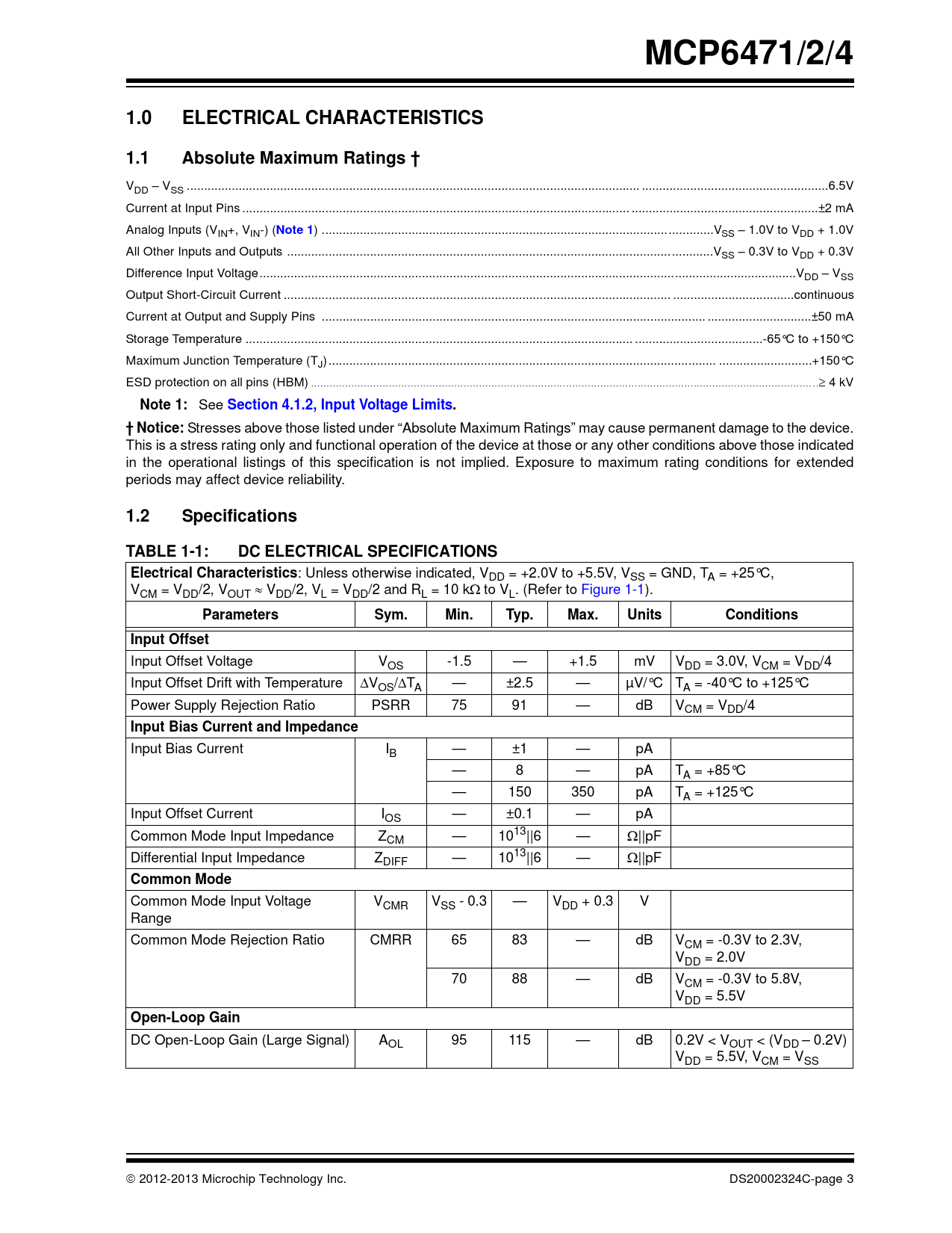 MCP6471/2/4 1.0 ELECTRICAL CHARACTERISTICS 1.1 Absolute Maximum Ratings † Note 1 Note 1: Section 4.1.2, Input Voltage Limits