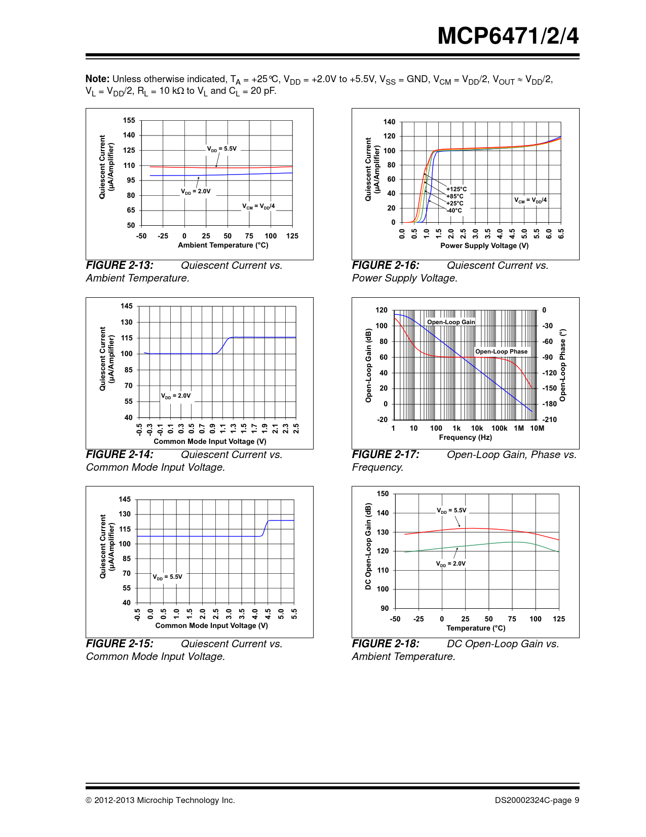 DC Open-Loop Gain vs. Common Mode Input Voltage. Ambient Temperature.  2012-2013 Microchip Technology Inc. DS20002324C-page 9 Document Outline Package Types Typical Application 1.0 Electrical Characteristics 1.1 Absolute Maximum Ratings 1.2 Specifications TABLE 1-1: DC Electrical Specifications TABLE 1-2: AC Electrical Specifications TABLE 1-3: Temperature Specifications 1.3 Test Circuits FIGURE 1-1: AC and DC Test Circuit for Most Specifications. 2.0 Typical Performance Curves FIGURE 2-1: Input Offset Voltage. FIGURE 2-2: Input Offset Voltage Drift. FIGURE 2-3: Input Offset Voltage vs. Common Mode Input Voltage. FIGURE 2-4: Input Offset Voltage vs. Common Mode Input Voltage. FIGURE 2-5: Input Offset Voltage vs. Output Voltage. FIGURE 2-6: Input Offset Voltage vs. Power Supply Voltage. FIGURE 2-7: Input Noise Voltage Density vs. Frequency. FIGURE 2-8: Input Noise Voltage Density vs. Common Mode Input Voltage. FIGURE 2-9: CMRR, PSRR vs. Frequency. FIGURE 2-10: CMRR, PSRR vs. Ambient Temperature. FIGURE 2-11: Input Bias, Offset Currents vs. Ambient Temperature. FIGURE 2-12: Input Bias Current vs. Common Mode Input Voltage. FIGURE 2-13: Quiescent Current vs. Ambient Temperature. FIGURE 2-14: Quiescent Current vs. Common Mode Input Voltage. FIGURE 2-15: Quiescent Current vs. Common Mode Input Voltage. FIGURE 2-16: Quiescent Current vs. Power Supply Voltage. FIGURE 2-17: Open-Loop Gain, Phase vs. Frequency. FIGURE 2-18: DC Open-Loop Gain vs. Ambient Temperature. FIGURE 2-19: Gain Bandwidth Product, Phase Margin vs. Ambient Temperature. FIGURE 2-20: Gain Bandwidth Product, Phase Margin vs. Ambient Temperature. FIGURE 2-21: Output Short Circuit Current vs. Power Supply Voltage. FIGURE 2-22: Output Voltage Swing vs. Frequency. FIGURE 2-23: Output Voltage Headroom vs. Output Current. FIGURE 2-24: Output Voltage Headroom vs. Output Current. FIGURE 2-25: Output Voltage Headroom vs. Ambient Temperature. FIGURE 2-26: Output Voltage Headroom vs. Ambient Temperature. FIGURE 2-27: Slew Rate vs. Ambient Temperature. FIGURE 2-28: Small Signal Non-Inverting Pulse Response. FIGURE 2-29: Small Signal Inverting Pulse Response. FIGURE 2-30: Large Signal Non-Inverting Pulse Response. FIGURE 2-31: Large Signal Inverting Pulse Response. FIGURE 2-32: The MCP6471/2/4 Shows No Phase Reversal. FIGURE 2-33: Closed Loop Output Impedance vs. Frequency. FIGURE 2-34: Measured Input Current vs. Input Voltage (below VSS). FIGURE 2-35: Channel-to-Channel Separation vs. Frequency (MCP6472/4 only). 3.0 Pin Descriptions TABLE 3-1: Pin Function Table 3.1 Analog Outputs 3.2 Analog Inputs 3.3 Power Supply Pins 3.4 Exposed Thermal Pad (EP) 4.0 Application Information 4.1 Inputs FIGURE 4-1: Simplified Analog Input ESD Structures. FIGURE 4-2: Protecting the Analog Inputs. FIGURE 4-3: Protecting the Analog Inputs. 4.2 Rail-to-Rail Output 4.3 Capacitive Loads FIGURE 4-4: Output Resistor, RISO Stabilizes Large Capacitive Loads. FIGURE 4-5: Recommended RISO Values for Capacitive Loads. 4.4 Supply Bypass 4.5 Unused Op Amps FIGURE 4-6: Unused Op Amps. 4.6 PCB Surface Leakage FIGURE 4-7: Example Guard Ring Layout for Inverting Gain. 4.7 Application Circuits FIGURE 4-8: Photovoltaic Mode Detector. FIGURE 4-9: Photoconductive Mode Detector. FIGURE 4-10: Second-Order, Low-Pass Butterworth Filter with Sallen-Key Topology. FIGURE 4-11: Second-Order, Low-Pass Butterworth Filter with Multiple-Feedback Topology. FIGURE 4-12: pH Electrode Amplifier. 5.0 Design Aids 5.1 SPICE Macro Model 5.2 FilterLab Software 5.3 MAPS (Microchip Advanced Part Selector) 5.4 Analog Demonstration and Evaluation Boards 5.5 Application Notes 6.0 Packaging Information 6.1 Package Marking Information Appendix A: Revision History Product Identification System Trademarks Worldwide Sales and Service