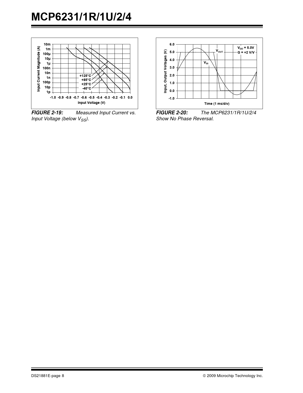 The MCP6231/1R/1U/2/4 Input Voltage (below VSS). Show No Phase Reversal. DS21881E-page 8 © 2009 Microchip Technology Inc. Document Outline 1.0 Electrical Characteristics 1.1 Test Circuits FIGURE 1-1: AC and DC Test Circuit for Most Non-Inverting Gain Conditions. FIGURE 1-2: AC and DC Test Circuit for Most Inverting Gain Conditions. 2.0 Typical Performance Curves FIGURE 2-1: Input Offset Voltage. FIGURE 2-2: PSRR, CMRR vs. Frequency. FIGURE 2-3: Input Bias Current at +85°C. FIGURE 2-4: CMRR, PSRR vs. Ambient Temperature. FIGURE 2-5: Open-Loop Gain, Phase vs. Frequency. FIGURE 2-6: Input Bias Current at +125°C. FIGURE 2-7: Input Noise Voltage Density vs. Frequency. FIGURE 2-8: Input Offset Voltage vs. Common Mode Input Voltage at VDD = 1.8V. FIGURE 2-9: Input Offset Voltage vs. Common Mode Input Voltage at VDD = 5.5V. FIGURE 2-10: Input Offset Voltage Drift. FIGURE 2-11: Input Offset Voltage vs. Output Voltage. FIGURE 2-12: Output Short-Circuit Current vs. Ambient Temperature. FIGURE 2-13: Slew Rate vs. Ambient Temperature. FIGURE 2-14: Output Voltage Headroom vs. Output Current Magnitude. FIGURE 2-15: Maximum Output Voltage Swing vs. Frequency. FIGURE 2-16: Small-Signal, Non-Inverting Pulse Response. FIGURE 2-17: Large-Signal, Non-Inverting Pulse Response. FIGURE 2-18: Quiescent Current vs. Power Supply Voltage. FIGURE 2-19: Measured Input Current vs. Input Voltage (below VSS). FIGURE 2-20: The MCP6231/1R/1U/2/4 Show No Phase Reversal. 3.0 Pin Descriptions TABLE 3-1: Pin Function Table for Single Op Amps TABLE 3-2: Pin Function Table for Dual and Quad Op Amps 3.1 Analog Outputs 3.2 Analog Inputs 3.3 Power Supply (VSS and VDD) 3.4 Exposed Thermal Pad (EP) 4.0 Application Information 4.1 Rail-to-Rail Inputs FIGURE 4-1: The MCP6231/1R/1U/2/4 Show No Phase Reversal. FIGURE 4-2: Simplified Analog Input ESD Structures. FIGURE 4-3: Protecting the Analog Inputs. 4.2 Rail-to-Rail Output 4.3 Capacitive Loads FIGURE 4-4: Output resistor, RISO stabilizes large capacitive loads. FIGURE 4-5: Recommended RISO Values for Capacitive Loads. 4.4 Supply Bypass 4.5 Unused Op Amps FIGURE 4-6: Unused Op Amps. 4.6 PCB Surface Leakage FIGURE 4-7: Example Guard Ring Layout for Inverting Gain. 4.7 Application Circuits FIGURE 4-8: Summing Amplifier Circuit. FIGURE 4-9: Effect of Parasitic Capacitance at the Input. 5.0 Design Aids 5.1 SPICE Macro Model 5.2 FilterLab® Software 5.3 Mindi™ Circuit Designer & Simulator 5.4 Microchip Advanced Part Selector (MAPS) 5.5 Analog Demonstration and Evaluation Boards 5.6 Application Notes 6.0 Packaging Information 6.1 Package Marking Information