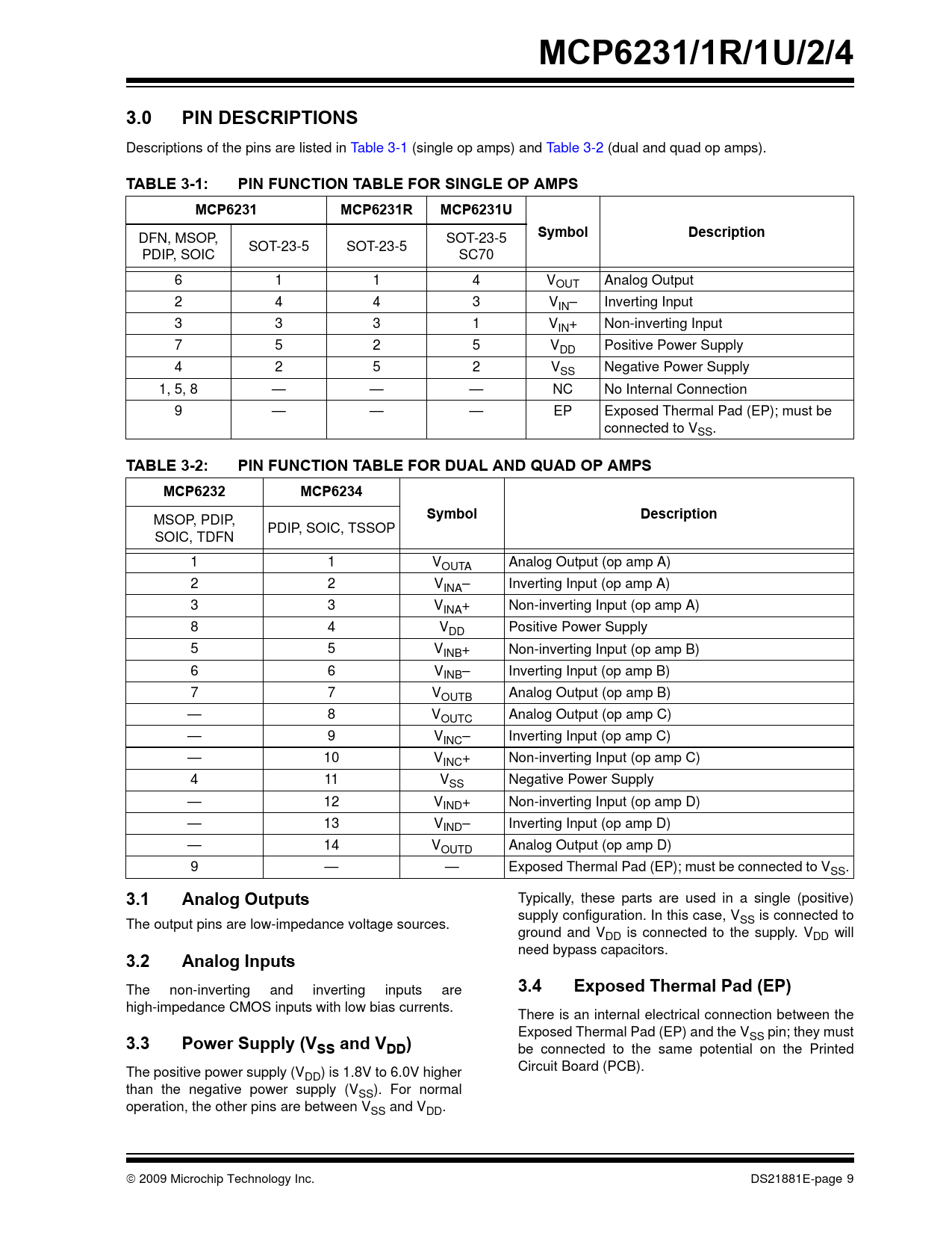 | Pages / Page | 40 / 9 — MCP6231/1R/1U/2/4. 3.0. PIN DESCRIPTIONS. TABLE 3-1:. PIN FUNCTION TABLE … |