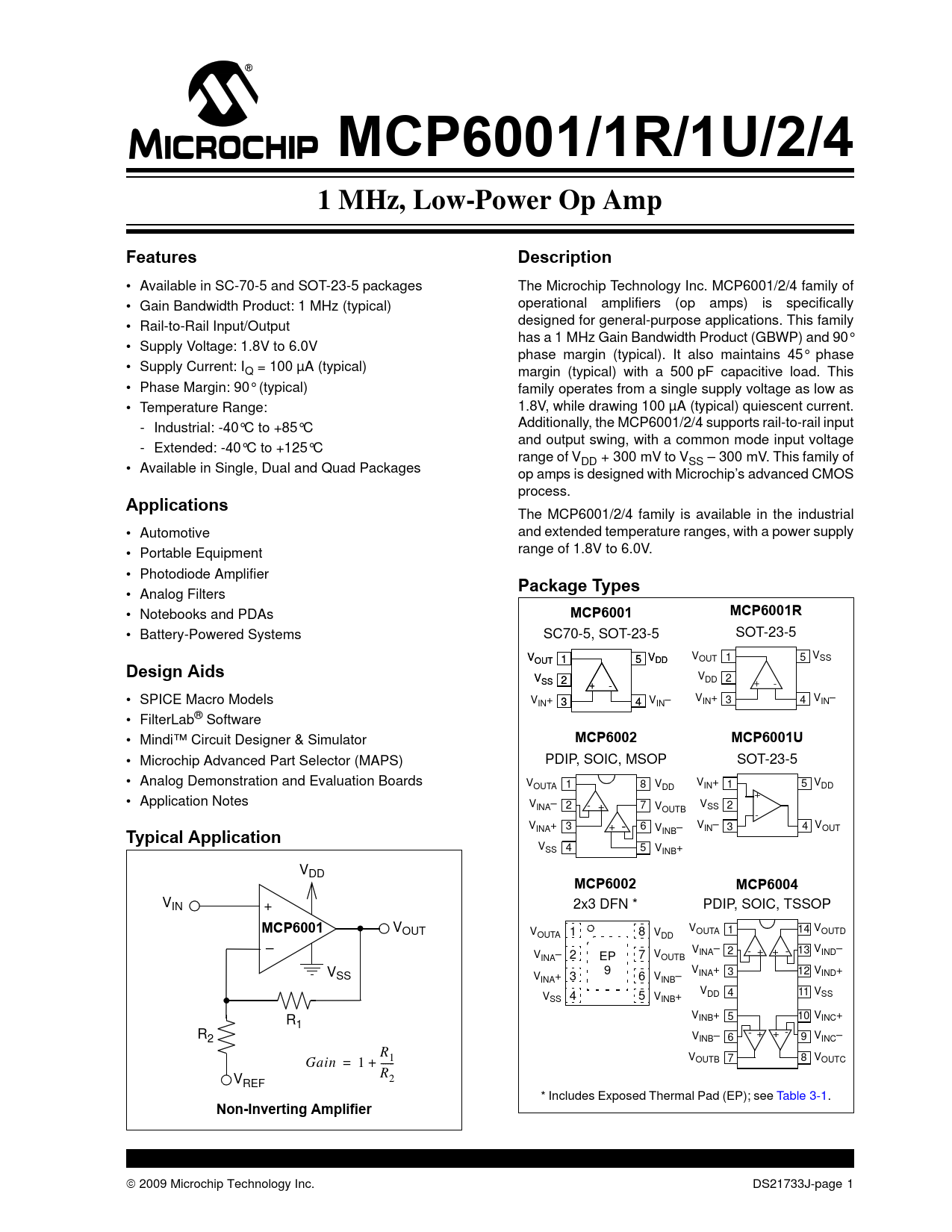 MCP6001/1R/1U/2/4. 1 MHz, Low-Power Op Amp. Features. Description. Applications. Package Types. MCP6001. MCP6001R. Design Aids. MCP6002