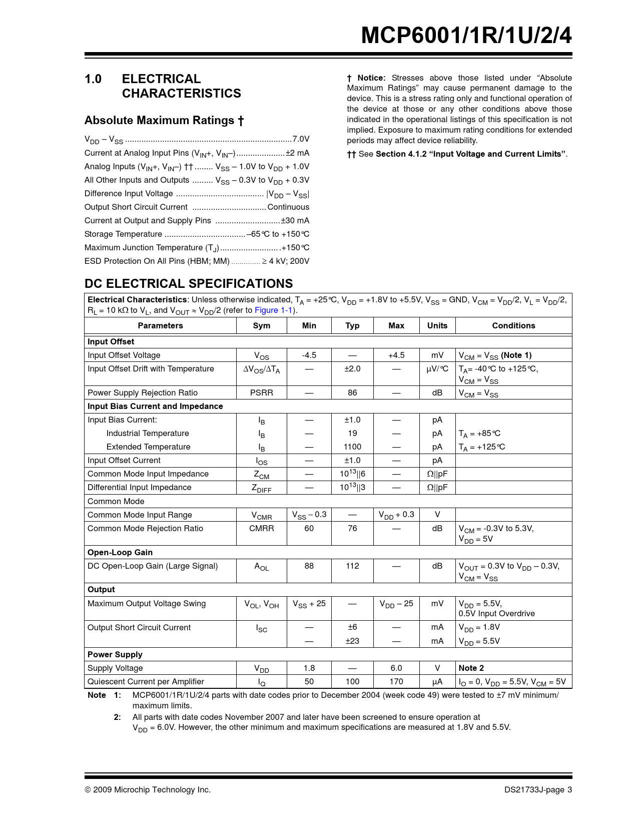 MCP6001/1R/1U/2/4 1.0 ELECTRICAL † Notice: