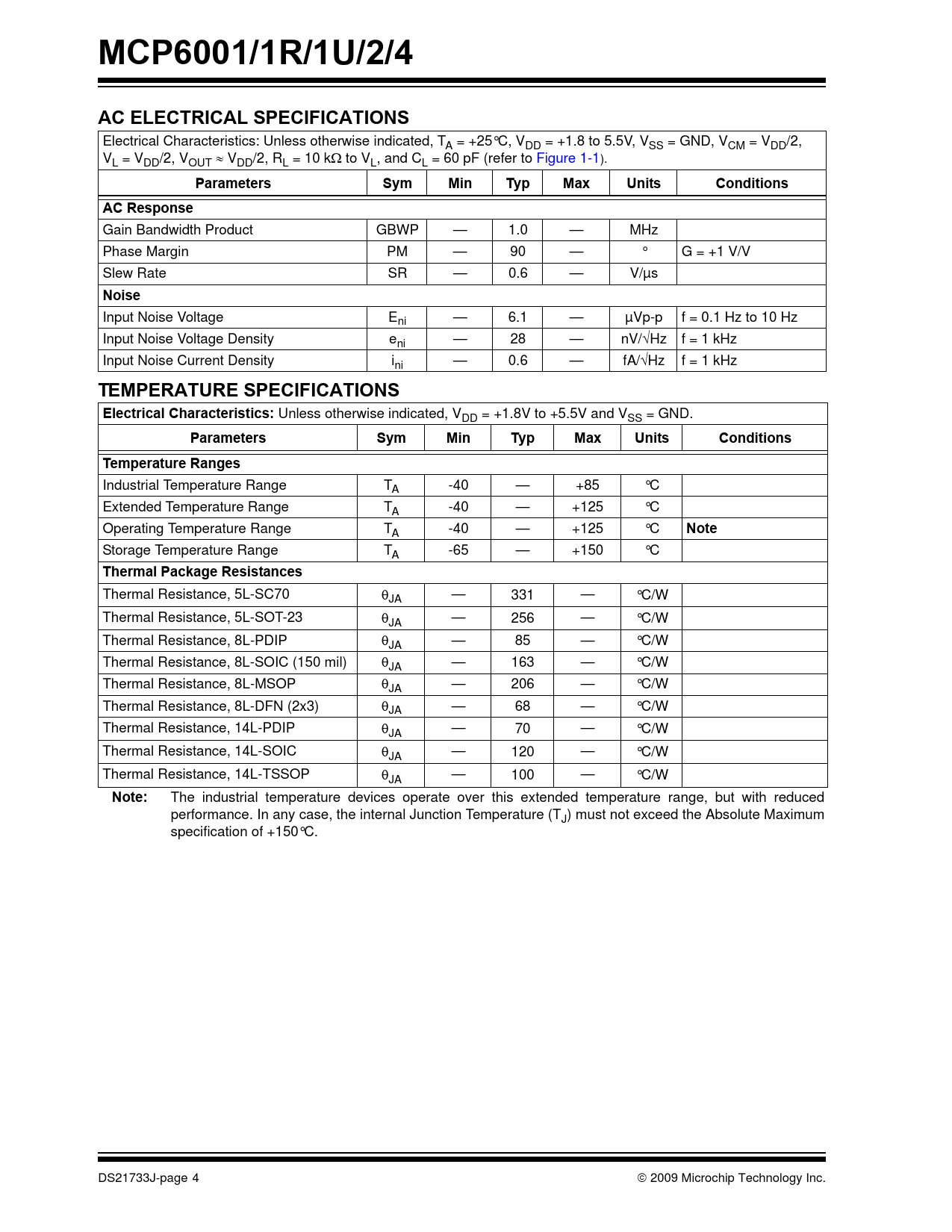 The industrial temperature devices operate over this extended temperature range, but with reduced performance. In any case, the internal Junction Temperature (TJ) must not exceed the Absolute Maximum specification of +150°C. DS21733J-page 4 © 2009 Microchip Technology Inc. Document Outline 1.0 Electrical Characteristics 1.1 Test Circuits FIGURE 1-1: AC and DC Test Circuit for Most Specifications. 2.0 Typical Performance Curves FIGURE 2-1: Input Offset Voltage. FIGURE 2-2: Input Offset Voltage Drift. FIGURE 2-3: Input Offset Quadratic Temp. Co. FIGURE 2-4: Input Offset Voltage vs. Common Mode Input Voltage at VDD = 1.8V. FIGURE 2-5: Input Offset Voltage vs. Common Mode Input Voltage at VDD = 5.5V. FIGURE 2-6: Input Offset Voltage vs. Output Voltage. FIGURE 2-7: Input Bias Current at +85°C. FIGURE 2-8: Input Bias Current at +125°C. FIGURE 2-9: CMRR, PSRR vs. Ambient Temperature. FIGURE 2-10: PSRR, CMRR vs. Frequency. FIGURE 2-11: Open-Loop Gain, Phase vs. Frequency. FIGURE 2-12: Input Noise Voltage Density vs. Frequency. FIGURE 2-13: Output Short Circuit Current vs. Power Supply Voltage. FIGURE 2-14: Output Voltage Headroom vs. Output Current Magnitude. FIGURE 2-15: Quiescent Current vs. Power Supply Voltage. FIGURE 2-16: Small-Signal, Non-Inverting Pulse Response. FIGURE 2-17: Large-Signal, Non-Inverting Pulse Response. FIGURE 2-18: Slew Rate vs. Ambient Temperature. FIGURE 2-19: Output Voltage Swing vs. Frequency. FIGURE 2-20: Measured Input Current vs. Input Voltage (below VSS). FIGURE 2-21: The MCP6001/2/4 Show No Phase Reversal. 3.0 Pin Descriptions TABLE 3-1: Pin Function Table 3.1 Analog Outputs 3.2 Analog Inputs 3.3 Power Supply Pins 3.4 Exposed Thermal Pad (EP) 4.0 Application Information 4.1 Rail-to-Rail Inputs FIGURE 4-1: Simplified Analog Input ESD Structures. FIGURE 4-2: Protecting the Analog Inputs. 4.2 Rail-to-Rail Output 4.3 Capacitive Loads FIGURE 4-3: Output resistor, RISO stabilizes large capacitive loads. FIGURE 4-4: Recommended RISO values for Capacitive Loads. 4.4 Supply Bypass 4.5 Unused Op Amps FIGURE 4-5: Unused Op Amps. 4.6 PCB Surface Leakage FIGURE 4-6: Example Guard Ring Layout for Inverting Gain. 4.7 Application Circuits FIGURE 4-7: Instrumentation Amplifier with Unity-Gain Buffer Inputs. FIGURE 4-8: Active Second-Order Low-Pass Filter. FIGURE 4-9: Peak Detector with Clear and Sample CMOS Analog Switches. 5.0 Design AIDS 5.1 SPICE Macro Model 5.2 FilterLab® Software 5.3 Mindi™ Circuit Designer & Simulator 5.4 Microchip Advanced Part Selector (MAPS) 5.5 Analog Demonstration and Evaluation Boards 5.6 Application Notes 6.0 Packaging Information 6.1 Package Marking Information