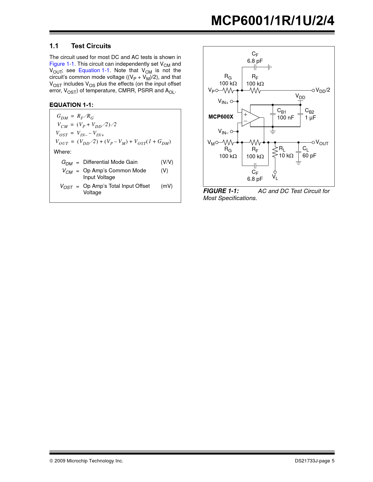| Pages / Page | 42 / 5 — MCP6001/1R/1U/2/4. 1.1. Test Circuits. EQUATION 1-1:. MCP600X. FIGURE 1-1: |