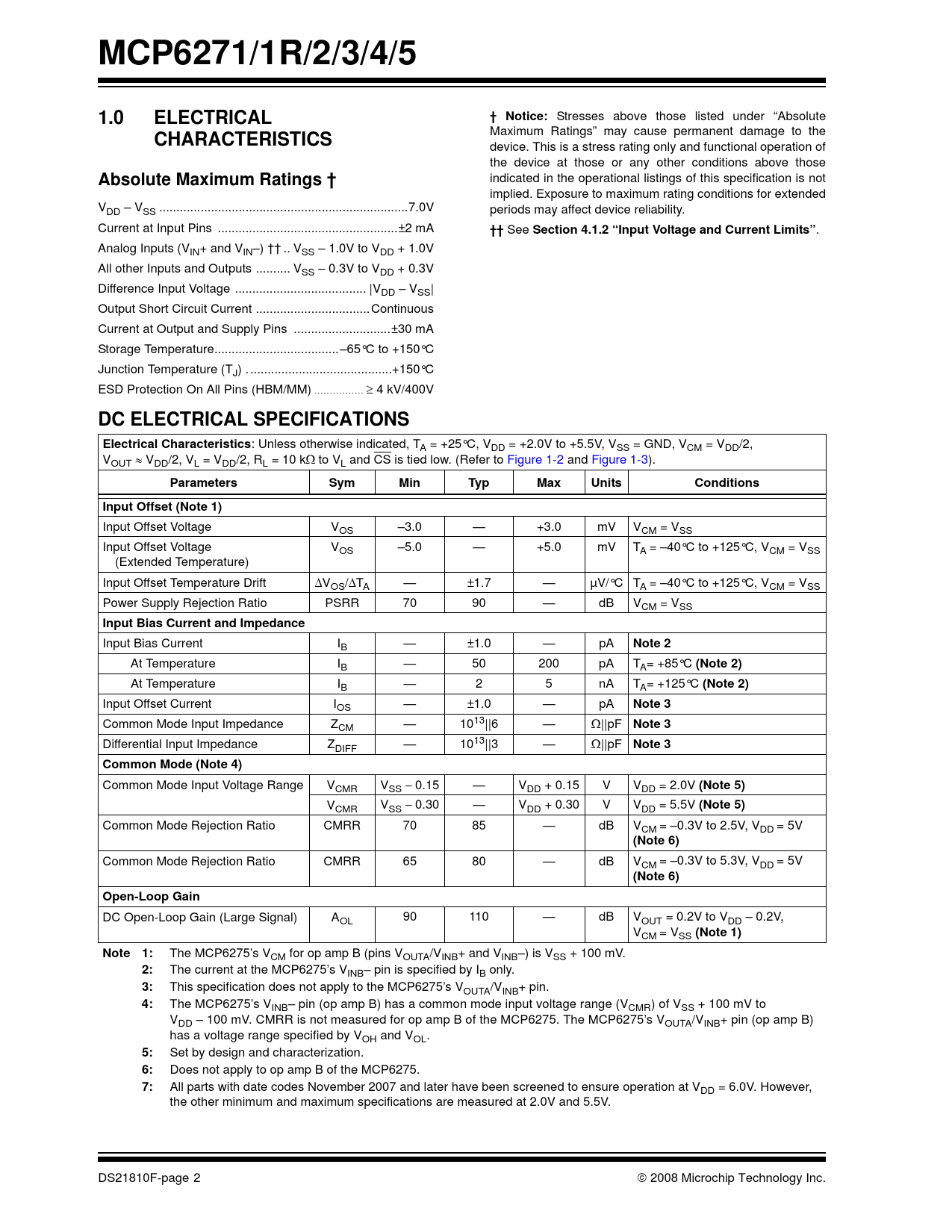 | Pages / Page | 36 / 2 — MCP6271/1R/2/3/4/5. 1.0. ELECTRICAL. † Notice:. CHARACTERISTICS. Absolute … |
