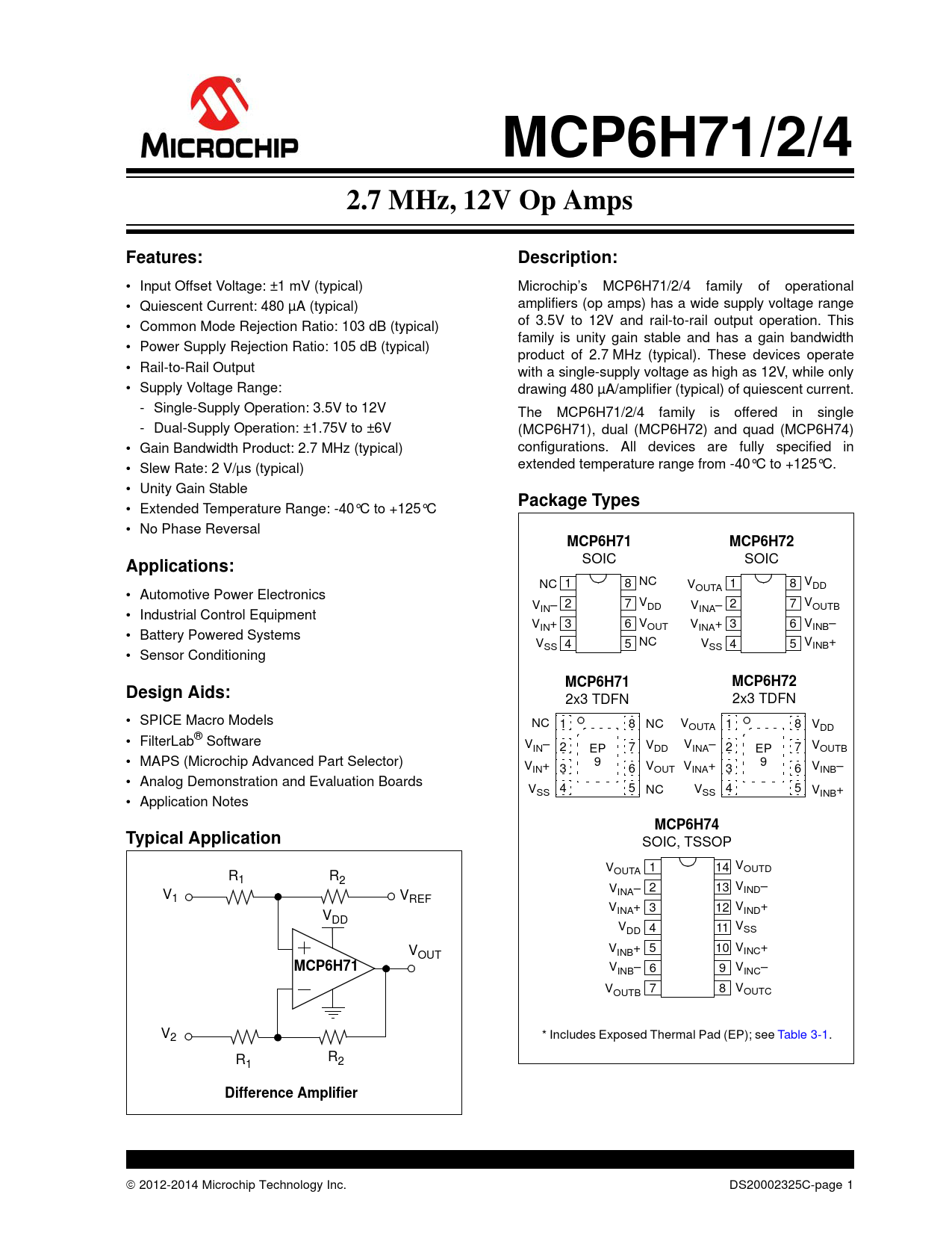 link to page 15 MCP6H71/2/42.7 MHz, 12V Op AmpsFeatures:Description: • Input Offset Voltage: ±1 mV (typical) Microchip’s MCP6H71/2/4 family of operational • Quiescent Current: 480 µA (typical) amplifiers (op amps) has a wide supply voltage range • Common Mode Rejection Ratio: 103 dB (typical) of 3.5V to 12V and rail-to-rail output operation. This family is unity gain stable and has a gain bandwidth • Power Supply Rejection Ratio: 105 dB (typical) product of 2.7 MHz (typical). These devices operate • Rail-to-Rail Output with a single-supply voltage as high as 12V, while only • Supply Voltage Range: drawing 480 µA/amplifier (typical) of quiescent current. - Single-Supply Operation: 3.5V to 12V The MCP6H71/2/4 family is offered in single - Dual-Supply Operation: ±1.75V to ±6V (MCP6H71), dual (MCP6H72) and quad (MCP6H74) • Gain Bandwidth Product: 2.7 MHz (typical) configurations. All devices are fully specified in • Slew Rate: 2 V/µs (typical) extended temperature range from -40°C to +125°C. • Unity Gain Stable Package Types • Extended Temperature Range: -40°C to +125°C • No Phase Reversal MCP6H71MCP6H72Applications: SOIC SOIC NC 1 8 NC V 1 8 V OUTA DD • Automotive Power Electronics V 2 7 VDD V 2 7 VOUTB • Industrial Control Equipment IN– INA– V 3 6 V V IN+ OUT INA+ 3 6 VINB– • Battery Powered Systems V 4 5 NC V V SS SS 4 5 INB+ • Sensor Conditioning MCP6H71MCP6H72Design Aids: 2x3 TDFN 2x3 TDFN • SPICE Macro Models NC 1 8 NC VOUTA 1 8 VDD • FilterLab® Software VIN– 2 EP 7 VDD VINA– 2 EP 7 VOUTB • MAPS (Microchip Advanced Part Selector) 9 V 9 IN+ 3 6 VOUT VINA+ 3 6 VINB– • Analog Demonstration and Evaluation Boards V 4 5 NC SS V 4 5 V SS INB+ • Application Notes MCP6H74Typical Application SOIC, TSSOP V 1 14 VOUTD R OUTA 1 R2 2 13 V V V V INA– IND– 1 REF V 3 12 V V INA+ IND+ DD V V DD 4 11 SS V V OUT INB+ 5 10 VINC+ MCP6H71 VINB– 6 9 VINC– VOUTB 7 8 VOUTC V2 * Includes Exposed Thermal Pad (EP); see Table 3-1. R R 1 2 Difference Amplifier 2012-2014 Microchip Technology Inc. DS20002325C-page 1 Document Outline Features Applications Design Aids Description Package Types 1.0 Electrical Characteristics 1.1 Absolute Maximum Ratings † 1.2 Test Circuits FIGURE 1-1: AC and DC Test Circuit for Most Specifications. 2.0 Typical Performance Curves FIGURE 2-1: Input Offset Voltage. FIGURE 2-2: Input Offset Voltage Drift. FIGURE 2-3: Input Offset Voltage vs. Common Mode Input Voltage. FIGURE 2-4: Input Offset Voltage vs. Common Mode Input Voltage. FIGURE 2-5: Input Offset Voltage vs. Common Mode Input Voltage. FIGURE 2-6: Input Offset Voltage vs. Output Voltage. FIGURE 2-7: Input Offset Voltage vs. Power Supply Voltage. FIGURE 2-8: Input Noise Voltage Density vs. Frequency. FIGURE 2-9: Input Noise Voltage Density vs. Common Mode Input Voltage. FIGURE 2-10: CMRR, PSRR vs. Frequency. FIGURE 2-11: CMRR, PSRR vs. Ambient Temperature. FIGURE 2-12: Input Bias, Offset Currents vs. Ambient Temperature. FIGURE 2-13: Input Bias Current vs. Common Mode Input Voltage. FIGURE 2-14: Quiescent Current vs. Ambient Temperature. FIGURE 2-15: Quiescent Current vs. Power Supply Voltage. FIGURE 2-16: Open-Loop Gain, Phase vs. Frequency. FIGURE 2-17: DC Open-Loop Gain vs. Power Supply Voltage. FIGURE 2-18: DC Open-Loop Gain vs. Output Voltage Headroom. FIGURE 2-19: Channel-to-Channel Separation vs. Frequency (MCP6H72/4 only). FIGURE 2-20: Gain Bandwidth Product, Phase Margin vs. Ambient Temperature. FIGURE 2-21: Gain Bandwidth Product, Phase Margin vs. Ambient Temperature. FIGURE 2-22: Output Short Circuit Current vs. Power Supply Voltage. FIGURE 2-23: Output Voltage Swing vs. Frequency. FIGURE 2-24: Output Voltage Headroom vs. Output Current. FIGURE 2-25: Output Voltage Headroom vs. Output Current. FIGURE 2-26: Output Voltage Headroom vs. Output Current. FIGURE 2-27: Output Voltage Headroom vs. Ambient Temperature. FIGURE 2-28: Output Voltage Headroom vs. Ambient Temperature. FIGURE 2-29: Output Voltage Headroom vs. Ambient Temperature. FIGURE 2-30: Slew Rate vs. Ambient Temperature. FIGURE 2-31: Slew Rate vs. Ambient Temperature. FIGURE 2-32: Small Signal Non-Inverting Pulse Response. FIGURE 2-33: Small Signal Inverting Pulse Response. FIGURE 2-34: Large Signal Non-Inverting Pulse Response. FIGURE 2-35: Large Signal Inverting Pulse Response. FIGURE 2-36: The MCP6H71/2/4 Shows No Phase Reversal. FIGURE 2-37: Closed-Loop Output Impedance vs. Frequency. FIGURE 2-38: Measured Input Current vs. Input Voltage (below VSS). 3.0 Pin Descriptions TABLE 3-1: Pin Function Table 3.1 Analog Outputs 3.2 Analog Inputs 3.3 Power Supply Pins 3.4 Exposed Thermal Pad (EP) 4.0 Application Information 4.1 Inputs FIGURE 4-1: Simplified Analog Input ESD Structures. FIGURE 4-2: Protecting the Analog Inputs. FIGURE 4-3: Protecting the Analog Inputs. 4.2 Rail-to-Rail Output 4.3 Capacitive Loads FIGURE 4-4: Output Resistor, RISO Stabilizes Large Capacitive Loads. FIGURE 4-5: Recommended RISO Values for Capacitive Loads. 4.4 Supply Bypass 4.5 Unused Op Amps FIGURE 4-6: Unused Op Amps. 4.6 PCB Surface Leakage FIGURE 4-7: Example Guard Ring Layout for Inverting Gain. 4.7 Application Circuits FIGURE 4-8: High-Side Current Sensing Using Difference Amplifier. FIGURE 4-9: Active Full-Wave Rectifier. FIGURE 4-10: Triangle Waves Generator. 5.0 Design Aids 5.1 SPICE Macro Model 5.2 FilterLab® Software 5.3 MAPS (Microchip Advanced Part Selector) 5.4 Analog Demonstration and Evaluation Boards 5.5 Application Notes 6.0 Packaging Information 6.1 Package Marking Information Appendix A: Revision History Product Identification System Trademarks Worldwide Sales and Service
