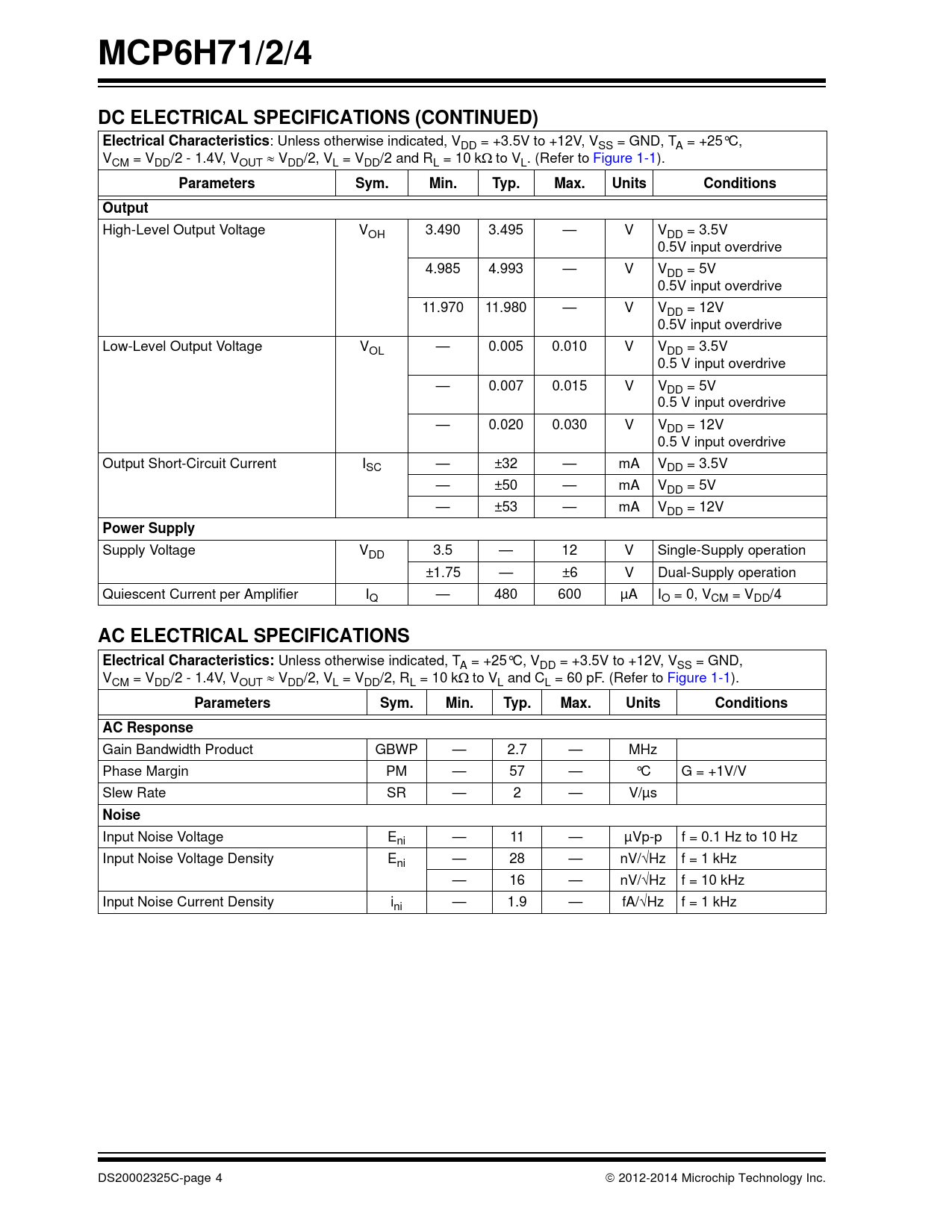 High-Level Output Voltage VOH 3.490 3.495 — V VDD = 3.5V 0.5V input overdrive 4.985 4.993 — V VDD = 5V 0.5V input overdrive 11.970 11.980 — V VDD = 12V 0.5V input overdrive Low-Level Output Voltage VOL — 0.005 0.010 V VDD = 3.5V 0.5 V input overdrive — 0.007 0.015 V VDD = 5V 0.5 V input overdrive — 0.020 0.030 V VDD = 12V 0.5 V input overdrive Output Short-Circuit Current ISC — ±32 — mA VDD = 3.5V — ±50 — mA VDD = 5V — ±53 — mA VDD = 12V