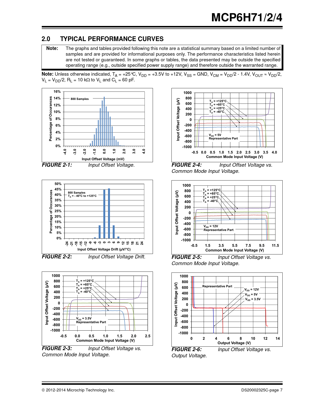 MCP6H71/2/42.0TYPICAL PERFORMANCE CURVESNote: The graphs and tables provided following this note are a statistical summary based on a limited number of samples and are provided for informational purposes only. The performance characteristics listed herein are not tested or guaranteed. In some graphs or tables, the data presented may be outside the specified operating range (e.g., outside specified power supply range) and therefore outside the warranted range. Note: Unless otherwise indicated, T A = +25°C, VDD = +3.5V to +12V, VSS = GND, VCM = VDD/2 - 1.4V, VOUT VDD/2, VL = VDD/2, RL = 10 kto VL and CL = 60 pF. 16%100014%800 Samples800T = +125°CA12%(µV)600T = +85°CA400T = +25°CA10%T = -40°Cltage200Ao8%06%-200tage of Occurances n-4004%t Offset V-600V= 5VDD2%PerceInpuRepresentative Part-8000%-1000-4.0-3.0-2.0-1.00.01.02.03.04.0-0.5 0.00.51.01.52.02.53.03.54.0Common Mode Input Voltage (V)Input Offset Voltage (mV)FIGURE 2-1: Input Offset Voltage. FIGURE 2-4: Input Offset Voltage vs. Common Mode Input Voltage. 50%100045%800T = +125°CA800 Samples40%T = +85°CT = - 40°C to +125°CAA(µV)600T = +25°CA35%400T = -40°CA30%ltage200o25%020%-200tage of Occurances 15%-400t Offset V10%V= 12VDD-600Representative PartPercen5%Inpu-8000%-1000-9-6-30369-24-21-18-15-121215182124-0.51.53.55.57.59.511.5Input Offset Voltage Drift (µV/°C)Common Mode Input Voltage (V)FIGURE 2-2: Input Offset Voltage Drift. FIGURE 2-5: Input Offset Voltage vs. Common Mode Input Voltage. 10001000800T = +125°CA800T = +85°C(µV)600ARepresentative PartT = +25°C(µV)600AV= 12V400T = -40°CDDA400V= 5VltageDD200oltage200oV= 3.5VDD00-200-200-400t Offset V-400t Offset V-600V= 3.5VDD-600InpuRepresentative Part-800Inpu -800-1000-1000-0.50.00.51.01.52.02.502468101214Common Mode Input Voltage (V)Output Voltage (V)FIGURE 2-3: Input Offset Voltage vs. FIGURE 2-6: Input Offset Voltage vs. Common Mode Input Voltage. Output Voltage. 2012-2014 Microchip Technology Inc. DS20002325C-page 7 Document Outline Features Applications Design Aids Description Package Types 1.0 Electrical Characteristics 1.1 Absolute Maximum Ratings † 1.2 Test Circuits FIGURE 1-1: AC and DC Test Circuit for Most Specifications. 2.0 Typical Performance Curves FIGURE 2-1: Input Offset Voltage. FIGURE 2-2: Input Offset Voltage Drift. FIGURE 2-3: Input Offset Voltage vs. Common Mode Input Voltage. FIGURE 2-4: Input Offset Voltage vs. Common Mode Input Voltage. FIGURE 2-5: Input Offset Voltage vs. Common Mode Input Voltage. FIGURE 2-6: Input Offset Voltage vs. Output Voltage. FIGURE 2-7: Input Offset Voltage vs. Power Supply Voltage. FIGURE 2-8: Input Noise Voltage Density vs. Frequency. FIGURE 2-9: Input Noise Voltage Density vs. Common Mode Input Voltage. FIGURE 2-10: CMRR, PSRR vs. Frequency. FIGURE 2-11: CMRR, PSRR vs. Ambient Temperature. FIGURE 2-12: Input Bias, Offset Currents vs. Ambient Temperature. FIGURE 2-13: Input Bias Current vs. Common Mode Input Voltage. FIGURE 2-14: Quiescent Current vs. Ambient Temperature. FIGURE 2-15: Quiescent Current vs. Power Supply Voltage. FIGURE 2-16: Open-Loop Gain, Phase vs. Frequency. FIGURE 2-17: DC Open-Loop Gain vs. Power Supply Voltage. FIGURE 2-18: DC Open-Loop Gain vs. Output Voltage Headroom. FIGURE 2-19: Channel-to-Channel Separation vs. Frequency (MCP6H72/4 only). FIGURE 2-20: Gain Bandwidth Product, Phase Margin vs. Ambient Temperature. FIGURE 2-21: Gain Bandwidth Product, Phase Margin vs. Ambient Temperature. FIGURE 2-22: Output Short Circuit Current vs. Power Supply Voltage. FIGURE 2-23: Output Voltage Swing vs. Frequency. FIGURE 2-24: Output Voltage Headroom vs. Output Current. FIGURE 2-25: Output Voltage Headroom vs. Output Current. FIGURE 2-26: Output Voltage Headroom vs. Output Current. FIGURE 2-27: Output Voltage Headroom vs. Ambient Temperature. FIGURE 2-28: Output Voltage Headroom vs. Ambient Temperature. FIGURE 2-29: Output Voltage Headroom vs. Ambient Temperature. FIGURE 2-30: Slew Rate vs. Ambient Temperature. FIGURE 2-31: Slew Rate vs. Ambient Temperature. FIGURE 2-32: Small Signal Non-Inverting Pulse Response. FIGURE 2-33: Small Signal Inverting Pulse Response. FIGURE 2-34: Large Signal Non-Inverting Pulse Response. FIGURE 2-35: Large Signal Inverting Pulse Response. FIGURE 2-36: The MCP6H71/2/4 Shows No Phase Reversal. FIGURE 2-37: Closed-Loop Output Impedance vs. Frequency. FIGURE 2-38: Measured Input Current vs. Input Voltage (below VSS). 3.0 Pin Descriptions TABLE 3-1: Pin Function Table 3.1 Analog Outputs 3.2 Analog Inputs 3.3 Power Supply Pins 3.4 Exposed Thermal Pad (EP) 4.0 Application Information 4.1 Inputs FIGURE 4-1: Simplified Analog Input ESD Structures. FIGURE 4-2: Protecting the Analog Inputs. FIGURE 4-3: Protecting the Analog Inputs. 4.2 Rail-to-Rail Output 4.3 Capacitive Loads FIGURE 4-4: Output Resistor, RISO Stabilizes Large Capacitive Loads. FIGURE 4-5: Recommended RISO Values for Capacitive Loads. 4.4 Supply Bypass 4.5 Unused Op Amps FIGURE 4-6: Unused Op Amps. 4.6 PCB Surface Leakage FIGURE 4-7: Example Guard Ring Layout for Inverting Gain. 4.7 Application Circuits FIGURE 4-8: High-Side Current Sensing Using Difference Amplifier. FIGURE 4-9: Active Full-Wave Rectifier. FIGURE 4-10: Triangle Waves Generator. 5.0 Design Aids 5.1 SPICE Macro Model 5.2 FilterLab® Software 5.3 MAPS (Microchip Advanced Part Selector) 5.4 Analog Demonstration and Evaluation Boards 5.5 Application Notes 6.0 Packaging Information 6.1 Package Marking Information Appendix A: Revision History Product Identification System Trademarks Worldwide Sales and Service