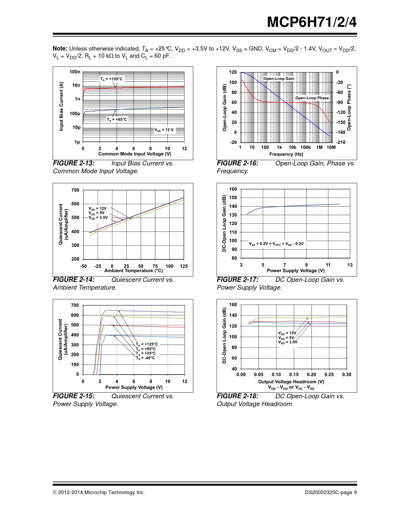 DC Open-Loop Gain vs. Power Supply Voltage. Output Voltage Headroom.  2012-2014 Microchip Technology Inc. DS20002325C-page 9 Document Outline Features Applications Design Aids Description Package Types 1.0 Electrical Characteristics 1.1 Absolute Maximum Ratings † 1.2 Test Circuits FIGURE 1-1: AC and DC Test Circuit for Most Specifications. 2.0 Typical Performance Curves FIGURE 2-1: Input Offset Voltage. FIGURE 2-2: Input Offset Voltage Drift. FIGURE 2-3: Input Offset Voltage vs. Common Mode Input Voltage. FIGURE 2-4: Input Offset Voltage vs. Common Mode Input Voltage. FIGURE 2-5: Input Offset Voltage vs. Common Mode Input Voltage. FIGURE 2-6: Input Offset Voltage vs. Output Voltage. FIGURE 2-7: Input Offset Voltage vs. Power Supply Voltage. FIGURE 2-8: Input Noise Voltage Density vs. Frequency. FIGURE 2-9: Input Noise Voltage Density vs. Common Mode Input Voltage. FIGURE 2-10: CMRR, PSRR vs. Frequency. FIGURE 2-11: CMRR, PSRR vs. Ambient Temperature. FIGURE 2-12: Input Bias, Offset Currents vs. Ambient Temperature. FIGURE 2-13: Input Bias Current vs. Common Mode Input Voltage. FIGURE 2-14: Quiescent Current vs. Ambient Temperature. FIGURE 2-15: Quiescent Current vs. Power Supply Voltage. FIGURE 2-16: Open-Loop Gain, Phase vs. Frequency. FIGURE 2-17: DC Open-Loop Gain vs. Power Supply Voltage. FIGURE 2-18: DC Open-Loop Gain vs. Output Voltage Headroom. FIGURE 2-19: Channel-to-Channel Separation vs. Frequency (MCP6H72/4 only). FIGURE 2-20: Gain Bandwidth Product, Phase Margin vs. Ambient Temperature. FIGURE 2-21: Gain Bandwidth Product, Phase Margin vs. Ambient Temperature. FIGURE 2-22: Output Short Circuit Current vs. Power Supply Voltage. FIGURE 2-23: Output Voltage Swing vs. Frequency. FIGURE 2-24: Output Voltage Headroom vs. Output Current. FIGURE 2-25: Output Voltage Headroom vs. Output Current. FIGURE 2-26: Output Voltage Headroom vs. Output Current. FIGURE 2-27: Output Voltage Headroom vs. Ambient Temperature. FIGURE 2-28: Output Voltage Headroom vs. Ambient Temperature. FIGURE 2-29: Output Voltage Headroom vs. Ambient Temperature. FIGURE 2-30: Slew Rate vs. Ambient Temperature. FIGURE 2-31: Slew Rate vs. Ambient Temperature. FIGURE 2-32: Small Signal Non-Inverting Pulse Response. FIGURE 2-33: Small Signal Inverting Pulse Response. FIGURE 2-34: Large Signal Non-Inverting Pulse Response. FIGURE 2-35: Large Signal Inverting Pulse Response. FIGURE 2-36: The MCP6H71/2/4 Shows No Phase Reversal. FIGURE 2-37: Closed-Loop Output Impedance vs. Frequency. FIGURE 2-38: Measured Input Current vs. Input Voltage (below VSS). 3.0 Pin Descriptions TABLE 3-1: Pin Function Table 3.1 Analog Outputs 3.2 Analog Inputs 3.3 Power Supply Pins 3.4 Exposed Thermal Pad (EP) 4.0 Application Information 4.1 Inputs FIGURE 4-1: Simplified Analog Input ESD Structures. FIGURE 4-2: Protecting the Analog Inputs. FIGURE 4-3: Protecting the Analog Inputs. 4.2 Rail-to-Rail Output 4.3 Capacitive Loads FIGURE 4-4: Output Resistor, RISO Stabilizes Large Capacitive Loads. FIGURE 4-5: Recommended RISO Values for Capacitive Loads. 4.4 Supply Bypass 4.5 Unused Op Amps FIGURE 4-6: Unused Op Amps. 4.6 PCB Surface Leakage FIGURE 4-7: Example Guard Ring Layout for Inverting Gain. 4.7 Application Circuits FIGURE 4-8: High-Side Current Sensing Using Difference Amplifier. FIGURE 4-9: Active Full-Wave Rectifier. FIGURE 4-10: Triangle Waves Generator. 5.0 Design Aids 5.1 SPICE Macro Model 5.2 FilterLab® Software 5.3 MAPS (Microchip Advanced Part Selector) 5.4 Analog Demonstration and Evaluation Boards 5.5 Application Notes 6.0 Packaging Information 6.1 Package Marking Information Appendix A: Revision History Product Identification System Trademarks Worldwide Sales and Service
