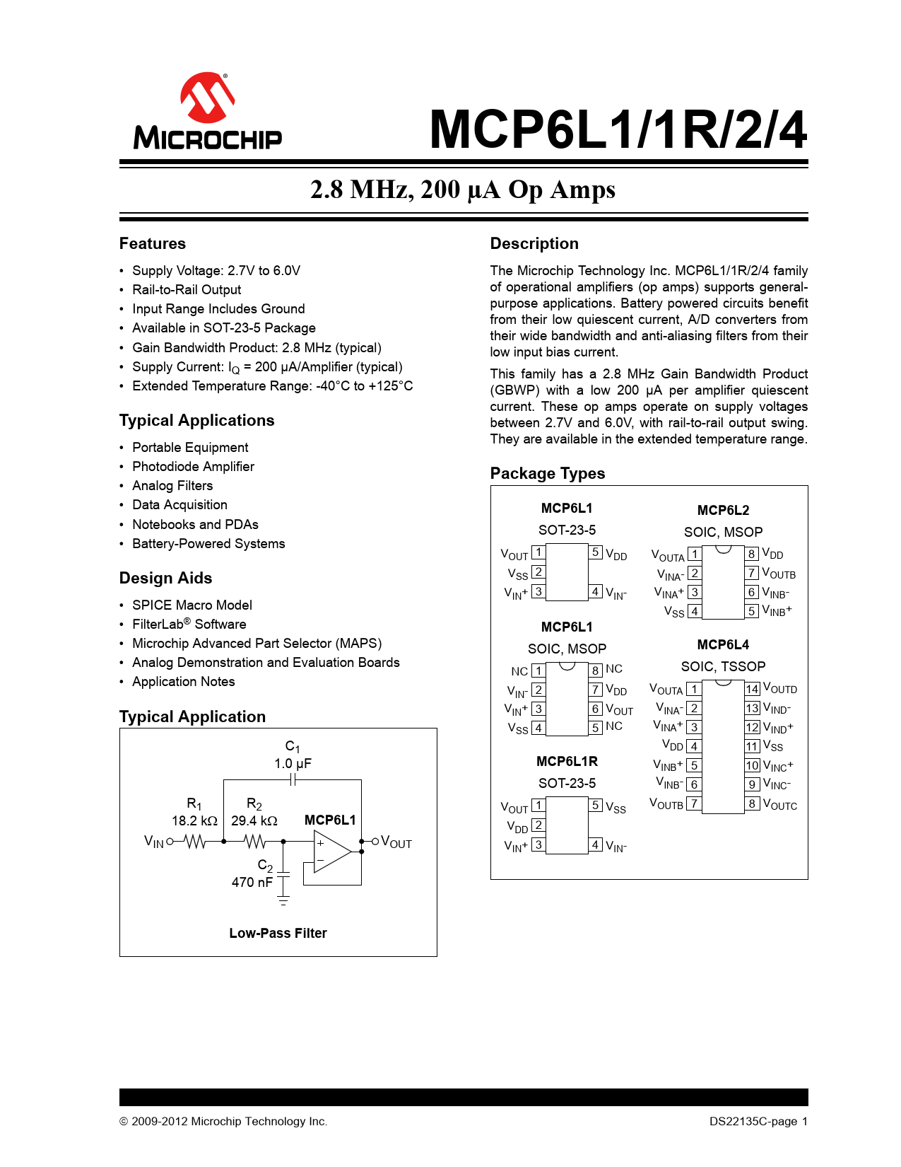 MCP6L1/1R/2/4. 2.8 MHz, 200 µA Op Amps. Features. Description. Typical Applications. Package Types. MCP6L1. MCP6L2. Design Aids. MCP6L4