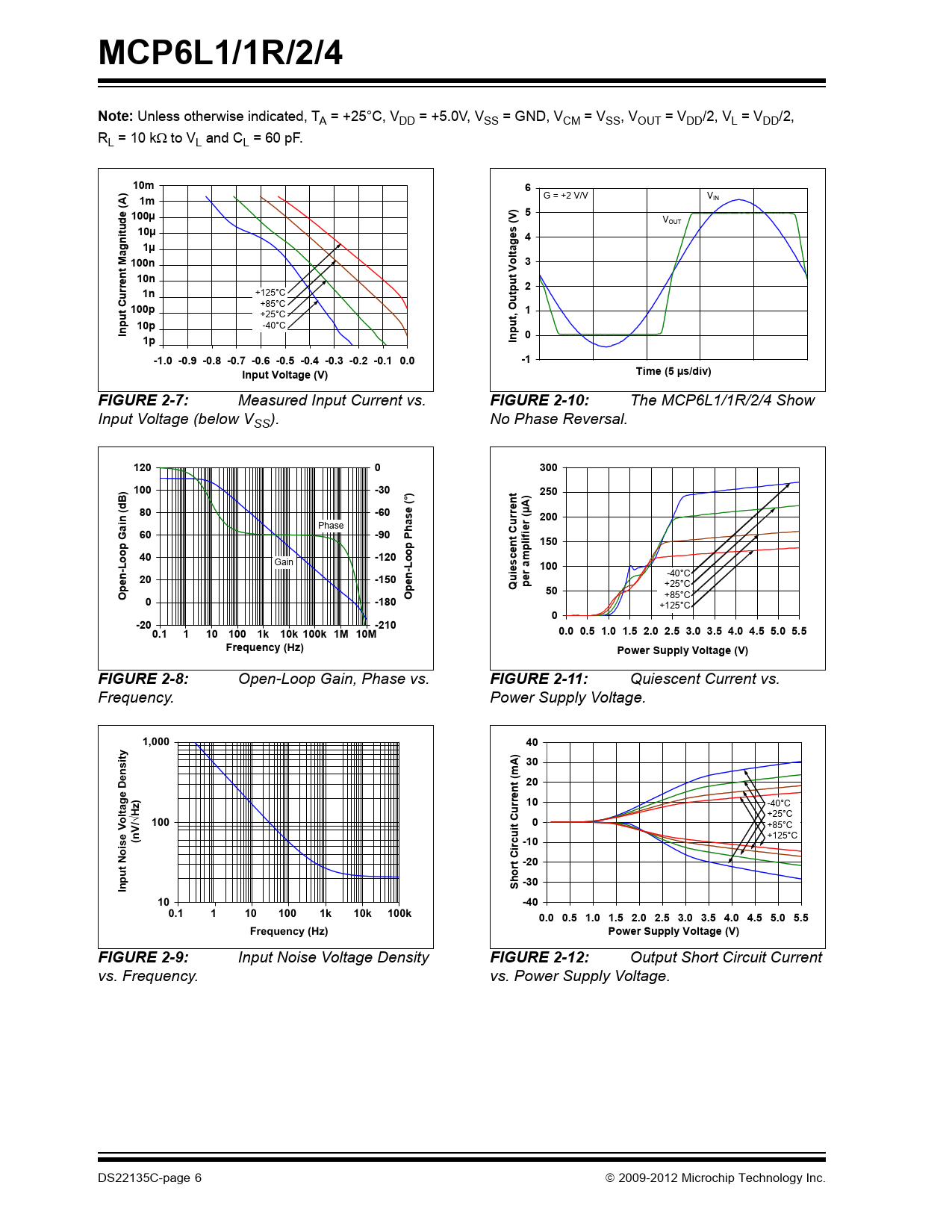 MCP6L1/1R/2/4Note: Unless otherwise indicated, TA = +25°C, VDD = +5.0V, VSS = GND, VCM = VSS, VOUT = VDD/2, VL = VDD/2, RL = 10 kto VL and CL = 60 pF. 1.E-0210m)61.EA-031m G = +2 V/V VIN ()1.Ee-045d 100µ VOUT 1.Eitu-0510µs (Vne 41.Eg-06a1µag lt1.E-07o 3t M 100nt V1.Een-0810nurr21.Eu-091n +125°C tp +85°C 1.Et C-10100p1u +25°C t, Ou u1.Ep-1110p -40°C Inp 0In1.E-121p-1.0 -0.9 -0.8 -0.7 -0.6 -0.5 -0.4 -0.3 -0.2 -0.1 0.0-1 0.E+005.E-061.E-052.E-052.E-053.E-05Input Voltage (V)Time (5 µs/div)FIGURE 2-7: Measured Input Current vs. FIGURE 2-10: The MCP6L1/1R/2/4 Show Input Voltage (below VSS). No Phase Reversal. 1200300100-30t250B)(°)) A(d80-60rrenase200 Phase uh60Gain-90Pt Cifier (µpn150oplo40-120oopm Gain -L100iescer a -40°C en20-150en-Lu Qpe +25°C 50OpOp +85°C 0-180 +125°C 0-20-2100.0 0.5 1.0 1.5 2.0 2.5 3.0 3.5 4.0 4.5 5.0 5.51.E-0.1 1.E1+ 1.E+10 1.E+100 1.E+1k 1.E10 +k 1.1 E+00k 1.E+1M 1.E+10M01000102Frequ 03ency 04(Hz) 05 06 07Power Supply Voltage (V)FIGURE 2-8: Open-Loop Gain, Phase vs. FIGURE 2-11: Quiescent Current vs. Frequency. Power Supply Voltage. 1,00040) A 30m t ( 20n rre 10 -40°C u +25°C 1000it C +85°C (nV/Hz) +125°C -10ircu t C -20 hor -30Input Noise Voltage DensityS10-401.E-010.11.E+011.E+0101.E+01001.E+01k1.E+010k1.E+0100k0.0 0.5 1.0 1.5 2.0 2.5 3.0 3.5 4.0 4.5 5.0 5.50123Frequency (Hz)45Power Supply Voltage (V)FIGURE 2-9: Input Noise Voltage Density FIGURE 2-12: Output Short Circuit Current vs. Frequency. vs. Power Supply Voltage. DS22135C-page 6 2009-2012 Microchip Technology Inc. Document Outline MCP6L1/1R/2/4 - 2.8 MHz, 200 μA Op Amps 1.0 Electrical Characteristics 1.1 Absolute Maximum Ratings † 1.2 Specifications TABLE 1-1: DC Electrical Specifications TABLE 1-2: AC Electrical Specifications TABLE 1-3: Temperature Specifications 1.3 Test Circuit FIGURE 1-1: AC and DC Test Circuit for Most Specifications. 2.0 Typical Performance Curves FIGURE 2-1: Input Offset Voltage vs. Common-Mode Input Voltage at VDD = 2.7V. FIGURE 2-2: Input Offset Voltage vs. Common-Mode Input Voltage at VDD = 5.5V. FIGURE 2-3: Input Offset Voltage vs. Ambient Temperature. FIGURE 2-4: Input Common-Mode Range Voltage vs. Ambient Temperature. FIGURE 2-5: CMRR, PSRR vs. Ambient Temperature. FIGURE 2-6: CMRR, PSRR vs. Frequency. FIGURE 2-7: Measured Input Current vs. Input Voltage (below VSS). FIGURE 2-8: Open-Loop Gain, Phase vs. Frequency. FIGURE 2-9: Input Noise Voltage Density vs. Frequency. FIGURE 2-10: The MCP6L1/1R/2/4 Show No Phase Reversal. FIGURE 2-11: Quiescent Current vs. Power Supply Voltage. FIGURE 2-12: Output Short Circuit Current vs. Power Supply Voltage. FIGURE 2-13: Ratio of Output Voltage Headroom to Output Current vs. Output Current. FIGURE 2-14: Small Signal, Non-Inverting Pulse Response. FIGURE 2-15: Large Signal, Non-Inverting Pulse Response. FIGURE 2-16: Slew Rate vs. Ambient Temperature. FIGURE 2-17: Output Voltage Swing vs. Frequency. 3.0 Pin Descriptions TABLE 3-1: Pin Function Table 3.1 Analog Outputs 3.2 Analog Inputs 3.3 Power Supply Pins 4.0 Application Information 4.1 Inputs FIGURE 4-1: Protecting the Analog Inputs. FIGURE 4-2: Unity Gain Buffer has a Limited VOUT Range. 4.2 Rail-to-Rail Output 4.3 Capacitive Loads FIGURE 4-3: Output Resistor, RISO, Stabilizes Large Capacitive Loads. 4.4 Supply Bypass 4.5 Unused Op Amps FIGURE 4-4: Unused Op Amps. 4.6 PCB Surface Leakage FIGURE 4-5: Example Guard Ring Layout. 4.7 Application Circuits FIGURE 4-6: Sallen Key Topology. FIGURE 4-7: Multiple Feedback Topology. 5.0 Design Aids 5.1 SPICE Macro Model 5.2 FilterLab® Software 5.3 Microchip Advanced Part Selector (MAPS) 5.4 Analog Demonstration and Evaluation Boards 5.5 Application Notes 6.0 Packaging Information 6.1 Package Marking Information Appendix A: Revision History Product Identification System Worldwide Sales and Service