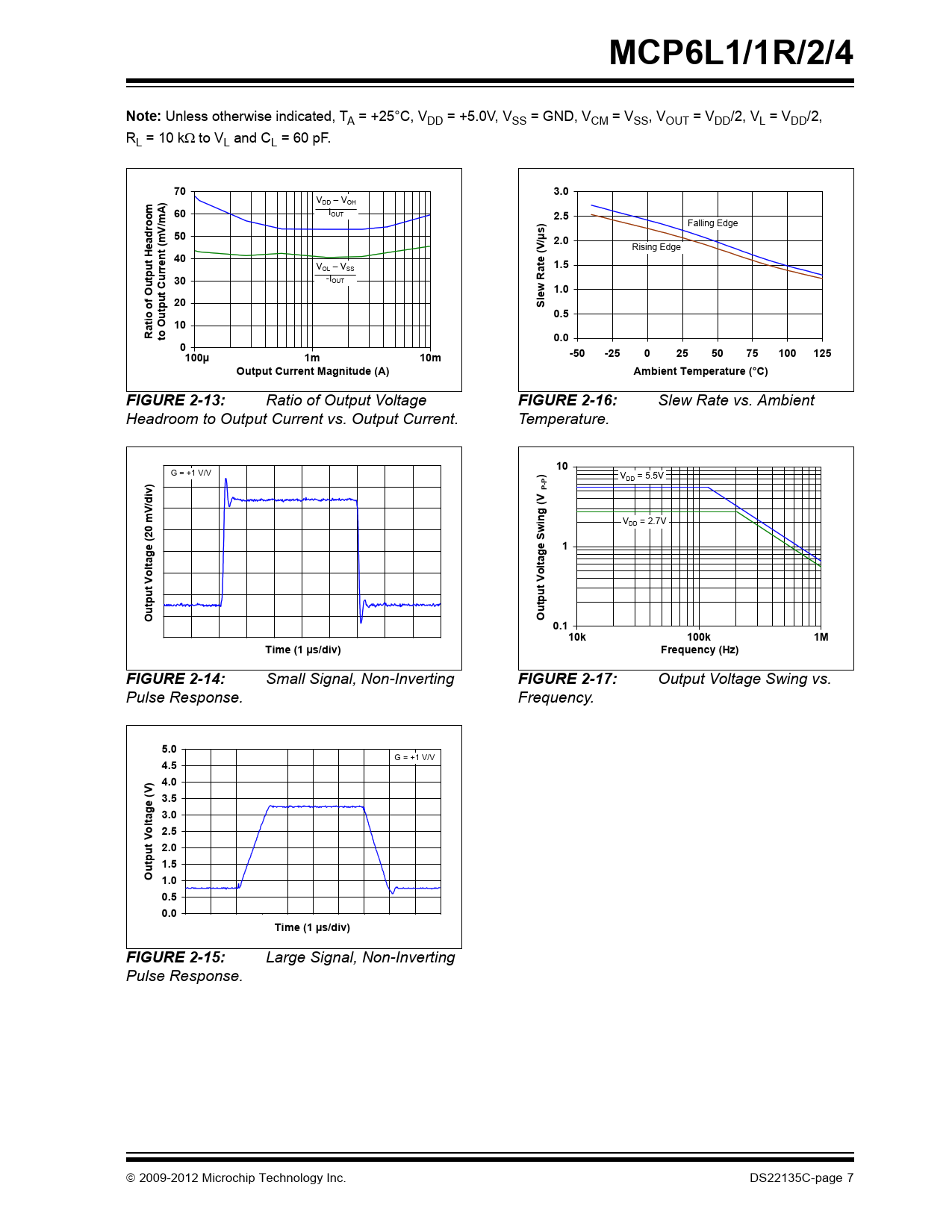MCP6L1/1R/2/4Note: Unless otherwise indicated, TA = +25°C, VDD = +5.0V, VSS = GND, VCM = VSS, VOUT = VDD/2, VL = VDD/2, RL = 10 kto VL and CL = 60 pF. 703.0) VDD – VOH A 60 IOUT 2.5oom/m) Falling Edge V 50adrm/µse2.0t ( Rising Edge H40e (Vutrren V 1.5 OL – VSS tpu 30u -IOUT C1.0f Outlew Ratp 20S 0.5atio oOut 10Rto0.00-50-2502550751001251.E1 -0400µ1.E-031m1.E-10 02mOutput Current Magnitude (A)Ambient Temperature (°C)FIGURE 2-13: Ratio of Output Voltage FIGURE 2-16: Slew Rate vs. Ambient Headroom to Output Current vs. Output Current. Temperature. 2.5810 G = +1 V/V ) V P DD = 5.5V 2.56iv)P-/d 2.54Vg (Vmin VDD = 2.7V 2.52w(20 e12.50age Sltaglt o2.48o t Vt V2.46u tptpu2.44OuOu 0.12.4210k100k1M0.E+001.E-062.E-063.E-064.E-065.E-066.E-067.E-068.E-069.E-061.E-051.E+041.E+051.E+06Time (1 µs/div)Frequency (Hz)FIGURE 2-14: Small Signal, Non-Inverting FIGURE 2-17: Output Voltage Swing vs. Pulse Response. Frequency. 5.0 G = +1 V/V 4.5) 4.0 (V 3.5e 3.0ltag o 2.52.0tput V 1.5u O 1.00.5 0.0 0.E+001.E-062. E-063.E-064.E-065. E-066.E-067. E-068.E -069.E-061. E-05Time (1 µs/div)FIGURE 2-15: Large Signal, Non-Inverting Pulse Response. 2009-2012 Microchip Technology Inc. DS22135C-page 7 Document Outline MCP6L1/1R/2/4 - 2.8 MHz, 200 μA Op Amps 1.0 Electrical Characteristics 1.1 Absolute Maximum Ratings † 1.2 Specifications TABLE 1-1: DC Electrical Specifications TABLE 1-2: AC Electrical Specifications TABLE 1-3: Temperature Specifications 1.3 Test Circuit FIGURE 1-1: AC and DC Test Circuit for Most Specifications. 2.0 Typical Performance Curves FIGURE 2-1: Input Offset Voltage vs. Common-Mode Input Voltage at VDD = 2.7V. FIGURE 2-2: Input Offset Voltage vs. Common-Mode Input Voltage at VDD = 5.5V. FIGURE 2-3: Input Offset Voltage vs. Ambient Temperature. FIGURE 2-4: Input Common-Mode Range Voltage vs. Ambient Temperature. FIGURE 2-5: CMRR, PSRR vs. Ambient Temperature. FIGURE 2-6: CMRR, PSRR vs. Frequency. FIGURE 2-7: Measured Input Current vs. Input Voltage (below VSS). FIGURE 2-8: Open-Loop Gain, Phase vs. Frequency. FIGURE 2-9: Input Noise Voltage Density vs. Frequency. FIGURE 2-10: The MCP6L1/1R/2/4 Show No Phase Reversal. FIGURE 2-11: Quiescent Current vs. Power Supply Voltage. FIGURE 2-12: Output Short Circuit Current vs. Power Supply Voltage. FIGURE 2-13: Ratio of Output Voltage Headroom to Output Current vs. Output Current. FIGURE 2-14: Small Signal, Non-Inverting Pulse Response. FIGURE 2-15: Large Signal, Non-Inverting Pulse Response. FIGURE 2-16: Slew Rate vs. Ambient Temperature. FIGURE 2-17: Output Voltage Swing vs. Frequency. 3.0 Pin Descriptions TABLE 3-1: Pin Function Table 3.1 Analog Outputs 3.2 Analog Inputs 3.3 Power Supply Pins 4.0 Application Information 4.1 Inputs FIGURE 4-1: Protecting the Analog Inputs. FIGURE 4-2: Unity Gain Buffer has a Limited VOUT Range. 4.2 Rail-to-Rail Output 4.3 Capacitive Loads FIGURE 4-3: Output Resistor, RISO, Stabilizes Large Capacitive Loads. 4.4 Supply Bypass 4.5 Unused Op Amps FIGURE 4-4: Unused Op Amps. 4.6 PCB Surface Leakage FIGURE 4-5: Example Guard Ring Layout. 4.7 Application Circuits FIGURE 4-6: Sallen Key Topology. FIGURE 4-7: Multiple Feedback Topology. 5.0 Design Aids 5.1 SPICE Macro Model 5.2 FilterLab® Software 5.3 Microchip Advanced Part Selector (MAPS) 5.4 Analog Demonstration and Evaluation Boards 5.5 Application Notes 6.0 Packaging Information 6.1 Package Marking Information Appendix A: Revision History Product Identification System Worldwide Sales and Service