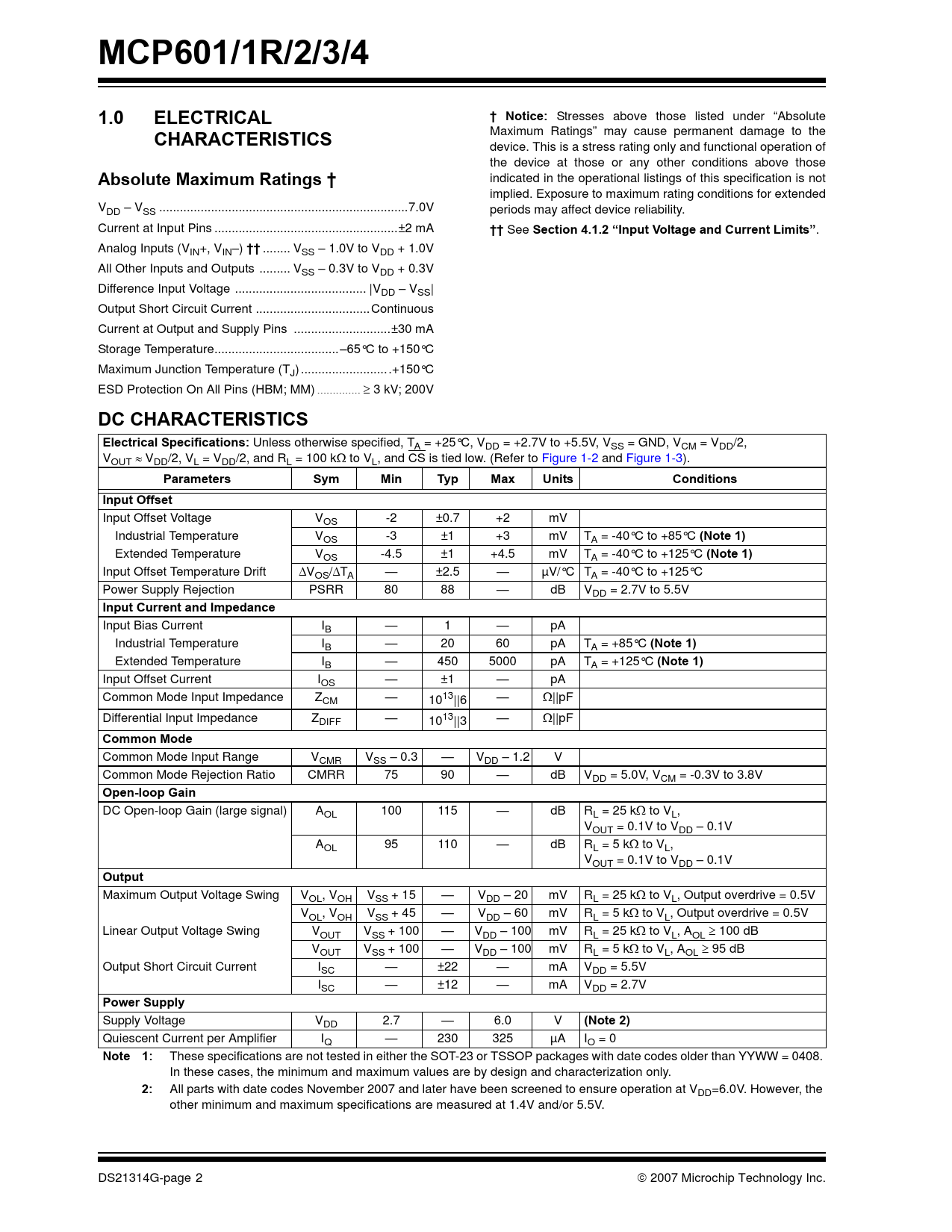 MCP601/1R/2/3/4. 1.0. ELECTRICAL. † Notice:. CHARACTERISTICS. Absolute Maximum Ratings †