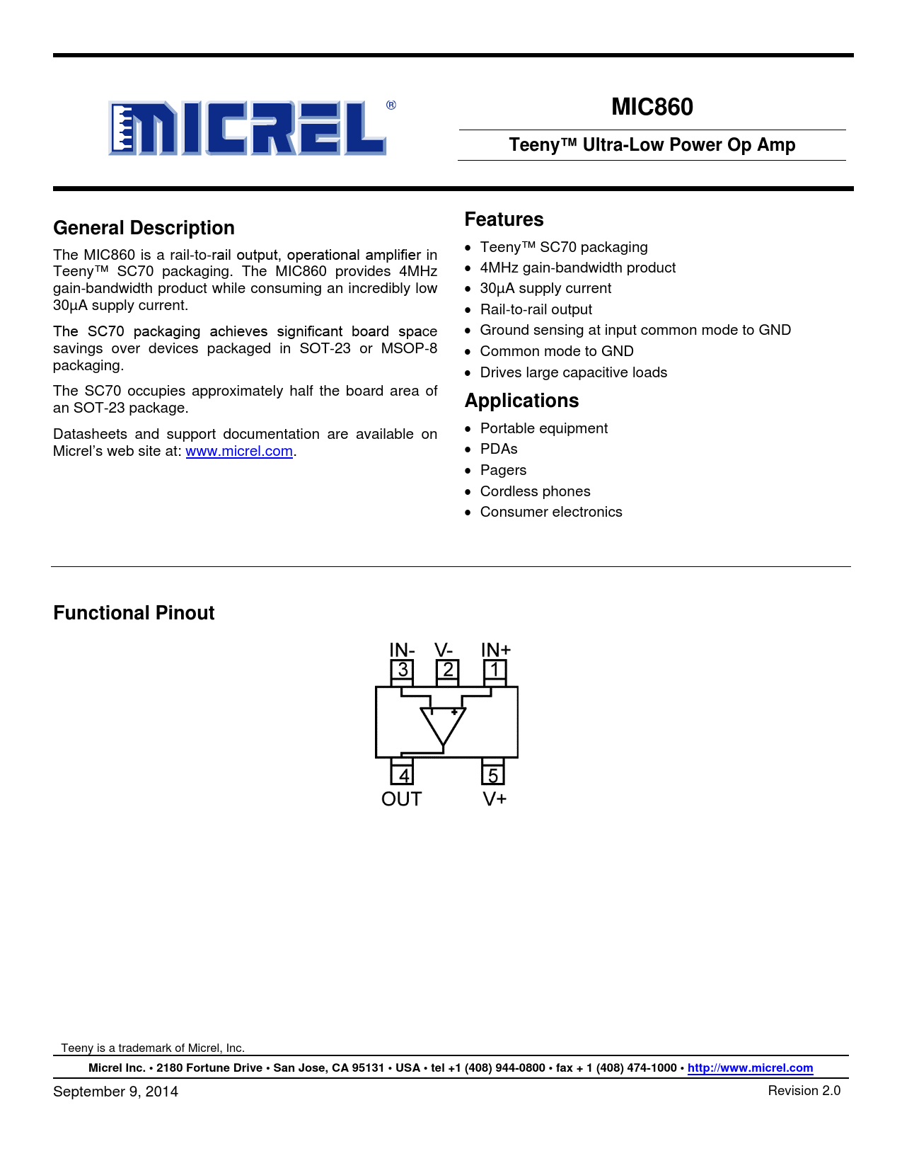 DescriptionThe MIC860 is a rail-to-rail output, operational amplifier in Teeny™ SC70 packaging