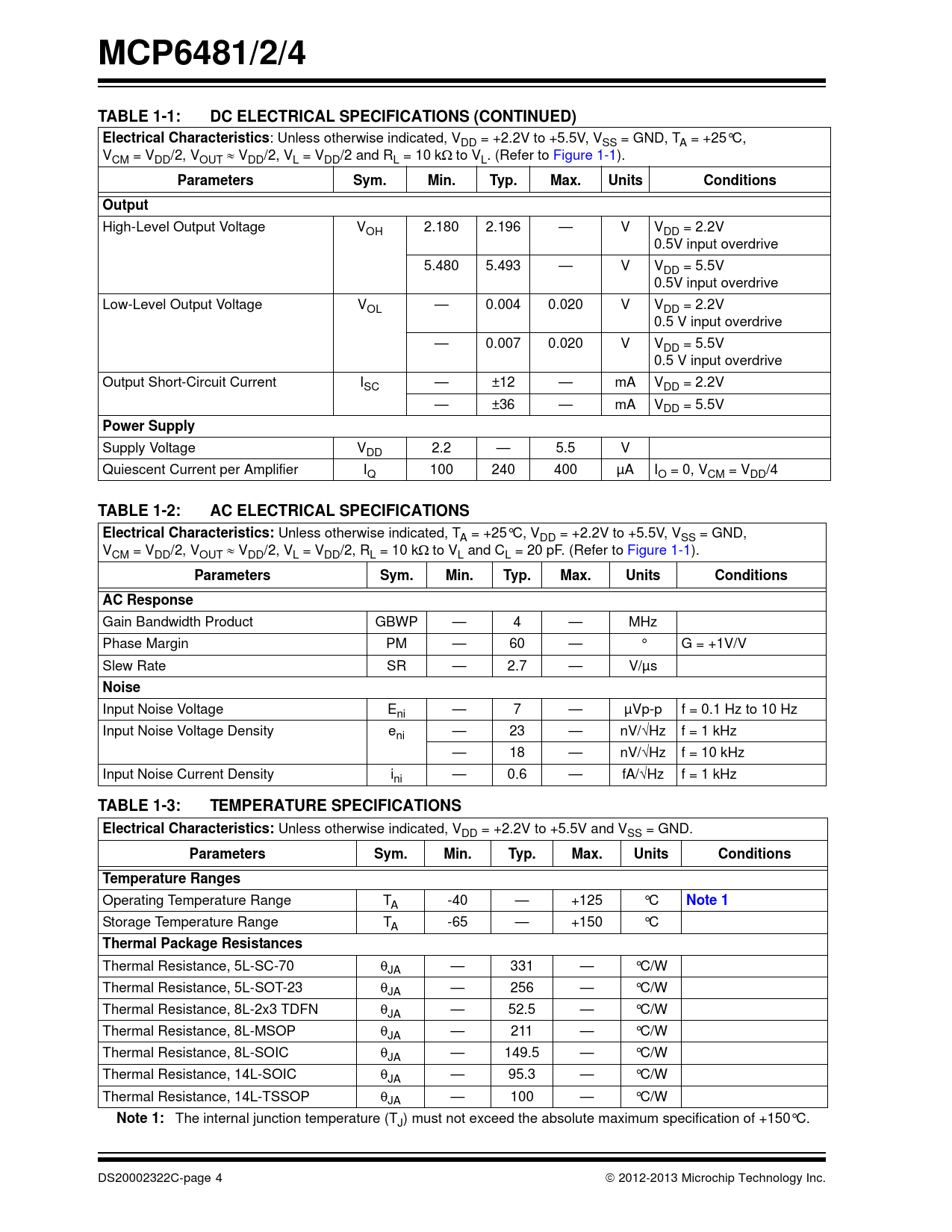 Pages / Page50 / 4 — MCP6481/2/4. TABLE 1-1:. DC ELECTRICAL SPECIFICATIONS (CONTINUED). …