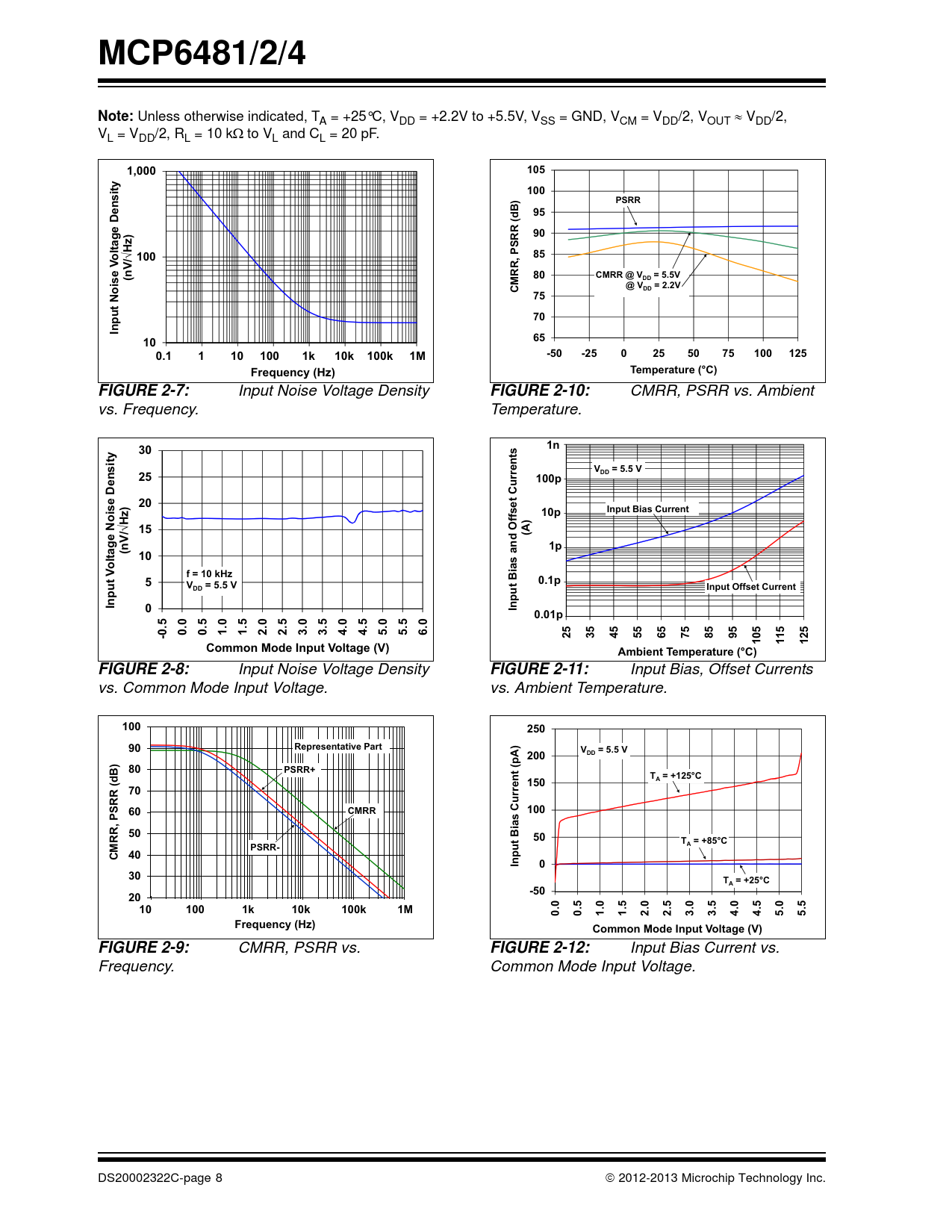 MCP6481/2/4Note: Unless otherwise indicated, T A = +25°C, VDD = +2.2V to +5.5V, VSS = GND, VCM = VDD/2, VOUT VDD/2, VL = VDD/2, RL = 10 kto VL and CL = 20 pF. 1,000105100PSRR95(dB)90ltage DensityHz)o¥ 10085(nV/80CMRR @ V= 5.5VMRR, PSRRDDoise V@ V= 2 2. VC2VDDN7570Input1065-50-2502550751001251.E-1 1.E+0 1.E+1 1.E+20.1 1 10 100 1.E+31k1.E+4 1.E+5 1.E+610k 100k 1MFrequency (Hz)Temperature (°C)FIGURE 2-7: Input Noise Voltage Density FIGURE 2-10: CMRR, PSRR vs. Ambient vs. Frequency. Temperature. 1000301nV= 5.5 V25DD100100pCurrents20Input Bias Current1010pHz) ¥ 15(A)(nV/11p10ltage Noise Densitys and Offseto Vf =10kHz50.1pV= 5.5 V0.1DDInput Offset CurrentInput0Input Bia0.010.01p5-0.50.00.51.01.52.02.53.03.54.04.55.05.56.0253545556575859510511125Common Mode Input Voltage (V)Ambient Temperature (°C)FIGURE 2-8: Input Noise Voltage Density FIGURE 2-11: Input Bias, Offset Currents vs. Common Mode Input Voltage. vs. Ambient Temperature. 10025090Representative PartV= 5.5 V200DD80PSRR+T = +125°C150A7060CMRR10050Bias Current (pA)50tT = +85°CPSRR-uAu40CMRR, PSRR (dB)Inp030T = +25°CA-50201.00E+01 1.00E+02 1.00E+03 1.00E+04 1.00E+05 1.00E+0610 100 1k 10k 100k 1M0.00.51.01.52.02.53.03.54.04.55.05.5Frequency (Hz)Common Mode Input Voltage (V)FIGURE 2-9: CMRR, PSRR vs. FIGURE 2-12: Input Bias Current vs. Frequency. Common Mode Input Voltage. DS20002322C-page 8 2012-2013 Microchip Technology Inc. Document Outline Package Types Typical Application 1.0 Electrical Characteristics 1.1 Absolute Maximum Ratings 1.2 Specifications TABLE 1-1: DC Electrical Specifications TABLE 1-2: AC Electrical Specifications TABLE 1-3: Temperature Specifications 1.3 Test Circuits FIGURE 1-1: AC and DC Test Circuit for Most Specifications. 2.0 Typical Performance Curves FIGURE 2-1: Input Offset Voltage. FIGURE 2-2: Input Offset Voltage Drift. FIGURE 2-3: Input Offset Voltage vs. Common Mode Input Voltage. FIGURE 2-4: Input Offset Voltage vs. Common Mode Input Voltage. FIGURE 2-5: Input Offset Voltage vs. Output Voltage. FIGURE 2-6: Input Offset Voltage vs. Power Supply Voltage. FIGURE 2-7: Input Noise Voltage Density vs. Frequency. FIGURE 2-8: Input Noise Voltage Density vs. Common Mode Input Voltage. FIGURE 2-9: CMRR, PSRR vs. Frequency. FIGURE 2-10: CMRR, PSRR vs. Ambient Temperature. FIGURE 2-11: Input Bias, Offset Currents vs. Ambient Temperature. FIGURE 2-12: Input Bias Current vs. Common Mode Input Voltage. FIGURE 2-13: Quiescent Current vs. Ambient Temperature. FIGURE 2-14: Quiescent Current vs. Common Mode Input Voltage. FIGURE 2-15: Quiescent Current vs. Common Mode Input Voltage. FIGURE 2-16: Quiescent Current vs. Power Supply Voltage. FIGURE 2-17: Open-Loop Gain, Phase vs. Frequency. FIGURE 2-18: DC Open-Loop Gain vs. Ambient Temperature. FIGURE 2-19: Gain Bandwidth Product, Phase Margin vs. Ambient Temperature. FIGURE 2-20: Gain Bandwidth Product, Phase Margin vs. Ambient Temperature. FIGURE 2-21: Output Short Circuit Current vs. Power Supply Voltage. FIGURE 2-22: Output Voltage Swing vs. Frequency. FIGURE 2-23: Output Voltage Headroom vs. Output Current. FIGURE 2-24: Output Voltage Headroom vs. Output Current. FIGURE 2-25: Output Voltage Headroom vs. Ambient Temperature. FIGURE 2-26: Output Voltage Headroom vs. Ambient Temperature. FIGURE 2-27: Slew Rate vs. Ambient Temperature. FIGURE 2-28: Small Signal Non-Inverting Pulse Response. FIGURE 2-29: Small Signal Inverting Pulse Response. FIGURE 2-30: Large Signal Non-Inverting Pulse Response. FIGURE 2-31: Large Signal Inverting Pulse Response. FIGURE 2-32: The MCP6481/2/4 Shows No Phase Reversal. FIGURE 2-33: Closed Loop Output Impedance vs. Frequency. FIGURE 2-34: Measured Input Current vs. Input Voltage (below VSS). FIGURE 2-35: Channel-to-Channel Separation vs. Frequency (MCP6482/4 only). 3.0 Pin Descriptions TABLE 3-1: Pin Function Table 3.1 Analog Outputs 3.2 Analog Inputs 3.3 Power Supply Pins 3.4 Exposed Thermal Pad (EP) 4.0 Application Information 4.1 Inputs FIGURE 4-1: Simplified Analog Input ESD Structures. FIGURE 4-2: Protecting the Analog Inputs. FIGURE 4-3: Protecting the Analog Inputs. 4.2 Rail-to-Rail Output 4.3 Capacitive Loads FIGURE 4-4: Output Resistor, RISO Stabilizes Large Capacitive Loads. FIGURE 4-5: Recommended RISO Values for Capacitive Loads. 4.4 Supply Bypass 4.5 Unused Op Amps FIGURE 4-6: Unused Op Amps. 4.6 PCB Surface Leakage FIGURE 4-7: Example Guard Ring Layout for Inverting Gain. 4.7 Application Circuits FIGURE 4-8: Photovoltaic Mode Detector. FIGURE 4-9: Photoconductive Mode Detector. FIGURE 4-10: Second-Order, Low-Pass Butterworth Filter with Sallen-Key Topology. FIGURE 4-11: Second-Order, Low-Pass Butterworth Filter with Multiple-Feedback Topology. FIGURE 4-12: pH Electrode Amplifier. 5.0 Design Aids 5.1 SPICE Macro Model 5.2 FilterLab Software 5.3 MAPS (Microchip Advanced Part Selector) 5.4 Analog Demonstration and Evaluation Boards 5.5 Application Notes 6.0 Packaging Information 6.1 Package Marking Information Appendix A: Revision History Product Identification System Trademarks Worldwide Sales and Service