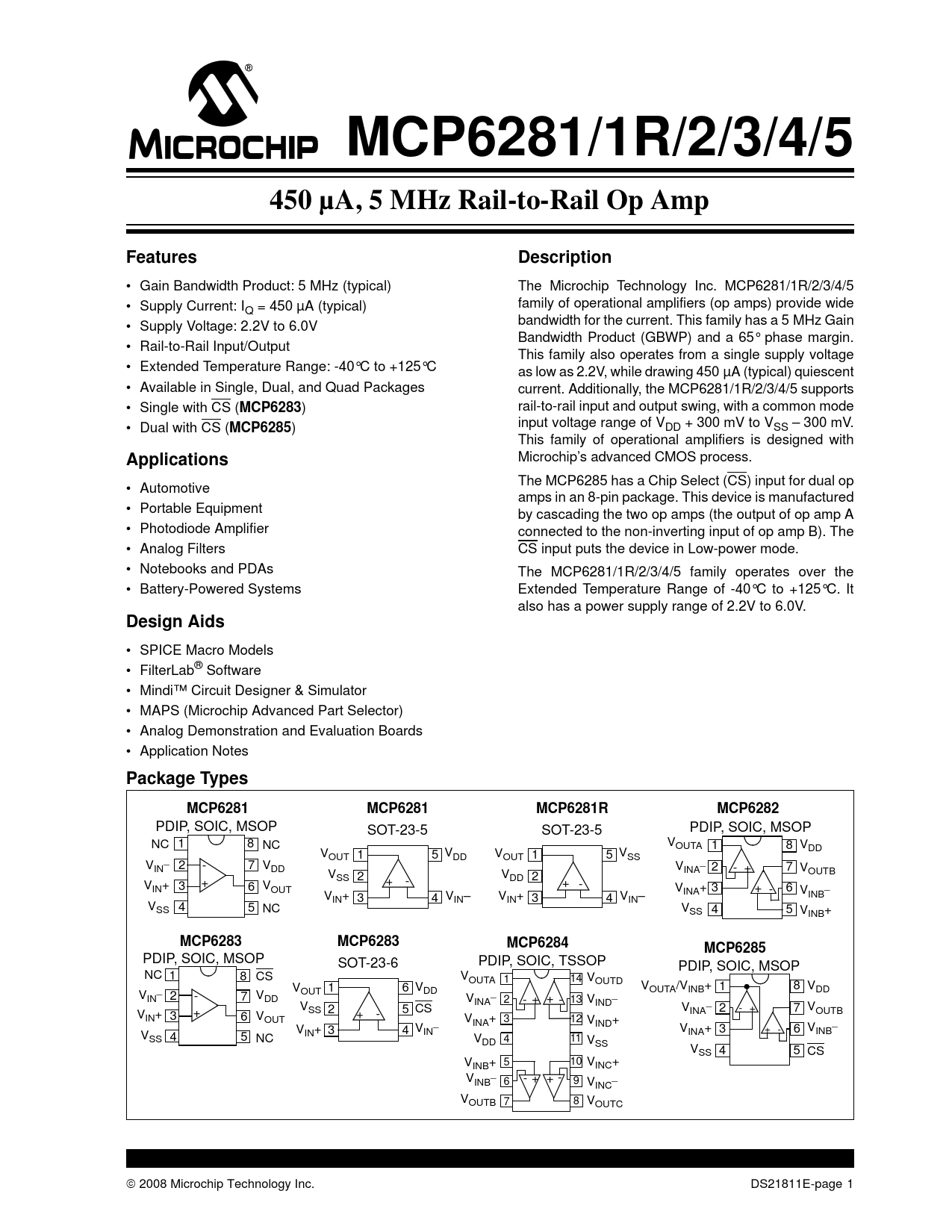 MCP6281/1R/2/3/4/5. 450 µA, 5 MHz Rail-to-Rail Op Amp. Features. Description. MCP6283. MCP6285. Applications. Design Aids