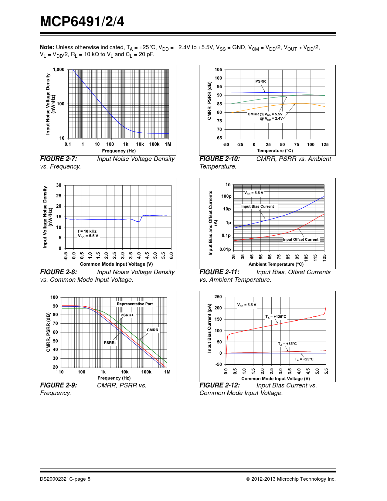 MCP6491/2/4Note: Unless otherwise indicated, T A = +25°C, VDD = +2.4V to +5.5V, VSS = GND, VCM = VDD/2, VOUT VDD/2, VL = VDD/2, RL = 10 kto VL and CL = 20 pF. 1,000105100PSRR95(dB)90ltage DensityHz)o¥ 10085(nV/80CMRR @ V= 5.5Voise VMRR, PSRRDDC@ V= 2.4VN75DD70Input10651.E-1 1.E+0 1.E+1 1.E+20.1 1 10 100 1.E+31k1.E+4 1.E+5 1.E+610k 100k 1M-50-250255075100125Frequency (Hz)Temperature (°C)FIGURE 2-7: Input Noise Voltage Density FIGURE 2-10: CMRR, PSRR vs. Ambient vs. Frequency. Temperature. 3010001nV= 5.5 V25DD100p10020CurrentsInput Bias Current10p10Hz) ¥ 151p(nV/1(A)10ltage Noise Densitynd Offsetof = 10 kHzaVV= 55. V0.1p5VDD0.1Input Offset CurrentInput00.010.01pInput Bias5-0.50.00.51.01.52.02.53.03.54.04.55.05.56.0253545556575859510511125Common Mode Input Voltage (V)Ambient Temperature (°C)FIGURE 2-8: Input Noise Voltage Density FIGURE 2-11: Input Bias, Offset Currents vs. Common Mode Input Voltage. vs. Ambient Temperature. 100250Representative Part90V= 5.5 V200DD80PSRR+T = +125°CA(dB)15070CMRR6010050Bias Current (pA)RR, PSRRPSRR-t50uT = +85+85°CuAM 40CInp030T = +25°CA-50201.00E+011.00E+021.00E+031.00E+041.00E+051.00E+0610 100 1k10k100k 1M0.00.51.01.52.02.53.03.54.04.55.05.5Frequency (Hz)Common Mode Input Voltage (V)FIGURE 2-9: CMRR, PSRR vs. FIGURE 2-12: Input Bias Current vs. Frequency. Common Mode Input Voltage. DS20002321C-page 8 2012-2013 Microchip Technology Inc. Document Outline Package Types Typical Application 1.0 Electrical Characteristics 1.1 Absolute Maximum Ratings 1.2 Specifications 1.3 Test Circuits 2.0 Typical Performance Curves Figure 2-1: Input Offset Voltage Figure 2-2: Input Offset Voltage Drift Figure 2-3: Input Offset Voltage vs. Common Mode Input Voltage Figure 2-4: Input Offset Voltage vs. Common Mode Input Voltage Figure 2-5: Input Offset Voltage vs. Output Voltage Figure 2-6: Input Offset Voltage vs. Power Supply Voltage FIGURE 2-7: Input Noise Voltage Density vs. Frequency. FIGURE 2-8: Input Noise Voltage Density vs. Common Mode Input Voltage. FIGURE 2-9: CMRR, PSRR vs. Frequency. FIGURE 2-10: CMRR, PSRR vs. Ambient Temperature. FIGURE 2-11: Input Bias, Offset Currents vs. Ambient Temperature. FIGURE 2-12: Input Bias Current vs. Common Mode Input Voltage. FIGURE 2-13: Quiescent Current vs. Ambient Temperature. FIGURE 2-14: Quiescent Current vs. Common Mode Input Voltage. FIGURE 2-15: Quiescent Current vs. Common Mode Input Voltage. FIGURE 2-16: Quiescent Current vs. Power Supply Voltage. FIGURE 2-17: Open-Loop Gain, Phase vs. Frequency. FIGURE 2-18: DC Open-Loop Gain vs. Ambient Temperature. FIGURE 2-19: Gain Bandwidth Product, Phase Margin vs. Ambient Temperature. FIGURE 2-20: Gain Bandwidth Product, Phase Margin vs. Ambient Temperature. FIGURE 2-21: Output Short Circuit Current vs. Power Supply Voltage. FIGURE 2-22: Output Voltage Swing vs. Frequency. FIGURE 2-23: Output Voltage Headroom vs. Output Current. FIGURE 2-24: Output Voltage Headroom vs. Output Current. FIGURE 2-25: Output Voltage Headroom vs. Ambient Temperature. FIGURE 2-26: Output Voltage Headroom vs. Ambient Temperature. FIGURE 2-27: Slew Rate vs. Ambient Temperature. FIGURE 2-28: Small Signal Non-Inverting Pulse Response. FIGURE 2-29: Small Signal Inverting Pulse Response. FIGURE 2-30: Large Signal Non-Inverting Pulse Response. FIGURE 2-31: Large Signal Inverting Pulse Response. FIGURE 2-32: The MCP6491/2/4 Shows No Phase Reversal. FIGURE 2-33: Closed Loop Output Impedance vs. Frequency. FIGURE 2-34: Measured Input Current vs. Input Voltage (below VSS). FIGURE 2-35: Channel-to-Channel Separation vs. Frequency (MCP6492/4 only). 3.0 Pin Descriptions TABLE 3-1: Pin Function Table 3.1 Analog Outputs 3.2 Analog Inputs 3.3 Power Supply Pins 3.4 Exposed Thermal Pad (EP) 4.0 Application Information 4.1 Inputs FIGURE 4-1: Simplified Analog Input ESD Structures. FIGURE 4-2: Protecting the Analog Inputs. Figure 4-3: Protecting the Analog Inputs 4.2 Rail-to-Rail Output 4.3 Capacitive Loads FIGURE 4-4: Output Resistor, RISO Stabilizes Large Capacitive Loads. FIGURE 4-5: Recommended RISO Values for Capacitive Loads. 4.4 Supply Bypass 4.5 Unused Op Amps Figure 4-6: Unused Op Amps. Figure 4-7: Example Guard Ring Layout for Inverting Gain 4.6 PCB Surface Leakage 4.7 Application Circuits FIGURE 4-8: Photovoltaic Mode Detector. FIGURE 4-9: Photoconductive Mode Detector. FIGURE 4-10: Second-Order, Low-Pass Butterworth Filter with Sallen-Key Topology. FIGURE 4-11: Second-Order, Low-Pass Butterworth Filter with Multiple-Feedback Topology. FIGURE 4-12: pH Electrode Amplifier. 5.0 Design Aids 5.1 SPICE Macro Model 5.2 FilterLab Software 5.3 MAPS (Microchip Advanced Part Selector) 5.4 Analog Demonstration and Evaluation Boards 5.5 Application Notes 6.0 Packaging Information 6.1 Package Marking Information Appendix A: Revision History Product Identification System Trademarks Worldwide Sales and Service