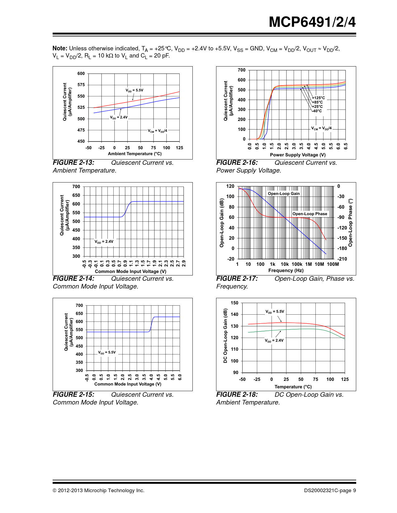 MCP6491/2/4Note: Unless otherwise indicated, T A = +25°C, VDD = +2.4V to +5.5V, VSS = GND, VCM = VDD/2, VOUT VDD/2, VL = VDD/2, RL = 10 kto VL and CL = 20 pF. 700600600575V= 5.5V500DD550400+125°C +85°C525+25°C300-40°Cuiescent Current(µA/Amplifier)V= 2.4Vuiescent Current(µA/Amplifier)Q500DD500Q200475V= V/4V= V/4100CMDDCMDD0450-50-2502550751001250.00.51.01.52.02.53.03.54.04.55.05.56.06.5Ambient Temperature (°C)Power Supply Voltage (V)FIGURE 2-13: Quiescent Current vs. FIGURE 2-16: Quiescent Current vs. Ambient Temperature. Power Supply Voltage. 7001200650Open-Loop Gain100-30600(°)80-60550Open-Loop Phase60-90500(µA/Amplifier)40-120450Quiescent Currentn-Loop Gain (dB)n-Loop Phase40020-150eeV= 2.4VDDOpOp3500-180300-20-2101.0E+001.0E+011.0E+021.0E+031.0E+041.0E+051.0E+061.0E+071.0E+081 10 100 1k 10k 100k 1M 10M 100M-0.5-0.3-0.10.10.30.50.70.91.11.31.51.71.92.12.32.52.72.9Common Mode Input Voltage (V)Frequency (Hz)FIGURE 2-14: Quiescent Current vs. FIGURE 2-17: Open-Loop Gain, Phase vs. Common Mode Input Voltage. Frequency. 150700V= 5.5V650140DD600130550500120V= 2.4VDD(µA/Amplifier) 450Quiescent Currentpen-Loop Gain (dB) 110VV400= 5.5DD350DC O 10030090-0.50.00.51.01.52.02.53.03.54.04.55.05.56.0-50-250255075100125Common Mode Input Voltage (V)Temperature (°C)FIGURE 2-15: Quiescent Current vs. FIGURE 2-18: DC Open-Loop Gain vs. Common Mode Input Voltage. Ambient Temperature. 2012-2013 Microchip Technology Inc. DS20002321C-page 9 Document Outline Package Types Typical Application 1.0 Electrical Characteristics 1.1 Absolute Maximum Ratings 1.2 Specifications 1.3 Test Circuits 2.0 Typical Performance Curves Figure 2-1: Input Offset Voltage Figure 2-2: Input Offset Voltage Drift Figure 2-3: Input Offset Voltage vs. Common Mode Input Voltage Figure 2-4: Input Offset Voltage vs. Common Mode Input Voltage Figure 2-5: Input Offset Voltage vs. Output Voltage Figure 2-6: Input Offset Voltage vs. Power Supply Voltage FIGURE 2-7: Input Noise Voltage Density vs. Frequency. FIGURE 2-8: Input Noise Voltage Density vs. Common Mode Input Voltage. FIGURE 2-9: CMRR, PSRR vs. Frequency. FIGURE 2-10: CMRR, PSRR vs. Ambient Temperature. FIGURE 2-11: Input Bias, Offset Currents vs. Ambient Temperature. FIGURE 2-12: Input Bias Current vs. Common Mode Input Voltage. FIGURE 2-13: Quiescent Current vs. Ambient Temperature. FIGURE 2-14: Quiescent Current vs. Common Mode Input Voltage. FIGURE 2-15: Quiescent Current vs. Common Mode Input Voltage. FIGURE 2-16: Quiescent Current vs. Power Supply Voltage. FIGURE 2-17: Open-Loop Gain, Phase vs. Frequency. FIGURE 2-18: DC Open-Loop Gain vs. Ambient Temperature. FIGURE 2-19: Gain Bandwidth Product, Phase Margin vs. Ambient Temperature. FIGURE 2-20: Gain Bandwidth Product, Phase Margin vs. Ambient Temperature. FIGURE 2-21: Output Short Circuit Current vs. Power Supply Voltage. FIGURE 2-22: Output Voltage Swing vs. Frequency. FIGURE 2-23: Output Voltage Headroom vs. Output Current. FIGURE 2-24: Output Voltage Headroom vs. Output Current. FIGURE 2-25: Output Voltage Headroom vs. Ambient Temperature. FIGURE 2-26: Output Voltage Headroom vs. Ambient Temperature. FIGURE 2-27: Slew Rate vs. Ambient Temperature. FIGURE 2-28: Small Signal Non-Inverting Pulse Response. FIGURE 2-29: Small Signal Inverting Pulse Response. FIGURE 2-30: Large Signal Non-Inverting Pulse Response. FIGURE 2-31: Large Signal Inverting Pulse Response. FIGURE 2-32: The MCP6491/2/4 Shows No Phase Reversal. FIGURE 2-33: Closed Loop Output Impedance vs. Frequency. FIGURE 2-34: Measured Input Current vs. Input Voltage (below VSS). FIGURE 2-35: Channel-to-Channel Separation vs. Frequency (MCP6492/4 only). 3.0 Pin Descriptions TABLE 3-1: Pin Function Table 3.1 Analog Outputs 3.2 Analog Inputs 3.3 Power Supply Pins 3.4 Exposed Thermal Pad (EP) 4.0 Application Information 4.1 Inputs FIGURE 4-1: Simplified Analog Input ESD Structures. FIGURE 4-2: Protecting the Analog Inputs. Figure 4-3: Protecting the Analog Inputs 4.2 Rail-to-Rail Output 4.3 Capacitive Loads FIGURE 4-4: Output Resistor, RISO Stabilizes Large Capacitive Loads. FIGURE 4-5: Recommended RISO Values for Capacitive Loads. 4.4 Supply Bypass 4.5 Unused Op Amps Figure 4-6: Unused Op Amps. Figure 4-7: Example Guard Ring Layout for Inverting Gain 4.6 PCB Surface Leakage 4.7 Application Circuits FIGURE 4-8: Photovoltaic Mode Detector. FIGURE 4-9: Photoconductive Mode Detector. FIGURE 4-10: Second-Order, Low-Pass Butterworth Filter with Sallen-Key Topology. FIGURE 4-11: Second-Order, Low-Pass Butterworth Filter with Multiple-Feedback Topology. FIGURE 4-12: pH Electrode Amplifier. 5.0 Design Aids 5.1 SPICE Macro Model 5.2 FilterLab Software 5.3 MAPS (Microchip Advanced Part Selector) 5.4 Analog Demonstration and Evaluation Boards 5.5 Application Notes 6.0 Packaging Information 6.1 Package Marking Information Appendix A: Revision History Product Identification System Trademarks Worldwide Sales and Service
