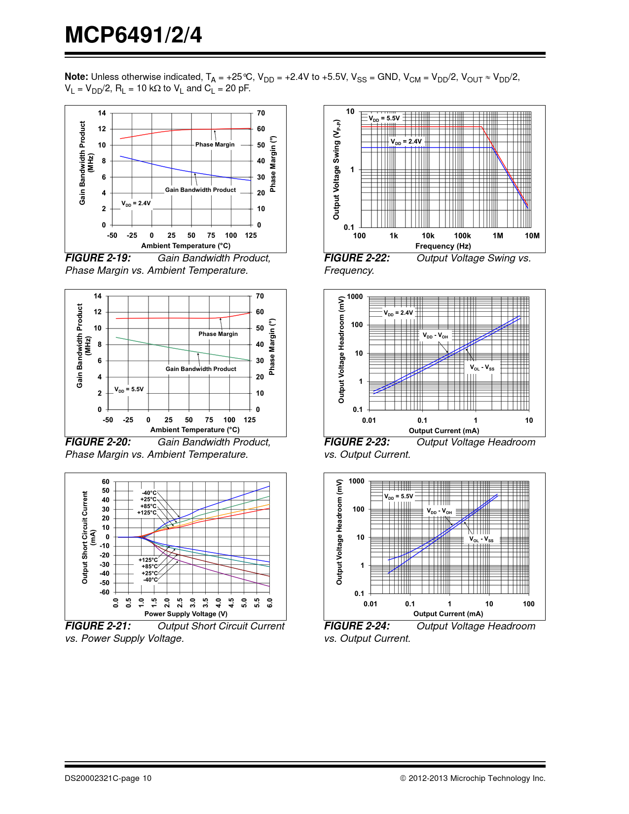MCP6491/2/4Note: Unless otherwise indicated, T A = +25°C, VDD = +2.4V to +5.5V, VSS = GND, VCM = VDD/2, VOUT VDD/2, VL = VDD/2, RL = 10 kto VL and CL = 20 pF. 147010)V= 5.5VDD1260P-PV= 2.4V10Phase Margin50DDing (Vidth Product840Sw(MHz)1630ltagehase Margin (°)Bandwon4Gain BandwBand idthiProduct420P20t VGaiV= 2.4VDD210Outpu000.1-50-250255075100125100100010000100000100000010000000100 1k 10k 100k1M 10MAmbient Temperature (°C)Frequency (Hz)FIGURE 2-19: Gain Bandwidth Product, FIGURE 2-22: Output Voltage Swing vs. Phase Margin vs. Ambient Temperature. Frequency. 147010001260V= 2.4VDDDD1001050Phase MarginV- VDD -DDOHOHidth Product840(MHz)10630Gain Bandwidth Producthase Margin (°)Bandwltage Headroom (mV)V- VOL -OLSSSSnPo4201GaiV= 5.5V2DD10Output V000.1-50-2502550751001250.010.1110Ambient Temperature (°C)Output Current (mA)FIGURE 2-20: Gain Bandwidth Product, FIGURE 2-23: Output Voltage Headroom Phase Margin vs. Ambient Temperature. vs. Output Current. 60100050-40°CV= 5.5V40+25°CDD30+85°C100+125°CV- VDDOH20 10010V- V(mA)OLSS-10hort Circuit Current-20oltage Headroom (mV)S+12512 °5 CV-30+85°C1-40+25°COutput-40°C-50Output-600.10.00.51.01.52.02.53.03.54.04.55.05.56.00.010.1110100Power Supply Voltage (V)Output Current (mA)FIGURE 2-21: Output Short Circuit Current FIGURE 2-24: Output Voltage Headroom vs. Power Supply Voltage. vs. Output Current. DS20002321C-page 10 2012-2013 Microchip Technology Inc. Document Outline Package Types Typical Application 1.0 Electrical Characteristics 1.1 Absolute Maximum Ratings 1.2 Specifications 1.3 Test Circuits 2.0 Typical Performance Curves Figure 2-1: Input Offset Voltage Figure 2-2: Input Offset Voltage Drift Figure 2-3: Input Offset Voltage vs. Common Mode Input Voltage Figure 2-4: Input Offset Voltage vs. Common Mode Input Voltage Figure 2-5: Input Offset Voltage vs. Output Voltage Figure 2-6: Input Offset Voltage vs. Power Supply Voltage FIGURE 2-7: Input Noise Voltage Density vs. Frequency. FIGURE 2-8: Input Noise Voltage Density vs. Common Mode Input Voltage. FIGURE 2-9: CMRR, PSRR vs. Frequency. FIGURE 2-10: CMRR, PSRR vs. Ambient Temperature. FIGURE 2-11: Input Bias, Offset Currents vs. Ambient Temperature. FIGURE 2-12: Input Bias Current vs. Common Mode Input Voltage. FIGURE 2-13: Quiescent Current vs. Ambient Temperature. FIGURE 2-14: Quiescent Current vs. Common Mode Input Voltage. FIGURE 2-15: Quiescent Current vs. Common Mode Input Voltage. FIGURE 2-16: Quiescent Current vs. Power Supply Voltage. FIGURE 2-17: Open-Loop Gain, Phase vs. Frequency. FIGURE 2-18: DC Open-Loop Gain vs. Ambient Temperature. FIGURE 2-19: Gain Bandwidth Product, Phase Margin vs. Ambient Temperature. FIGURE 2-20: Gain Bandwidth Product, Phase Margin vs. Ambient Temperature. FIGURE 2-21: Output Short Circuit Current vs. Power Supply Voltage. FIGURE 2-22: Output Voltage Swing vs. Frequency. FIGURE 2-23: Output Voltage Headroom vs. Output Current. FIGURE 2-24: Output Voltage Headroom vs. Output Current. FIGURE 2-25: Output Voltage Headroom vs. Ambient Temperature. FIGURE 2-26: Output Voltage Headroom vs. Ambient Temperature. FIGURE 2-27: Slew Rate vs. Ambient Temperature. FIGURE 2-28: Small Signal Non-Inverting Pulse Response. FIGURE 2-29: Small Signal Inverting Pulse Response. FIGURE 2-30: Large Signal Non-Inverting Pulse Response. FIGURE 2-31: Large Signal Inverting Pulse Response. FIGURE 2-32: The MCP6491/2/4 Shows No Phase Reversal. FIGURE 2-33: Closed Loop Output Impedance vs. Frequency. FIGURE 2-34: Measured Input Current vs. Input Voltage (below VSS). FIGURE 2-35: Channel-to-Channel Separation vs. Frequency (MCP6492/4 only). 3.0 Pin Descriptions TABLE 3-1: Pin Function Table 3.1 Analog Outputs 3.2 Analog Inputs 3.3 Power Supply Pins 3.4 Exposed Thermal Pad (EP) 4.0 Application Information 4.1 Inputs FIGURE 4-1: Simplified Analog Input ESD Structures. FIGURE 4-2: Protecting the Analog Inputs. Figure 4-3: Protecting the Analog Inputs 4.2 Rail-to-Rail Output 4.3 Capacitive Loads FIGURE 4-4: Output Resistor, RISO Stabilizes Large Capacitive Loads. FIGURE 4-5: Recommended RISO Values for Capacitive Loads. 4.4 Supply Bypass 4.5 Unused Op Amps Figure 4-6: Unused Op Amps. Figure 4-7: Example Guard Ring Layout for Inverting Gain 4.6 PCB Surface Leakage 4.7 Application Circuits FIGURE 4-8: Photovoltaic Mode Detector. FIGURE 4-9: Photoconductive Mode Detector. FIGURE 4-10: Second-Order, Low-Pass Butterworth Filter with Sallen-Key Topology. FIGURE 4-11: Second-Order, Low-Pass Butterworth Filter with Multiple-Feedback Topology. FIGURE 4-12: pH Electrode Amplifier. 5.0 Design Aids 5.1 SPICE Macro Model 5.2 FilterLab Software 5.3 MAPS (Microchip Advanced Part Selector) 5.4 Analog Demonstration and Evaluation Boards 5.5 Application Notes 6.0 Packaging Information 6.1 Package Marking Information Appendix A: Revision History Product Identification System Trademarks Worldwide Sales and Service