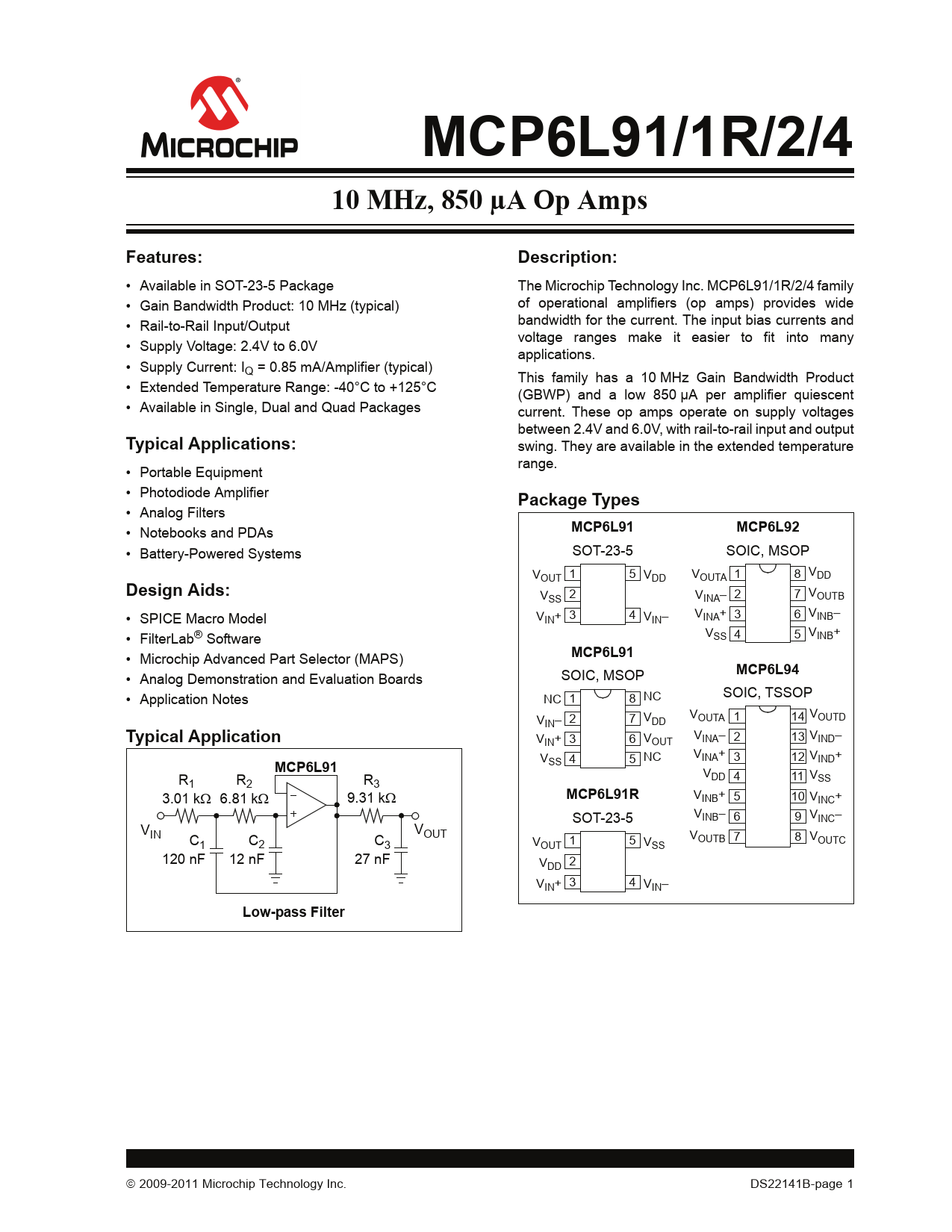 MCP6L91/1R/2/4. 10 MHz, 850 µA Op Amps. Features:. Description:. Typical Applications:. Package Types. MCP6L91. MCP6L92. Design Aids: