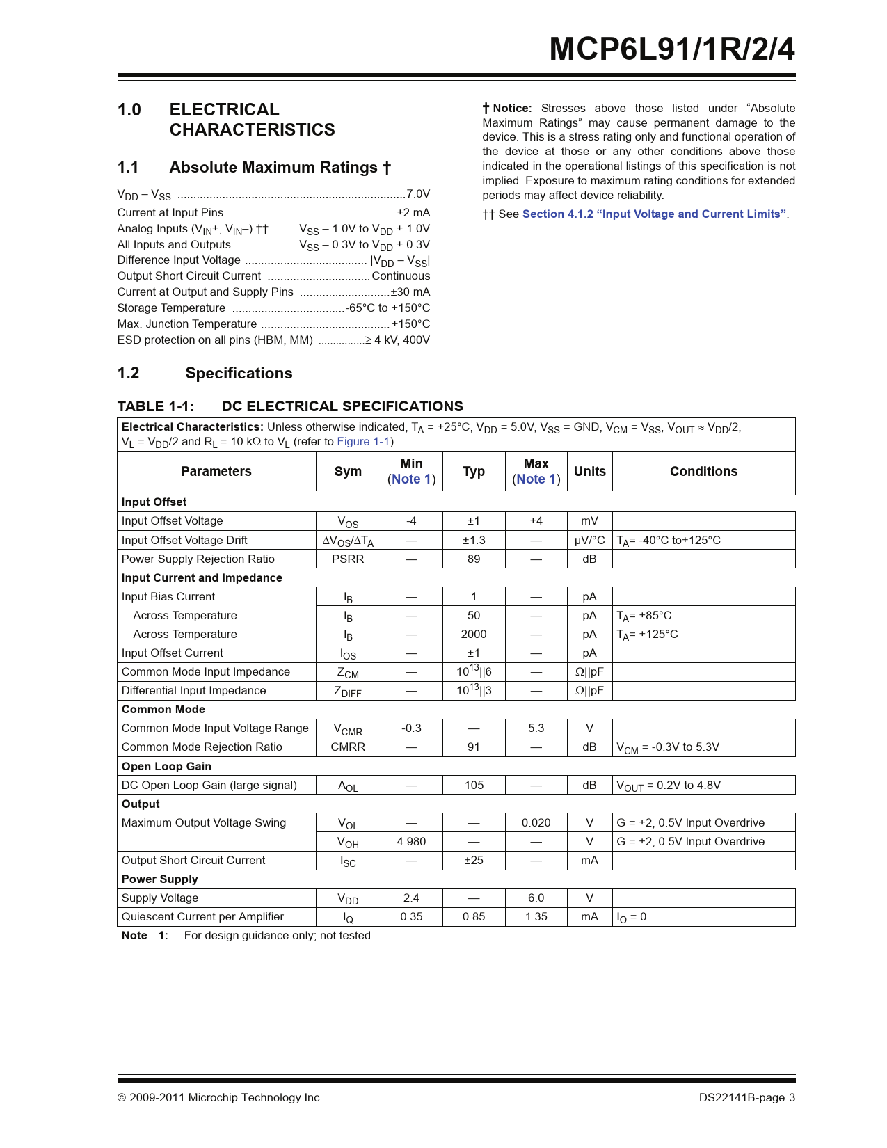 For design guidance only; not tested.  2009-2011 Microchip Technology Inc. DS22141B-page 3 Document Outline 1.0 Electrical Characteristics 1.1 Absolute Maximum Ratings † 1.2 Specifications TABLE 1-1: DC Electrical Specifications TABLE 1-2: AC Electrical Specifications TABLE 1-3: Temperature Specifications 1.3 Test Circuit FIGURE 1-1: AC and DC Test Circuit for Most Specifications. 2.0 Typical Performance Curves FIGURE 2-1: Input Offset Voltage vs. Common Mode Input Voltage at VDD = 2.4V. FIGURE 2-2: Input Offset Voltage vs. Common Mode Input Voltage at VDD = 5.5V. FIGURE 2-3: Input Offset Voltage vs. Output Voltage. FIGURE 2-4: Input Common Mode Range Voltage vs. Ambient Temperature. FIGURE 2-5: CMRR, PSRR vs. Ambient Temperature. FIGURE 2-6: CMRR, PSRR vs. Frequency. FIGURE 2-7: Measured Input Current vs. Input Voltage (below VSS). FIGURE 2-8: Open-Loop Gain, Phase vs. Frequency. FIGURE 2-9: Input Noise Voltage Density vs. Frequency. FIGURE 2-10: The MCP6L91/1R/2/4 Show No Phase Reversal. FIGURE 2-11: Quiescent Current vs. Power Supply Voltage. FIGURE 2-12: Output Short Circuit Current vs. Power Supply Voltage. FIGURE 2-13: Ratio of Output Voltage Headroom to Output Current vs. Output Current. FIGURE 2-14: Small Signal, Noninverting Pulse Response. FIGURE 2-15: Large Signal, Noninverting Pulse Response. FIGURE 2-16: Slew Rate vs. Ambient Temperature. FIGURE 2-17: Output Voltage Swing vs. Frequency. 3.0 Pin Descriptions TABLE 3-1: Pin Function Table 3.1 Analog Outputs 3.2 Analog Inputs 3.3 Power Supply Pins 4.0 Application Information 4.1 Rail-to-Rail Inputs FIGURE 4-1: Protecting the Analog Inputs. 4.2 Rail-to-Rail Output 4.3 Capacitive Loads FIGURE 4-2: Output Resistor, RISO stabilizes large capacitive loads. 4.4 Supply Bypass 4.5 Unused Op Amps FIGURE 4-3: Unused Op Amps. 4.6 PCB Surface Leakage FIGURE 4-4: Example Guard Ring Layout. 4.7 Application Circuit FIGURE 4-5: Chebyshev Filter. 5.0 Design Aids 5.1 SPICE Macro Model 5.2 FilterLab® Software 5.3 Microchip Advanced Part Selector (MAPS) 5.4 Analog Demonstration and Evaluation Boards 5.5 Application Notes 6.0 Packaging Information 6.1 Package Marking Information Appendix A: Revision History Product ID System Trademarks Worldwide Sales